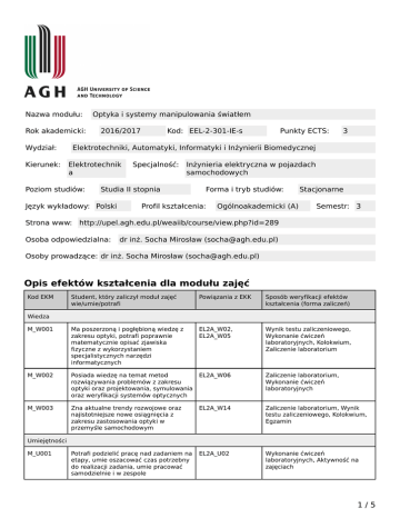 Nazwa modułu: Rok akademicki: Wydział: Kierunek: Optyka i systemy manipulowania światłem 2016/2017 Kod: EEL-2-301-IE-s Punkty ECTS: 3 Elektrotechniki, Automatyki, Informatyki i Inżynierii Biomedycznej Elektrotechnik a Poziom studiów: Specjalność: Inżynieria elektryczna w pojazdach samochodowych Studia II stopnia Język wykładowy: Polski Forma i tryb studiów: Profil kształcenia: Ogólnoakademicki (A) Stacjonarne Semestr: 3 Strona www: http://upel.agh.edu.pl/weaiib/course/view.php?id=289 Osoba odpowiedzialna: dr inż. Socha Mirosław ([email protected]) Osoby prowadzące: dr inż. Socha Mirosław ([email protected]) Opis efektów kształcenia dla modułu zajęć Kod EKM Student, który zaliczył moduł zajęć wie/umie/potrafi Powiązania z EKK Sposób weryfikacji efektów kształcenia (forma zaliczeń) M_W001 Ma poszerzoną i pogłębioną wiedzę z zakresu optyki, potrafi poprawnie matematycznie opisać zjawiska fizyczne z wykorzystaniem specjalistycznych narzędzi informatycznych EL2A_W02, EL2A_W05 Wynik testu zaliczeniowego, Wykonanie ćwiczeń laboratoryjnych, Kolokwium, Zaliczenie laboratorium M_W002 Posiada wiedzę na temat metod rozwiązywania problemów z zakresu optyki oraz projektowania, symulowania oraz weryfikacji systemów optycznych EL2A_W06 Zaliczenie laboratorium, Wykonanie ćwiczeń laboratoryjnych M_W003 Zna aktualne trendy rozwojowe oraz najistotniejsze nowe osiągnięcia z zakresu zastosowania optyki w przemyśle samochodowym EL2A_W14 Zaliczenie laboratorium, Wynik testu zaliczeniowego, Kolokwium, Egzamin Potrafi podzielić pracę nad zadaniem na etapy, umie oszacować czas potrzebny do realizacji zadania, umie pracować samodzielnie i w zespole EL2A_U02 Wykonanie ćwiczeń laboratoryjnych, Aktywność na zajęciach Wiedza Umiejętności M_U001 1/5 Karta modułu - Optyka i systemy manipulowania światłem M_U002 Potrafi dobrze posługiwać się dokumentacją techniczną oraz umie ją tworzyć, potrafi posługiwać się właściwymi technikami graficznej prezentacji danych do realizacji konkretnych zadań EL2A_U01, EL2A_U03, EL2A_U07 Wykonanie ćwiczeń laboratoryjnych, Aktywność na zajęciach EL2A_K01, EL2A_K02 Zaliczenie laboratorium, Wykonanie ćwiczeń laboratoryjnych, Aktywność na zajęciach Kompetencje społeczne M_K001 Potrafi myśleć i działać w sposób kreatywny, potrafi świadomie, poprawnie merytorycznie i w sposób prosty opisać swoje osiągnięcia. Matryca efektów kształcenia w odniesieniu do form zajęć Konwersatori um Zajęcia seminaryjne Zajęcia praktyczne Zajęcia terenowe Zajęcia warsztatowe Ma poszerzoną i pogłębioną wiedzę z zakresu optyki, potrafi poprawnie matematycznie opisać zjawiska fizyczne z wykorzystaniem specjalistycznych narzędzi informatycznych + - + - - - - - - - - M_W002 Posiada wiedzę na temat metod rozwiązywania problemów z zakresu optyki oraz projektowania, symulowania oraz weryfikacji systemów optycznych + - + - - - - - - - - M_W003 Zna aktualne trendy rozwojowe oraz najistotniejsze nowe osiągnięcia z zakresu zastosowania optyki w przemyśle samochodowym + - - - - - - - - - - Potrafi podzielić pracę nad zadaniem na etapy, umie oszacować czas potrzebny do realizacji zadania, umie pracować samodzielnie i w zespole - - + - - - - - - - - E-learning Ćwiczenia projektowe M_W001 Inne Ćwiczenia laboratoryjne Forma zajęć Ćwiczenia audytoryjne Student, który zaliczył moduł zajęć wie/umie/potrafi Wykład Kod EKM Wiedza Umiejętności M_U001 2/5 Karta modułu - Optyka i systemy manipulowania światłem M_U002 Potrafi dobrze posługiwać się dokumentacją techniczną oraz umie ją tworzyć, potrafi posługiwać się właściwymi technikami graficznej prezentacji danych do realizacji konkretnych zadań + - + - - - - - - - - - - + - - - - - - - - Kompetencje społeczne M_K001 Potrafi myśleć i działać w sposób kreatywny, potrafi świadomie, poprawnie merytorycznie i w sposób prosty opisać swoje osiągnięcia. Treść modułu zajęć (program wykładów i pozostałych zajęć) Wykład 1. Wykład wprowadzający, omówienie: tematyki przedmiotu, organizacji laboratorium i programu ćwiczeń laboratoryjnych oraz zasad zaliczenia przedmiotu (1h). Budowa i zadania zmysłu wzroku, postrzeganie jasności, koloru, przestrzeni, zdolność rozróżniania obiektów i pozyskiwania informacji z otoczenia (1h) 2. Percepcja wrażeń wzrokowych przez człowieka: budowa i działanie systemu analizy i interpretacji obrazu, możliwości i ograniczenia układu wzrokowego (2h) 3. Metrologia wielkości optycznych: fotometria, radiometria, kolorymetria; metody wyznaczania dwukierunkowej funkcji rozkładu odbicia (BDRF) oraz fotometrycznej bryły światłości (2h) 4. Podstawy optyki geometrycznej: prawo odbicia i załamania światła (2h) 5. Załamanie i odbicie światła od powierzchni sferycznych (2h) 6. Aberracje układów optycznych, interferencja oraz dyfrakcja światła (2h) 7. Źródła światła: metody wytwarzania światła, właściwości różnych źródeł, zastosowania (2h) 8. Ramy prawne dotyczące wymagań stawianych oświetleniu pojazdów, zasady projektowania i certyfikacji oświetlenia zewnętrznego i wewnętrznego pojazdów (2h) 9. Oświetlenie drogowe oraz pozycyjne pojazdów: zadania stawiane oświetleniu, przegląd stosowanych rozwiązań, zasady i metody projektowania (4h) 10. Podświetlenie deski rozdzielczej i elementów sterujących, przegląd stosowanych metod, zasady i metody projektowania (4h) 11. Pole widzenia kierowcy i kontrola widoczności otoczenia samochodu, systemy wizyjne stosowane w przemyśle motoryzacyjnym (2h) 12. Oświetlenie wnętrza i najbliższego otoczenia samochodu, przegląd stosowanych metod, zasady i metody projektowania (2h) Ćwiczenia laboratoryjne 1. Zajęcia wprowadzające (1h) 2. Podstawy fotometrii i kolorymetrii: projekt i symulacja oświetlenia dla pomieszczenia zamkniętego, dobór rodzaju źródeł światła ich rozmieszczenia oraz rodzaju opraw (3h) 3. P
