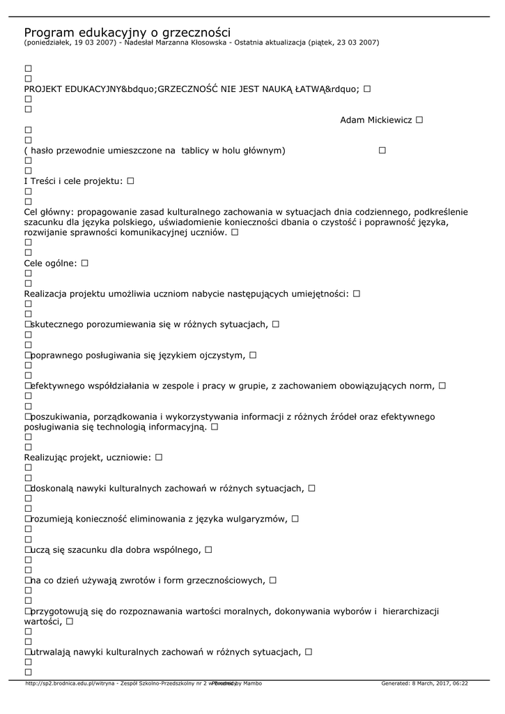 Program edukacyjny o grzeczności (poniedziałek, 19 03 2007) - Nadesłał Marzanna Kłosowska - Ostatnia aktualizacja (piątek, 23 03 2007) PROJEKT EDUKACYJNY„GRZECZNOŚĆ NIE JEST NAUKĄ ŁATWĄ” Adam Mickiewicz ( hasło przewodnie umieszczone na tablicy w holu głównym) I Treści i cele projektu: Cel główny: propagowanie zasad kulturalnego zachowania w sytuacjach dnia codziennego, podkreślenie szacunku dla języka polskiego, uświadomienie konieczności dbania o czystość i poprawność języka, rozwijanie sprawności komunikacyjnej uczniów. Cele ogólne: Realizacja projektu umożliwia uczniom nabycie następujących umiejętności: Ïskutecznego porozumiewania się w różnych sytuacjach, Ïpoprawnego posługiwania się językiem ojczystym, Ïefektywnego współdziałania w zespole i pracy w grupie, z zachowaniem obowiązujących norm, Ïposzukiwania, porządkowania i wykorzystywania informacji z różnych źródeł oraz efektywnego posługiwania się technologią informacyjną. Realizując projekt, uczniowie: Ïdoskonalą nawyki kulturalnych zachowań w różnych sytuacjach, Ïrozumieją konieczność eliminowania z języka wulgaryzmów, Ïuczą się szacunku dla dobra wspólnego, Ïna co dzień używają zwrotów i form grzecznościowych, Ïprzygotowują się do rozpoznawania wartości moralnych, dokonywania wyborów i hierarchizacji wartości, Ïutrwalają nawyki kulturalnych zachowań w różnych sytuacjach, http://sp2.brodnica.edu.pl/witryna - Zespół Szkolno-Przedszkolny nr 2 wPowered Brodnicyby Mambo Generated: 8 March, 2017, 06:22 Ïkształtują postawę dialogu, umiejętność słuchania innych i rozumienia ich poglądów. Cele szczegółowe: W wyniku szeregu działań, uczeń potrafi: Ïkulturalnie zachować w sytuacjach dnia codziennego w szkole i poza nią, Ïstosować najprostsze wyrazy uprzejmości w kontaktach międzyludzkich, Ïakceptuje i naśladuje pozytywne wzorce zachowania: umiejętność prowadzenia rozmowy, uprzejmość, umiejętność słuchania, punktualność, słowność, Ïwyjaśnić, dlaczego nie należy używać wulgarnych słów, Ïwyeliminować wulgaryzmy ze swojego języka, Ïsprawnie posługiwać się słownikami, Ïkulturalnie zachować się przy stole, przyjmować gości, Ïdobrać stosowny ubiór w zależności od okoliczności, Ïkulturalnie kibicować podczas zawodów sportowych, przestrzegać zasad fair play Ïposzukiwać informacji na wybrany temat w różnych źródłach, Ïwspółdziałać w zespole, wspólnie podejmować decyzje, planować i organizować swoją pracę. II Przeznaczenie projektu: Projekt angażuje wszystkich uczniów Szkoły Podstawowej nr 2 Ma charakter interdyscyplinarny. Realizowany na lekcjach różnych przedmiotów, w trakcje różnych działań poza zajęciami i w czasie wolnym uczniów. III Czas realizacji projektu: wrzesień 2006-czerwiec 2007 IV Sposób realizacji: I etap: napisanie projektu II etap: przydzielenie zadań( dla klas pod kierunkiem wychowawców) http://sp2.brodnica.edu.pl/witryna - Zespół Szkolno-Przedszkolny nr 2 wPowered Brodnicyby Mambo Generated: 8 March, 2017, 06:22 III etap: realizacja zadań przez cały rok szkolny( zbieranie punktów za wykonane zadania i zachowanie, wykonanie gazetek, wywieszanie haseł w wyznaczonym miejscu, przeprowadzenie konkursów, przeprowadzenie apeli, zorganizowanie spotkań itp.) IV etap: podsumowanie projektu: ( impreza szkolna, prezentacja prac uczniów , wręczenie nagród, dyplomów, wybór króla i królową dobrych manier itp. WRZESIEŃ –„ Na grzeczność nigdy nie jest za późno” 1. Zapoznanie nauczycieli, uczniów i rodziców z projektem „ Grzeczność nie jest nauką łatwą” Nauczyciele- rada pedagogiczna Uczniowie- apel Rodzice- spotkania z rodzicami 2. Przeprowadzenie „ Banku pomysłów”( zebranie propozycji od nauczycieli, uczniów, rodziców) 3. Wprowadzenie poprawek do projektu 4. Przeprowadzenie ankiety wśród uczniów na temat kultury osobistej uczniów w klasach IV B, V B, VI B- odpowiedzialni za przeprowadzenie wychowawcy, analiza i wnioski z ankiety – odpowiedzialna K. Zacharska 5. Wykonanie przez uczniów( klasy I-VI) haseł klasowych na temat grzeczności ( sentencje, cytaty lub własne pomysły) i gazetek na temat grzecznych zachowań (zadanie jest oceniane przez komisję w składzie: Ï opiekun samorządu uczniowskiego- Z. Olszewska Ï logopeda- M. Chapko, Ï pedagog- A. Kaczerzewska, Ïdwóch przedstawicieli samorządu uczniowskiego Termin wykonania :do końca pierwszego tygodnia października PAŹDZIERNIK – Miesiącem magicznych słów http://sp2.brodnica.edu.pl/witryna - Zespół Szkolno-Przedszkolny nr 2 wPowered Brodnicyby Mambo Generated: 8 March, 2017, 06:22 1.Przeprowadzenie lekcji na temat używania zwrotów grzecznościowych (lekcje do dyspozycji wychowawcy, język polski, język angielski). 2. Przygotowanie scenek propagujących używanie zwrotów grzecznościowych. Scenki przygotowują uczniowie klas V - apel dla klas IV- VI Czas trwania scenek ok. 5 minut . Termin realizacji – ostatni tydzień pąździernika Dla klas I-III apel przygotowuje E. Kupczyk LISTOPAD- Bądź kulturalny na co dzień i od święta „ Mądra głowa grzeczne słowa” czyli rymowanki o grzeczności – wykonanie albumów przez uczniów klas I-III ( może być to praca indywidualna lub grupowa) Odpowiedzialni: E. Jasińska, M. Kaszyńska Co to jest kodeks rycerski?- spotkanie z przedstawicielem Bractwa Rycerskiego w Brodnicy-apel dla klas I -_III, IV -VI odpowiedzialny Cz. Ciechowski Opracowanie Kodeksu Kulturalnego Ucznia Szkoły Podstawowej nr 2- samorząd uczniowski Ï ogłoszenie akcji na apelu Ïrozmowa na lekcjach wychowawczych w klasach IV-VI – zapisanie propozycji uczniów i przekazanie ich Samorządowi Uczniowskiemu, który tworzy z nich Kodeks ÏUmieszczenie Kodeksu na tablicy ogłoszeń i przedstawienie na apelu- samorząd uczniowski 4. Ogłoszenie konkursu na króla i królową dobrych manier( uczniowie klas I-