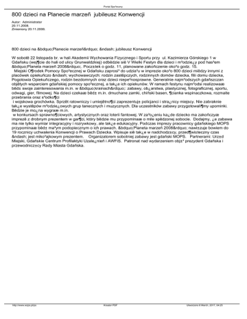 Portal Spo³eczny 800 dzieci na Planecie marzeñ jubileusz Konwencji Autor: Administrator 20.11.2008. Zmieniony 20.11.2008. 800 dzieci na „Planecie marzeñ” – jubileusz Konwencji W sobotê 22 listopada br. w hali Akademii Wychowania Fizycznego i Sportu przy ul. Kazimierza Górskiego 1 w Gdañsku (wej¶cie do hali od ulicy Grunwaldzkiej) odbêdzie siê V Wielki Festyn dla dzieci i m³odzie¿y pod has³em „Planeta marzeñ 2008”. Pocz±tek o godz. 11, planowane zakoñczenie oko³o godz. 15. Miejski O¶rodek Pomocy Spo³ecznej w Gdañsku zaprosi³ do udzia³u w imprezie oko³o 800 dzieci miêdzy innymi z placówek opiekuñczo – wychowawczych: rodzin zastêpczych, rodzinnych domów dziecka, filii domu dziecka, Pogotowia Opiekuñczego, rodzin bezdomnych oraz dzieci niepe³nosprawne. Generalnie najm³odszych gdañszczan objêtych wsparciem gdañskiej pomocy spo³ecznej, a tak¿e ich opiekunów. W ramach festynu najm³odsi realizowaæ bêd± swoje zainteresowania m.in. w „krainach”: zabawy, ob¿arstwa, plastycznej, fotograficznej, sportu, odwagi, gier, filmowej. Na dzieci czekaæ bêd± m.in. dmuchane zamki, chiñski basen, ¶cianka wspinaczkowa, rozmaite przebrania oraz s³odko¶ci i wojskowa grochówka. Sprzêt ratowniczy i umiejêtno¶ci zaprezentuj± policjanci i stra¿nicy miejscy. Nie zabraknie tak¿e wystêpów m³odzie¿owych grup tanecznych i muzycznych. Dla uczestników zabawy przygotowali¶my upominki. Bêdzie je mo¿na wygraæ m.in. w konkursach sprawno¶ciowych, artystycznych oraz loterii fantowej. W za³o¿eniu ka¿de dziecko ma zakoñczyæ imprezê z drobnym prezentem w gar¶ci, który bêdzie mu przypominaæ o mile spêdzonej sobocie. Dodajmy, ¿e zabawa ma nie tylko wymiar integracyjny i rozrywkowy, ale tak¿e edukacyjny. Podczas imprezy pracownicy gdañskiego MOPS przypominaæ bêd± ma³ym podopiecznym o ich prawach. „Planeta marzeñ 2008” nawi±zuje bowiem do 19 rocznicy uchwalenia Konwencji o Prawach Dziecka. Wpisuje siê tak¿e w nadchodz±cy, przed¶wi±teczny czas – jest miko³ajkowym prezentem. Organizatorem sobotniej zabawy jest gdañski MOPS. Partnerami: Urz±d Miejski, Gdañskie Centrum Profilaktyki Uzale¿nieñ i AWFiS. Patronat nad wydarzeniem obj±³ prezydent Gdañska i przewodnicz±cy Rady Miasta Gdañska. http://www.wzps.pl/ps Kreator PDF Utworzono 8 March, 2017, 04:25