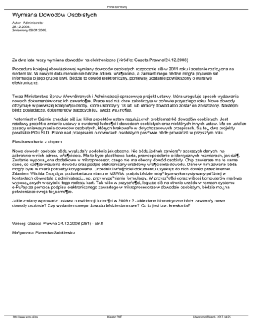 Portal Spo³eczny Wymiana Dowodów Osobistych Autor: Administrator 28.12.2008. Zmieniony 06.01.2009. Za dwa lata ruszy wymiana dowodów na elektroniczne (¼ród³o: Gazeta Prawna/24.12.2008) Procedura kolejnej obowi±zkowej wymiany dowodów osobistych rozpocznie siê w 2011 roku i zostanie roz³o¿ona na siedem lat. W nowym dokumencie nie bêdzie adresu w³a¶ciciela, a zamiast niego bêdzie mog³a pojawiæ siê informacja o jego grupie krwi. Bêdzie to dowód elektroniczny, poniewa¿ zostanie powiêkszony o warstwê elektroniczn±. Teraz Ministerstwo Spraw Wewnêtrznych i Administracji opracowuje projekt ustawy, która ureguluje sposób wydawania nowych dokumentów oraz ich zawarto¶æ. Prace nad ni± chce zakoñczyæ w po³owie przysz³ego roku. Nowe dowody otrzymaj± w pierwszej kolejno¶ci osoby, które ukoñczy³y 18 lat, lub utraci³y dowód albo zosta³ on zniszczony. Nastêpni bêd± posiadacze, dokumentów trac±cych ju¿ swoj± wa¿no¶æ. Natomiast w Sejmie znajduje siê ju¿ kilka projektów ustaw reguluj±cych problematykê dowodów osobistych. Jest rz±dowy projekt o zmianie ustawy o ewidencji ludno¶ci i dowodach osobistych oraz niektórych innych ustaw. Ma on ustaliæ zasady uniewa¿niania dowodów osobistych, których brakowa³o w dotychczasowych przepisach. S± te¿ dwa projekty poselskie PO i SLD. Prace nad przepisami o dowodach osobistych pos³owie bêd± prowadzili w przysz³ym roku. Plastikowa karta z chipem Nowe dowody osobiste bêd± wygl±da³y podobnie jak obecne. Nie bêd± jednak zawiera³y szerszych danych, np. zabraknie w nich adresu w³a¶ciciela. Ma to byæ plastikowa karta, prawdopodobnie o identycznych rozmiarach, jak dzi¶. Zostanie wyposa¿ona dodatkowo w mikroprocesor, czego nie ma obecny dowód osobisty. Chip zawieraæ ma te same dane, co czê¶æ wizualna dowodu oraz podpis elektroniczny urzêdowy w³a¶ciciela dowodu. Dane w nim zawarte bêd± mog³y byæ w miarê potrzeby korygowane. Urzêdnik i w³a¶ciciel dokumentu uzyskaj± do nich dostêp przez internet. Zdaniem Witolda Dro¿d¿a, podsekretarza stanu w MSWiA, podpis bêdzie móg³ byæ wykorzystywany pó¼niej w kontaktach obywatela z administracj±, np. przy wype³nianiu formularzy. W przysz³o¶ci coraz wiêcej komputerów ma byæ wyposa¿anych w czytniki tego rodzaju kart. Tak wiêc w przysz³o¶ci, loguj±c siê na stronie urzêdu w ramach systemu e-Pu³ap za pomoc± podpisu elektronicznego zawartego w mikroprocesorze w dowodzie osobistym, bêdzie mo¿na potwierdziæ swoj± to¿samo¶æ. Jakie zmiany wprowadzi ustawa o ewidencji ludno¶ci w 2009 r.? Jakie dane biometryczne bêd± zawiera³y nowe dowody osobiste? Czy wydanie nowego dowodu bêdzie darmowe? Co to jest tzw. krewkarta? Wiêcej: Gazeta Prawna 24.12.2008 (251) - str.8 Ma³gorzata Piasecka-Sobkiewicz http://www.wzps.pl/ps Kreator PDF Utworzono 8 March, 2017, 04:25