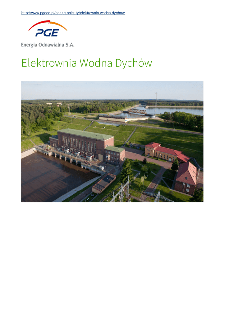 http://www.pgeeo.pl/nasze-obiekty/elektrownia-wodna-dychow Elektrownia Wodna Dychów Miasto: Sobolice Rok uruchomienia: 1936 Moc zainstalowana: 91,3 MW Typ: Szczytowo-pompowa Rzeka/Jezioro: Bóbr, kanał derywacyjny Zespół Elektrowni Wodnych Dychów tworzą obiekty na rzekach Bóbr, Nysa Łużycka i Kwisa. Dominującą rolę odgrywa tu elektrownia szczytowo-pompowa "Dychów". Poza tym jest to 16 małych elektrowni przepływowych. Ich łączna moc wynosi około 20 MW. Dychów wybudowano w latach 1934 - 1936. Jest elektrownią szczytowo-pompową typu derywacyjnego: spiętrzone wody rzeki Bóbr przez jaz w Krzywańcu są prowadzone kanałem (20,4 km) do zbiornika retencyjnego w Dychowie; jego całkowita pojemność wynosi 4 mln metrów sześciennych wody. Elektrownia Wodna Dychów 66-627 Bobrowice Dychów 6a (+48 68) 383 84 77 (+48 68) 383 68 75