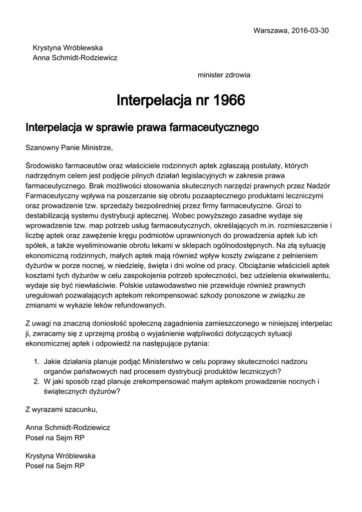 Warszawa, 2016-03-30 Krystyna Wróblewska Anna Schmidt-Rodziewicz minister zdrowia Interpelacja nr 1966 Interpelacja w sprawie prawa farmaceutycznego Szanowny Panie Ministrze, Środowisko farmaceutów oraz właściciele rodzinnych aptek zgłaszają postulaty, których nadrzędnym celem jest podjęcie pilnych działań legislacyjnych w zakresie prawa farmaceutycznego. Brak możliwości stosowania skutecznych narzędzi prawnych przez Nadzór Farmaceutyczny wpływa na poszerzanie się obrotu pozaaptecznego produktami leczniczymi oraz prowadzenie tzw. sprzedaży bezpośredniej przez firmy farmaceutyczne. Grozi to destabilizacją systemu dystrybucji aptecznej. Wobec powyższego zasadne wydaje się wprowadzenie tzw. map potrzeb usług farmaceutycznych, określających m.in. rozmieszczenie i liczbę aptek oraz zawężenie kręgu podmiotów uprawnionych do prowadzenia aptek lub ich spółek, a także wyeliminowanie obrotu lekami w sklepach ogólnodostępnych. Na złą sytuację ekonomiczną rodzinnych, małych aptek mają również wpływ koszty związane z pełnieniem dyżurów w porze nocnej, w niedzielę, święta i dni wolne od pracy. Obciążanie właścicieli aptek kosztami tych dyżurów w celu zaspokojenia potrzeb społeczności, bez udzielenia ekwiwalentu, wydaje się być niewłaściwie. Polskie ustawodawstwo nie przewiduje również prawnych uregulowań pozwalających aptekom rekompensować szkody ponoszone w związku ze zmianami w wykazie leków refundowanych. Z uwagi na znaczną doniosłość społeczną zagadnienia zamieszczonego w niniejszej interpelac ji, zwracamy się z uprzejmą prośbą o wyjaśnienie wątpliwości dotyczących sytuacji ekonomicznej aptek i odpowiedź na następujące pytania: 1. Jakie działania planuje podjąć Ministerstwo w celu poprawy skuteczności nadzoru organów państwowych nad procesem dystrybucji produktów leczniczych? 2. W jaki sposób rząd planuje zrekompensować małym aptekom prowadzenie nocnych i świątecznych dyżurów? Z wyrazami szacunku, Anna Schmidt-Rodziewicz Poseł na Sejm RP Krystyna Wróblewska Poseł na Sejm RP