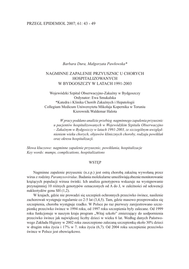 PRZEGL EPIDEMIOL 2007; 61: 43 - 49 Barbara Dura, Małgorzata Pawłowska* NAGMINNE ZAPALENIE PRZYUSZNIC U CHORYCH HOSPITALIZOWANYCH W BYDGOSZCZY W LATACH 1991-2003 Wojewódzki Szpital Obserwacyjno-Zakaźny w Bydgoszczy Ordynator: Ewa Smukalska *Katedra i Klinika Chorób Zakaźnych i Hepatologii Collegium Medicum Uniwersytetu Mikołaja Kopernika w Toruniu Kierownik:Waldemar Halota W pracy poddano analizie przebieg nagminnego zapalenia przyusznic u pacjentów hospitalizowanych w Wojewódzkim Szpitalu Obserwacyjno – Zakaźnym w Bydgoszczy w latach 1991-2003, ze szczególnym uwzględnieniem wieku chorych, objawów klinicznych choroby, rodzaju powikłań oraz okresu hospitalizacji. Słowa kluczowe: nagminne zapalenie przyusznic, powikłania, hospitalizacje Key words: mumps, complications, hospitalizations WSTĘP Nagminne zapalenie przyusznic (n.z.p.) jest ostrą chorobą zakaźną wywołaną przez wirus z rodziny Paramyxoviridae. Badania molekularne umożliwiają obecnie monitorowanie krążących populacji wirusa świnki. Ich analiza genotypowa wskazuje na występowanie przynajmniej 10 różnych genotypów oznaczonych od A do J, w zależności od sekwencji nukleotydów genu SH (1,2). W krajach, gdzie nie prowadzi się szczepień ochronnych przeciwko śwince, nasilenie zachorowań występuje regularnie co 2-5 lat (3,4,5). Tam, gdzie masowo przeprowadza się szczepienia, choroba występuje rzadko. W Polsce po raz pierwszy zarejestrowano szczepionkę przeciwko śwince w 1994 roku, od 1997 roku szczepienia były zalecane. Od 1999 roku funkcjonuje w naszym kraju program „Witaj szkoło” zmierzający do uodpornienia przeciwko śwince jak największej liczby dzieci w wieku 6 lat. Według danych Państwowego Zakładu Higieny w 2002 roku zaszczepiono zalecaną szczepionką około 30% dzieci w drugim roku życia i 17% w 7. roku życia (6,7). Od 2004 roku szczepienie przeciwko śwince w Polsce jest obowiązkowe. 44 B Dura, M Pawłowska Nr 1 W porównaniu z krajami Unii Europejskiej, w ostatnim dziesięcioleciu Polska należy do krajów o najwyższej w Europie zapadalności na świnkę. W latach 1991-2003 rejestrowano tu rocznie od 17 548 do 219 516 zachorowań przy zapadalności od 43,3 do 569,5/100 000. Zapadalność w województwie bydgoskim w roku 1994 wynosiła 810,1/100 000, w 1998 550/100 000, a w 2003 297/100 000. W okresach szczytów epidemicznych zachorowań wskaźnik zapadalności w naszym województwie przewyższał wskaźnik zapadalności w kraju (8). W przebiegu nagminnego zapalenia przyusznic hospitalizuje się około 3-4% chorych (9,10). Do powikłań tej choroby, będących przyczyną hospitalizacji należą: zapalenie opon mózgowo-rdzeniowych (z.o.m.r.), zapalenie trzustki i zapalenie jąder, rzadziej zespół Guillian-Barré, zapalenie mózgu, zapalenie poprzeczne rdzenia, zapalenia nerwów II, VII, VIII oraz zapalenia wielonerwowe (10,11,12). Celem pracy była retrospektywna ocena przebiegu choroby u pacjentów hospitalizowanych z powodu n.z.p. w Wojewódzkim Szpitalu Obserwacyjno – Zakaźnym (WSOZ) im. T. Browicza w Bydgoszczy w latach 1991-2003. Badano również rodzaj powikłań świnki wśród leczonych w szpitalu w poszczególnych latach obserwacji oraz podjęto próbę oceny zmieniających się zasad postępowania w diagnozowaniu i leczeniu świnki. MATERIAŁ I METODY Analizą objęto dane 1185 pacjentów hospitalizowanych z powodu n.z.p. (784 pacjentów płci męskiej i 401 płci żeńskiej) w wieku od 9 miesięcy do 50 lat. Żadna z badanych osób nie była wcześniej zaszczepiona przeciw śwince. Chorych podzielono na 5 grup w zależności od wieku. Do grupy I zaliczono dzieci do 4 roku życia, najczęściej wychowywane w domu. Grupę II stanowiły dzieci w wieku od 5 do 8 lat uczęszczające do przedszkola oraz rozpoczynające naukę szkolną, grupę III dzieci w wieku 9-12 lat, uczniowie III - VI klasy szkoły podstawowej. Do kolejnej grupy IV zaliczono dzieci gimnazjalne oraz szkół średnich, w wieku 13-17 lat, ostatnią grupę utworzyli dorośli. Rozpoznanie choroby stawiano na podstawie objawów klinicznych oraz wywiadu epidemiologicznego. Analizowano liczbę hospitalizacji z powodu świnki w poszczególnych latach, przyczyny hospitalizacji, przebieg kliniczny choroby, zastosowane leczenie oraz długość okresu hospitalizacji. Obliczenia statystyczne wykonano za pomocą programu komputerowego Statistica. Wnioskowanie statystyczne przeprowadzono na poziomie istotności p<0,05. WYNIKI W latach 1991-2003 w WSOZ w Bydgoszczy hospitalizowano 1185 pacjentów z rozpoznaniem n.z.p. Wśród 1108 dzieci było 734 chłopców i 374 dziewczynki, wśród 77 dorosłych 50 mężczyzn i 27 kobiet. W analizowanym okresie zaobserwowano 3 okresy wzrostu liczby hospitalizacji: od marca 1994 do marca 1995, od czerwca 1997 do lipca Nr 1 45 NZP w Bydgoszczy 1998 oraz w roku 2003. Najwyższe liczby pacjentów hospitalizowanych w poszczególnych latach obserwowano w różnych miesiącach: w 1991, 1995 i 1999 najwięcej hospitalizacji wystąpiło w styczniu, w 1994 i 2003 w czerwcu, w 1993 i 2001w lipcu, a w 1997 i 2002 w grudniu (rycina 1). Rycina 1. Liczba hospitalizowanych z powodu nagminnego zapalenia przyusznic w latach 19912003 Fig. 1. Number of hospitalization with mumps in the years in 1991-2003 Liczba pacjentów 60 50 40 30 20 10 0 1991 1992 1993 1994 1995 1996 1997 1998 1999 2000 2001 2002 2003 Wśród hospitalizowanych przeważały dzieci w wieku przedszkolnym i szkolnym, 73% pacjentów stanowiły dzieci między 5 a 12 rokiem życia. W każdej grupie wiekowej zdecydowanie przeważała płeć męska. Przyczyną hospitalizacji było najczęściej zaostrzenie objawów klinicznych przebiegu n.z.p. objawiające się wzrostem gorączki (95%), nudnościami lub wymiotami (84%), bólami głowy (75%) ,bólami brzucha (49%) i osłabieniem. U 80% chorych występował obrzęk ślinianek przyusznych, w tym u 50% obustronny, u 30% jednostronny. U 15% chorych obserwowano obrzęk ślinianek p