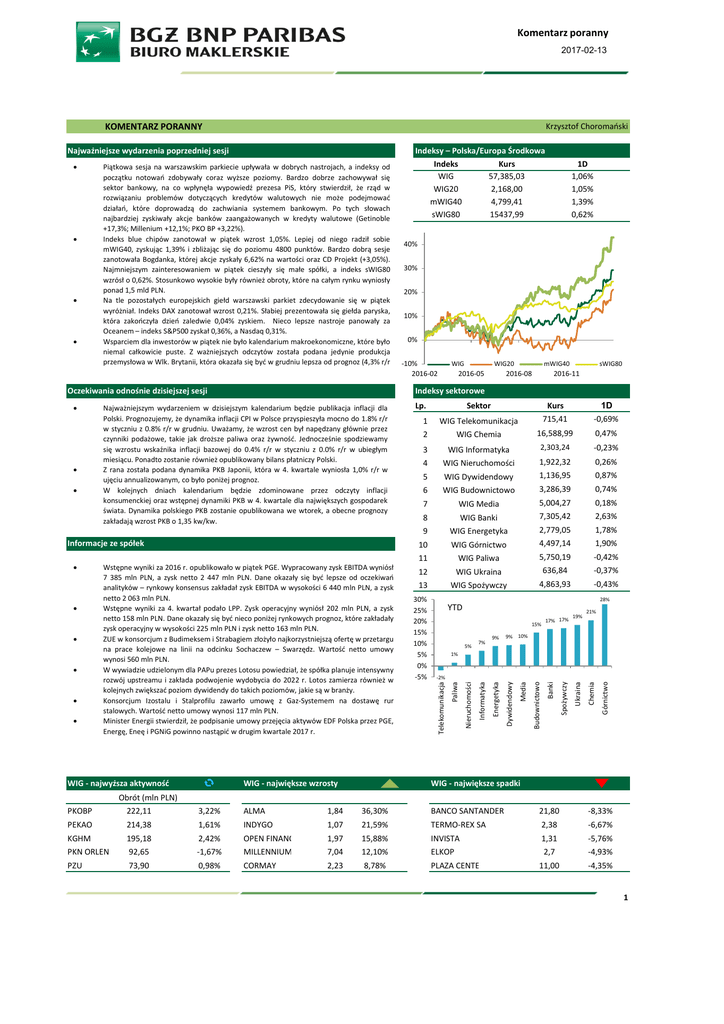 Komentarz poranny 2017-02-13 KOMENTARZ PORANNY Krzysztof Choromański Najważniejsze wydarzenia poprzedniej sesji Oczekiwania odnośnie dzisiejszej sesji WIG - najwyższa aktywność WIG - największe wzrosty Sektor 1D -0,69% 1 WIG Telekomunikacja Kurs 715,41 2 WIG Chemia 16,588,99 0,47% 3 WIG Informatyka 2,303,24 -0,23% 4 WIG Nieruchomości 1,922,32 0,26% 5 WIG Dywidendowy 1,136,95 0,87% 6 WIG Budownictowo 3,286,39 0,74% 7 WIG Media 5,004,27 0,18% 8 WIG Banki 7,305,42 2,63% 9 WIG Energetyka 2,779,05 1,78% 10 WIG Górnictwo 4,497,14 1,90% 11 WIG Paliwa 5,750,19 -0,42% 12 WIG Ukraina 636,84 -0,37% 13 WIG Spożywczy 4,863,93 -0,43% 28% YTD 15% 5% 7% 9% 9% 17% 17% 19% 21% 10% 1% -2% Chemia 30% 25% 20% 15% 10% 5% 0% -5% Górnictwo Wstępne wyniki za 2016 r. opublikowało w piątek PGE. Wypracowany zysk EBITDA wyniósł 7 385 mln PLN, a zysk netto 2 447 mln PLN. Dane okazały się być lepsze od oczekiwań analityków – rynkowy konsensus zakładał zysk EBITDA w wysokości 6 440 mln PLN, a zysk netto 2 063 mln PLN. Wstępne wyniki za 4. kwartał podało LPP. Zysk operacyjny wyniósł 202 mln PLN, a zysk netto 158 mln PLN. Dane okazały się być nieco poniżej rynkowych prognoz, które zakładały zysk operacyjny w wysokości 225 mln PLN i zysk netto 163 mln PLN. ZUE w konsorcjum z Budimeksem i Strabagiem złożyło najkorzystniejszą ofertę w przetargu na prace kolejowe na linii na odcinku Sochaczew – Swarzędz. Wartość netto umowy wynosi 560 mln PLN. W wywiadzie udzielonym dla PAPu prezes Lotosu powiedział, że spółka planuje intensywny rozwój upstreamu i zakłada podwojenie wydobycia do 2022 r. Lotos zamierza również w kolejnych zwiększać poziom dywidendy do takich poziomów, jakie są w branży. Konsorcjum Izostalu i Stalprofilu zawarło umowę z Gaz-Systemem na dostawę rur stalowych. Wartość netto umowy wynosi 117 mln PLN. Minister Energii stwierdził, że podpisanie umowy przejęcia aktywów EDF Polska przez PGE, Energę, Eneę i PGNiG powinno nastąpić w drugim kwartale 2017 r. Lp. Ukraina sWIG80 2016-11 Banki mWIG40 2016-08 Spożywczy WIG20 2016-05 Media WIG Indeksy sektorowe Najważniejszym wydarzeniem w dzisiejszym kalendarium będzie publikacja inflacji dla Polski. Prognozujemy, że dynamika inflacji CPI w Polsce przyspieszyła mocno do 1.8% r/r w styczniu z 0.8% r/r w grudniu. Uważamy, że wzrost cen był napędzany głównie przez czynniki podażowe, takie jak droższe paliwa oraz żywność. Jednocześnie spodziewamy się wzrostu wskaźnika inflacji bazowej do 0.4% r/r w styczniu z 0.0% r/r w ubiegłym miesiącu. Ponadto zostanie również opublikowany bilans płatniczy Polski. Z rana została podana dynamika PKB Japonii, która w 4. kwartale wyniosła 1,0% r/r w ujęciu annualizowanym, co było poniżej prognoz. W kolejnych dniach kalendarium będzie zdominowane przez odczyty inflacji konsumenckiej oraz wstępnej dynamiki PKB w 4. kwartale dla największych gospodarek świata. Dynamika polskiego PKB zostanie opublikowana we wtorek, a obecne prognozy zakładają wzrost PKB o 1,35 kw/kw. Informacje ze spółek -10% 2016-02 Budownictowo 0% Energetyka 10% Dywidendowy 20% Informatyka 30% Paliwa 1D 1,06% 1,05% 1,39% 0,62% 40% Nieruchomości Piątkowa sesja na warszawskim parkiecie upływała w dobrych nastrojach, a indeksy od początku notowań zdobywały coraz wyższe poziomy. Bardzo dobrze zachowywał się sektor bankowy, na co wpłynęła wypowiedź prezesa PiS, który stwierdził, że rząd w rozwiązaniu problemów dotyczących kredytów walutowych nie może podejmować działań, które doprowadzą do zachwiania systemem bankowym. Po tych słowach najbardziej zyskiwały akcje banków zaangażowanych w kredyty walutowe (Getinoble +17,3%; Millenium +12,1%; PKO BP +3,22%). Indeks blue chipów zanotował w piątek wzrost 1,05%. Lepiej od niego radził sobie mWIG40, zyskując 1,39% i zbliżając się do poziomu 4800 punktów. Bardzo dobrą sesje zanotowała Bogdanka, której akcje zyskały 6,62% na wartości oraz CD Projekt (+3,05%). Najmniejszym zainteresowaniem w piątek cieszyły się małe spółki, a indeks sWIG80 wzrósł o 0,62%. Stosunkowo wysokie były również obroty, które na całym rynku wyniosły ponad 1,5 mld PLN. Na tle pozostałych europejskich giełd warszawski parkiet zdecydowanie się w piątek wyróżniał. Indeks DAX zanotował wzrost 0,21%. Słabiej prezentowała się giełda paryska, która zakończyła dzień zaledwie 0,04% zyskiem. Nieco lepsze nastroje panowały za Oceanem – indeks S&P500 zyskał 0,36%, a Nasdaq 0,31%. Wsparciem dla inwestorów w piątek nie było kalendarium makroekonomiczne, które było niemal całkowicie puste. Z ważniejszych odczytów została podana jedynie produkcja przemysłowa w Wlk. Brytanii, która okazała się być w grudniu lepsza od prognoz (4,3% r/r Telekomunikacja Indeksy – Polska/Europa Środkowa Indeks Kurs WIG 57,385,03 WIG20 2,168,00 mWIG40 4,799,41 sWIG80 15437,99 WIG - największe spadki Obrót (mln PLN) PKOBP 222,11 3,22% ALMA 1,84 36,30% BANCO SANTANDER 21,80 -8,33% PEKAO 214,38 1,61% INDYGO 1,07 21,59% TERMO-REX SA 2,38 -6,67% KGHM 195,18 2,42% OPEN FINANCE 1,97 15,88% INVISTA 1,31 -5,76% PKN ORLEN 92,65 -1,67% MILLENNIUM 7,04 12,10% ELKOP 2,7 -4,93% PZU 73,90 0,98% CORMAY 2,23 8,78% PLAZA CENTERS NV 11,00 -4,35% 1 Komentarz poranny NOTOWANIA Z DNIA 10.02.2017 Indeksy – Europa źródło: Bloomberg Indeksy – Świat Europa Niemcy Wlk. Brytania Francja Rosja Turcja Euro Stoxx 50 DAX FTSE 250 CAC40 RTS XU100 3277,79 11642,86 18627,59 4826,24 1163,19 88830,21 -0,21% 0,21% 0,47% 0,04% 0,09% -1,53% USA USA USA Chiny Japonia Brazylia S&P500 DJI NASDAQ Shanghai B-share Nikkei 225 Bovespa 0,36% 0,48% 0,33% 0,63% 0,41% 0,20% 2,307,87 20,172,40 5,715,18 3,216,84 19,459,15 64,964,89 70% 75% 60% 65% 50% 55% 40% 45% 30% 35% 20% 25% 10% 15% 0% 5% -10% -5% 2016-02 DAX XU100 2016-05 CAC40 FTSE250 RTS 2016-08 2016-11 2017-02 Surowce / Metale -20% 2016-02 S&P500 DJIA Shanghai Nikkei 2016-04 2016-06 2016-