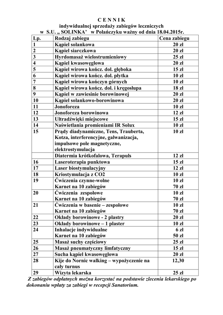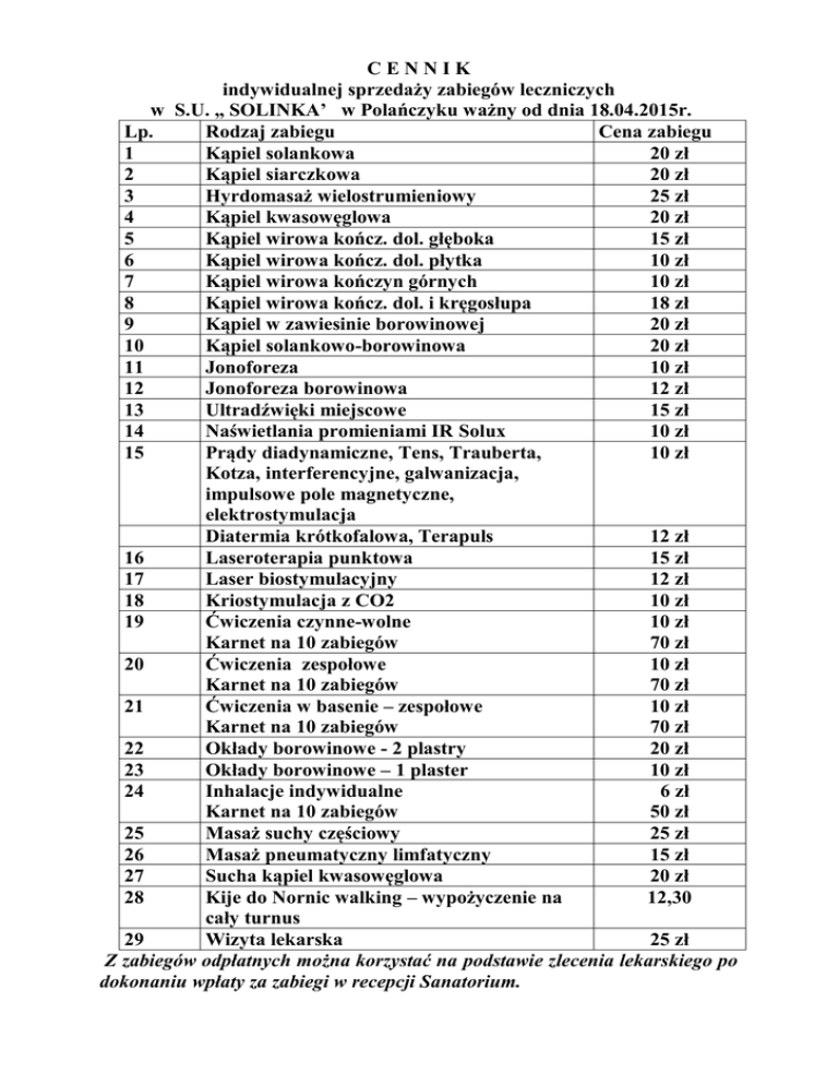 CENNIK indywidualnej sprzedaży zabiegów leczniczych w S.U. „ SOLINKA’ w Polańczyku ważny od dnia 18.04.2015r. Lp. Rodzaj zabiegu Cena zabiegu 1 Kąpiel solankowa 20 zł 2 Kąpiel siarczkowa 20 zł 3 Hyrdomasaż wielostrumieniowy 25 zł 4 Kąpiel kwasowęglowa 20 zł 5 Kąpiel wirowa kończ. dol. głęboka 15 zł 6 Kąpiel wirowa kończ. dol. płytka 10 zł 7 Kąpiel wirowa kończyn górnych 10 zł 8 Kąpiel wirowa kończ. dol. i kręgosłupa 18 zł 9 Kąpiel w zawiesinie borowinowej 20 zł 10 Kąpiel solankowo-borowinowa 20 zł 11 Jonoforeza 10 zł 12 Jonoforeza borowinowa 12 zł 13 Ultradźwięki miejscowe 15 zł 14 Naświetlania promieniami IR Solux 10 zł 15 Prądy diadynamiczne, Tens, Trauberta, 10 zł Kotza, interferencyjne, galwanizacja, impulsowe pole magnetyczne, elektrostymulacja Diatermia krótkofalowa, Terapuls 12 zł 16 Laseroterapia punktowa 15 zł 17 Laser biostymulacyjny 12 zł 18 Kriostymulacja z CO2 10 zł 19 Ćwiczenia czynne-wolne 10 zł Karnet na 10 zabiegów 70 zł 20 Ćwiczenia zespołowe 10 zł Karnet na 10 zabiegów 70 zł 21 Ćwiczenia w basenie – zespołowe 10 zł Karnet na 10 zabiegów 70 zł 22 Okłady borowinowe - 2 plastry 20 zł 23 Okłady borowinowe – 1 plaster 10 zł 24 Inhalacje indywidualne 6 zł Karnet na 10 zabiegów 50 zł 25 Masaż suchy częściowy 25 zł 26 Masaż pneumatyczny limfatyczny 15 zł 27 Sucha kąpiel kwasowęglowa 20 zł 28 Kije do Nornic walking – wypożyczenie na 12,30 cały turnus 29 Wizyta lekarska 25 zł Z zabiegów odpłatnych można korzystać na podstawie zlecenia lekarskiego po dokonaniu wpłaty za zabiegi w recepcji Sanatorium.