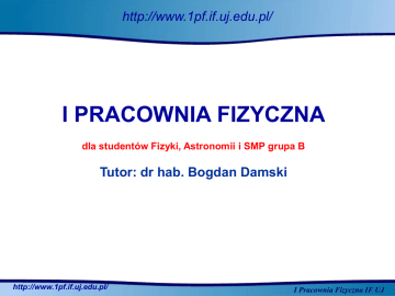 http://www.1pf.if.uj.edu.pl/ I PRACOWNIA FIZYCZNA dla studentów Fizyki, Astronomii i SMP grupa B Tutor: dr hab. Bogdan Damski http://www.1pf.if.uj.edu.pl/ I Pracownia Fizyczna IF UJ Zespół I Pracowni Fizycznej prof. dr hab. Paweł MOSKAL e-mail: [email protected] kierownik I Pracowni Fizycznej Pracownicy techniczno-dydaktyczni : Krystyna Grzelak e-mail: [email protected] inż. Andrzej KACZMARSKI e-mail: [email protected] Janusz KONARSKI e-mail: [email protected] tel. 012 664 47 19 http://www.1pf.if.uj.edu.pl/ I Pracownia Fizyczna IF UJ Kalendarz zajęć FIZYKA B ćwiczenie Lp. Data 1. 24 II 2. 2 III 1 3. 9 III 2 4. 16 III 3 5. 23 III 4 6. 30 III 5 7. 6 IV 6 8. 13 IV 7 9. 20 IV 8 10. 27 IV 9 11. 4V 10 12. 11 V 11 13. 18 V 12 14. 25 V Pracownia wyrównawcza 13 15 1 VI Pracownia wyrównawcza 14 16. 8 VI 17. 10 VI 18. 16 VI Zebranie organizacyjne Sesja letnia 0 środa 11:15-14:15 Tutor: dr hab. Bogdan Damski e-mail: [email protected] Należy wykonać i zaliczyć 12 ćwiczeń Ćwiczenie wyznaczane jest na konkretny dzień zajęć. Ćwiczenia są ogłaszane na stronie internetowej I Pracowni Fizycznej. W przypadku nieobecności studenta na zajęciach wyznaczone na ten dzień ćwiczenie nie czeka na następny tydzień. Otrzymanie wykonanego już ćwiczenia proszę natychmiast zgłosić przez email [email protected] Sprawy zdrowotne: – ograniczenia możliwości wykonywania pewnych ćwiczeń – zwolnienia lekarskie – możliwość przepisania ćwiczeń wykonywanych na innych uczelniach http://www.1pf.if.uj.edu.pl/ I Pracownia Fizyczna IF UJ Po co jest Pracownia Fizyczna? 1. Obserwacja zjawisk i efektów fizycznych. Samodzielne wykonywanie doświadczeń. M21 E5 2. Nauka obsługi prostych i trochę bardziej skomplikowanych przyrządów pomiarowych. 3. Nauka opracowania wyników pomiarów: – nauka poprawnego wyznaczania wielkości fizycznych, – nauka pomiaru zależności fizycznych i ich opisu, – nauka poprawnej prezentacji wyników. http://www.1pf.if.uj.edu.pl/ I Pracownia Fizyczna IF UJ Przed rozpoczęciem pierwszych zajęć w IPF Zapoznać się z: – Regulaminem I Pracowni Fizycznej – Przepisami BHP obowiązującymi podczas wykonywania ćwiczeń w I PF IF UJ. (podpis) – zagadnieniami do przygotowania do wyznaczonego ćwiczenia Przygotować: – na piśmie plan pracy wyznaczonego ćwiczenia (na kartce formatu A4, podpisany imieniem i nazwiskiem) – wypełnioną stronę administracyjną – zeszyt laboratoryjny formatu A4 (80-100 zszytych trwale kartek, ponumerowane strony, podpisany imieniem, nazwiskiem i nr USOS studentki/ta) Odświeżyć znajomość zagadnień związanych z planowaniem pomiarów i opracowaniem wyników, analizą niepewności pomiarowych, sporządzaniem wykresów … http://www.1pf.if.uj.edu.pl/ I Pracownia Fizyczna IF UJ Strona administracyjna imię i nazwisko studenta .................................................................................................................................. numer grupy: ............................................................................................... kierunek: e-mail: .............................. ..................................................... symbol ćwiczenia temat ćwiczenia ................................... data wykonania ćwiczenia ...................................................................................................... asystent prowadzący ćwiczenie Przebieg zaliczania sprawozdania: Data oddania Uwagi sprawdzającego sprawozdanie: sprawozdania do poprawy: ...................................... Data przyjęcia poprawionego sprawozdania: ...................................... Do poprawy sprawozdanie może być oddane tylko 1 raz Ocena za sprawozdanie przed poprawą: . ……………………………. ............................. data podpis osoby zaliczenia sprawozdania zaliczającej Terminowość oddania sprawozdania oraz końcowa ocena za ćwiczenie: ............................................ data przyjęcia sprawozdania i podpis osoby przyjmującej http://www.1pf.if.uj.edu.pl/ ............................................ liczba spóźnień lub data regulaminowego oddania sprawozdania ocena końcowa za ćwiczenie (bez obniżenia za spóźnienia) I Pracownia Fizyczna IF UJ Przebieg zajęć w I PF ☼ Do Pracowni należy przyjść punktualnie. Kurtki i duże torby należy zostawić w szatni. ☼ Dopuszczenie do wykonywania ćwiczenia; należy posiadać: • zeszyt laboratoryjny (A4, 100 kartek, numerowane kartki, podpisany, nr. USOS studenta) • stronę administracyjną wykonywanego ćwiczenia. • plan pracy na piśmie (który jest częścią sprawozdania) pozytywny wynik pisemnego (10-15min) kolokwium wstępnego ☼ Przygotowanie stanowiska do wykonania pomiarów, w tym wypożyczenie (na legitymację) wyposażenia dodatkowego np. suwmiarka, stoper, mierniki uniwersalne… urządzenia elektryczne i zbudowane własnoręcznie obwody elektryczne student włącza do sieci tylko w obecności i za zgodą asystenta ☼ Przystąpienie do wykonania pomiarów. Wyniki pomiarów należy zapisywać w zeszycie laboratoryjnym długopisem lub piórem. opuszczenie terenu Pracowni w czasie trwania zajęć jest dozwolone tylko za zgodą asystenta ☼ Po zakończeniu pomiarów należy: • oddać wypożyczone przyrządy, • uporządkować stanowisko pracy, • uzyskać podpis asystenta w zeszycie laboratoryjnym http://www.1pf.if.uj.edu.pl/ I Pracownia Fizyczna IF UJ Proces zaliczania ćwiczenia Wydział: imię i nazwisko studenta ……………………………………… .................................................................................................................................. numer grupy: .............................. ............................................................................................... kierunek: ..................................................... e-mail: symbol ćwiczenia temat ćwiczenia ................................... data wyko