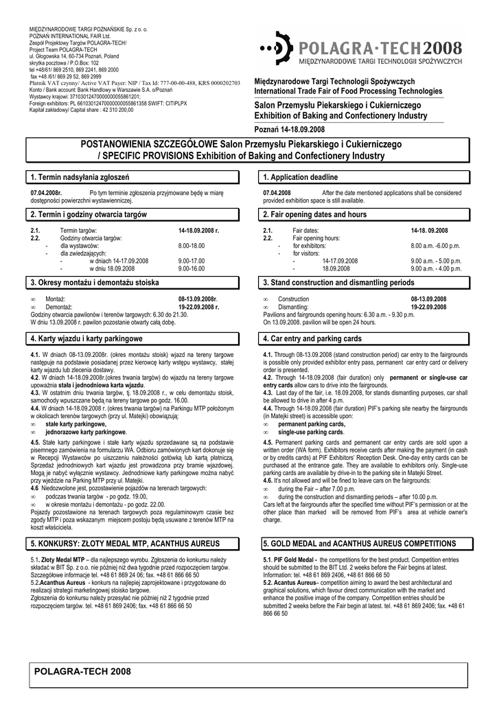 MIĘDZYNARODOWE TARGI POZNAŃSKIE Sp. z o. o. POZNAŃ INTERNATIONAL FAIR Ltd. Zespół Projektowy Targów POLAGRA-TECH/ Project Team POLAGRA-TECH ul. Głogowska 14, 60-734 Poznań, Poland skrytka pocztowa / P.O.Box: 102 tel +48/61/ 869 2510, 869 2241, 869 2000 fax +48 /61/ 869 29 52, 869 2999 Płatnik VAT czynny/ Active VAT Payer: NIP / Tax Id: 777-00-00-488, KRS 0000202703 Konto / Bank account: Bank Handlowy w Warszawie S.A. o/Poznań Wystawcy krajowi: 37103012470000000055861201; Foreign exhibitors: PL 66103012470000000055861358 SWIFT: CITIPLPX Kapitał zakładowy/ Capital share : 42 310 200,00 Międzynarodowe Targi Technologii SpoŜywczych International Trade Fair of Food Processing Technologies ---------------------------------------------------------------------------------------------------------------------------------------------------------------------------------------------------------------- Salon Przemysłu Piekarskiego i Cukierniczego Exhibition of Baking and Confectionery Industry ---------------------------------------------------------------------------------------------------------------------------------------------------------------------------------------------------------------- Poznań 14-18.09.2008 POSTANOWIENIA SZCZEGÓŁOWE Salon Przemysłu Piekarskiego i Cukierniczego / SPECIFIC PROVISIONS Exhibition of Baking and Confectionery Industry 1. Termin nadsyłania zgłoszeń 1. Application deadline 07.04.2008r. Po tym terminie zgłoszenia przyjmowane będę w miarę dostępności powierzchni wystawienniczej. 07.04.2008 After the date mentioned applications shall be considered provided exhibition space is still available. 2. Termin i godziny otwarcia targów 2. Fair opening dates and hours 2.1. 2.2. - Termin targów: Godziny otwarcia targów: dla wystawców: dla zwiedzających: w dniach 14-17.09.2008 w dniu 18.09.2008 14-18.09.2008 r. 8.00-18.00 9.00-17.00 9.00-16.00 2.1. 2.2. - Fair dates: Fair opening hours: for exhibitors: for visitors: 14-17.09.2008 18.09.2008 14-18. 09.2008 8.00 a.m. -6.00 p.m. 9.00 a.m. - 5.00 p.m. 9.00 a.m. - 4.00 p.m. 3. Okresy montaŜu i demontaŜu stoiska 3. Stand construction and dismantling periods • MontaŜ: 08-13.09.2008r. • DemontaŜ: 19-22.09.2008 r. Godziny otwarcia pawilonów i terenów targowych: 6.30 do 21.30. W dniu 13.09.2008 r. pawilon pozostanie otwarty całą dobę. • Construction 08-13.09.2008 • Dismantling: 19-22.09.2008 Pavilions and fairgrounds opening hours: 6.30 a.m. - 9.30 p.m. On 13.09.2008. pavilion will be open 24 hours. 4. Karty wjazdu i karty parkingowe 4. Car entry and parking cards 4.1. W dniach 08-13.09.2008r. (okres montaŜu stoisk) wjazd na tereny targowe następuje na podstawie posiadanej przez kierowcę karty wstępu wystawcy, stałej karty wjazdu lub zlecenia dostawy. 4.2. W dniach 14-18.09.2008r.(okres trwania targów) do wjazdu na tereny targowe upowaŜnia stała i jednodniowa karta wjazdu. 4.3. W ostatnim dniu trwania targów, tj. 18.09.2008 r., w celu demontaŜu stoisk, samochody wpuszczane będą na tereny targowe po godz. 16.00. 4.4. W dniach 14-18.09.2008 r. (okres trwania targów) na Parkingu MTP połoŜonym w okolicach terenów targowych (przy ul. Matejki) obowiązują: • stałe karty parkingowe, • jednorazowe karty parkingowe. 4.1. Through 08-13.09.2008 (stand construction period) car entry to the fairgrounds is possible only provided exhibitor entry pass, permanent car entry card or delivery order is presented. 4.2. Through 14-18.09.2008 (fair duration) only permanent or single-use car entry cards allow cars to drive into the fairgrounds. 4.3. Last day of the fair, i.e. 18.09.2008, for stands dismantling purposes, car shall be allowed to drive in after 4 p.m. 4.4. Through 14-18.09.2008 (fair duration) PIF’s parking site nearby the fairgrounds (in Matejki street) is accessible upon: • permanent parking cards, • single-use parking cards. 4.5. Stałe karty parkingowe i stałe karty wjazdu sprzedawane są na podstawie pisemnego zamówienia na formularzu WA. Odbioru zamówionych kart dokonuje się w Recepcji Wystawców po uiszczeniu naleŜności gotówką lub kartą płatniczą. SprzedaŜ jednodniowych kart wjazdu jest prowadzona przy bramie wjazdowej. Mogą je nabyć wyłącznie wystawcy. Jednodniowe karty parkingowe moŜna nabyć przy wjeździe na Parking MTP przy ul. Matejki. 4.6 Niedozwolone jest, pozostawienie pojazdów na terenach targowych: • podczas trwania targów - po godz. 19.00, • w okresie montaŜu i demontaŜu - po godz. 22.00. Pojazdy pozostawione na terenach targowych poza regulaminowym czasie bez zgody MTP i poza wskazanym miejscem postoju będą usuwane z terenów MTP na koszt właściciela. 4.5. Permanent parking cards and permanent car entry cards are sold upon a written order (WA form). Exhibitors receive cards after making the payment (in cash or by credits cards) at PIF Exhibitors’ Reception Desk. One-day entry cards can be purchased at the entrance gate. They are available to exhibitors only. Single-use parking cards are available by drive-in to the parking site in Matejki Street. 4.6. It’s not allowed and will be fined to leave cars on the fairgrounds: • during the Fair – after 7.00 p.m. • during the construction and dismantling periods – after 10.00 p.m. Cars left at the fairgrounds after the specified time without PIF’s permission or at the other place than marked will be removed from PIF’s area at vehicle owner’s charge. 5. KONKURSY: ZŁOTY MEDAL MTP, ACANTHUS AUREUS 5. GOLD MEDAL and ACANTHUS AUREUS COMPETITIONS 5.1. Złoty Medal MTP – dla najlepszego wyrobu. Zgłoszenia do konkursu naleŜy składać w BIT Sp. z o.o. nie później niŜ dwa tygodnie przed rozpoczęciem targów. Szczegółowe informacje tel. +48 61 869 24 06; fax. +48 61 866 66 50 5.2.Acanthus Aureus - konkurs na najlepiej zaprojektowane i przygotowane do realizacji strategii marketingowej stoisko targowe. Zgłoszenia do konkursu naleŜy przesyłać nie później niŜ