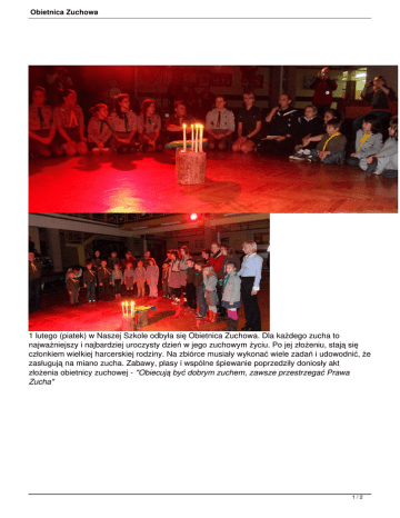 Obietnica Zuchowa 1 lutego (piatek) w Naszej Szkole odbyła się Obietnica Zuchowa. Dla każdego zucha to najważniejszy i najbardziej uroczysty dzień w jego zuchowym życiu. Po jej złożeniu, stają się członkiem wielkiej harcerskiej rodziny. Na zbiórce musiały wykonać wiele zadań i udowodnić, że zasługują na miano zucha. Zabawy, plasy i wspólne śpiewanie poprzedziły doniosły akt złożenia obietnicy zuchowej - "Obiecują być dobrym zuchem, zawsze przestrzegać Prawa Zucha" 1/2 Obietnica Zuchowa Trzymamy kciuki za nasze zuszki. Czuj! Czuwaj! 2/2