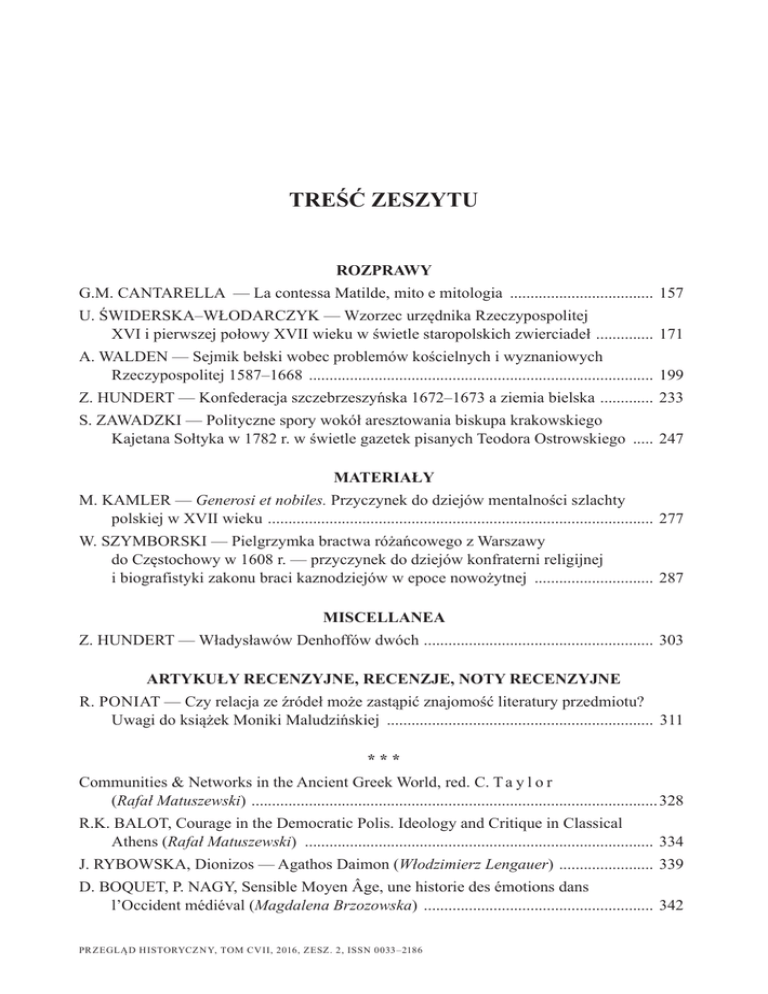 TREŚĆ ZESZYTU ROZPRAWY G.M. CANTARELLA — La contessa Matilde, mito e mitologia .................................... 157 U. ŚWIDERSKA–WŁODARCZYK — Wzorzec urzędnika Rzeczypospolitej XVI i pierwszej połowy XVII wieku w świetle staropolskich zwierciadeł ............... 171 A. WALDEN — Sejmik bełski wobec problemów kościelnych i wyznaniowych Rzeczypospolitej 1587–1668 ..................................................................................... 199 Z. HUNDERT — Konfederacja szczebrzeszyńska 1672–1673 a ziemia bielska .............. 233 S. ZAWADZKI — Polityczne spory wokół aresztowania biskupa krakowskiego Kajetana Sołtyka w 1782 r. w świetle gazetek pisanych Teodora Ostrowskiego ...... 247 MATERIAŁY M. KAMLER — Generosi et nobiles. Przyczynek do dziejów mentalności szlachty polskiej w XVII wieku ............................................................................................... 277 W. SZYMBORSKI — Pielgrzymka bractwa różańcowego z Warszawy do Częstochowy w 1608 r. — przyczynek do dziejów konfraterni religijnej i biografistyki zakonu braci kaznodziejów w epoce nowożytnej .............................. 287 MISCELLANEA Z. HUNDERT — Władysławów Denhoffów dwóch ......................................................... 303 ARTYKUŁY RECENZYJNE, RECENZJE, NOTY RECENZYJNE R. PONIAT — Czy relacja ze źródeł może zastąpić znajomość literatury przedmiotu? Uwagi do książek Moniki Maludzińskiej .................................................................. 311 *** Communities & Networks in the Ancient Greek World, red. C. T a y l o r (Rafał Matuszewski) .................................................................................................... 328 R.K. BALOT, Courage in the Democratic Polis. Ideology and Critique in Classical Athens (Rafał Matuszewski) ...................................................................................... 334 J. RYBOWSKA, Dionizos — Agathos Daimon (Włodzimierz Lengauer) ........................ 339 D. BOQUET, P. NAGY, Sensible Moyen Âge, une historie des émotions dans l’Occident médiéval (Magdalena Brzozowska) ......................................................... 342 PR ZEGLĄD HISTORYCZNY, TOM CVII, 2016, ZESZ. 2, ISSN 0033–2186 366 SPIS TREŚCI A. LIS, Prawne uwarunkowania funkcjonowania rodziny w świetle wybranych źródeł polskich do 1320 (Aneta Pieniądz) ................................................................. 347 A. PROSPERI, Delitto e perdono. La pena di morte nell’orizzonte mentale dell’Europa cristiana. XIV–XVIII secolo (Wojciech Tygielski) ................................. 354 S. SUŁECKI, Księgozbiór klasztoru karmelitów na Piasku w Krakowie (Piotr Kardyś)............................................................................................................. 357 R. ŠIMŮNEK, Reprezentace české středověké šlechty (Wojciech Iwańczak)................... 360 SPROSTOWANIE ............................................................................................................. 368 TABLE OF CONTENTS ARTICLES G. M. CANTARELLA — Matilda of Tuscany — A Myth and Mythology...................... 157 U. ŚWIDERSKA–WŁODARCZYK — A Model of the Commonwealth Official in the Sixteenth and Seventeenth Century in the Light of the Old–Polish Speculum Literature ................................................................................................... 171 A. WALDEN — Sejmik of Bełz Voivodeship vs Church and Confessional. Problems in the Polish-Lithuanian Commonwealth, 1587–1668 .............................. 199 Z. HUNDERT — Szczebrzeszyn Confederation 1672–1673 and the Bielsk Land ........... 233 S. ZAWADZKI — Political Controversies over the Arrest of Cracow Bishop Kajetan Sołtyk in 1782 in the Light of Teodor Ostrowski’s Handwritten News–Sheets .............................................................................................................. 247 MATERIALS M. KAMLER — Generosi et Nobiles. A Contribution to the History of mentality of the Polish Nobility in the Seventeenth Century ..................................................... 277 W. SZYMBORSKI — A Pilgrimage of the Confraternity of the Holy Rosary from Warsaw to Częstochowa in 1608 – A Contribution to the History of the Religious Confraternity and Biographies of the Order of Preachers in the Early Modern Period ........................................................................................ 287 MISCELLANEA Z. HUNDERT — Two Władysławs Denhoffs ................................................................... 303 REVIEWS CORRECTION .................................................................................................................. 368 PR ZEGLĄD HISTORYCZNY, TOM CVII, 2016, ZESZ. 2, ISSN 0033–2186