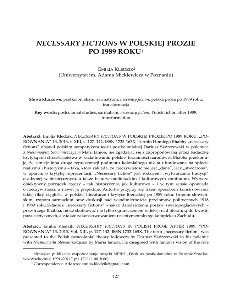 Emilia Kledzik, Necessary fictions w polskiej prozie po 1989 roku NECESSARY FICTIONS W POLSKIEJ PROZIE PO 1989 ROKU1 EMILIA KLEDZIK2 (Uniwersytet im. Adama Mickiewicza w Poznaniu) Słowa kluczowe: postkolonializm, sarmatyzm, necessary fiction, polska proza po 1989 roku, transformacja Key words: postcolonial studies, sarmatism, necessary fiction, Polish fiction after 1989, transformation Abstrakt: Emilia Kledzik, NECESSARY FICTIONS W POLSKIEJ PROZIE PO 1989 ROKU. „PORÓWNANIA” 13, 2013, t. XIII, s. 127–142. ISSN 1733-165X. Termin Homiego Bhabhy „necessary fictions” objawił polskim sympatykom teorii postkolonialnej Dariusz Skórczewski w polemice z Niesamowitą Słowiańszczyzną Marii Janion, nie zgadzając się z zaproponowaną przez badaczkę krytyką roli chrześcijaństwa w kształtowaniu polskiej tożsamości narodowej. Bhabha przekonuje, że istnieje inna droga reprezentacji podmiotu kolonialnego niż ta ufundowana na splocie realizmu i historyzmu – taka, która zakłada, że rzeczywistość nie jest „dana”, lecz „stworzona”, w oparciu o krytykę reprezentacji. „Necessary fiction” jest rodzajem „wytwarzania tradycji” osadzonej w historycznym, a także historycznoliterackim i kulturowym continuum. Wytycza obiektywny porządek rzeczy – tak historycznie, jak kulturowo – i w tym sensie opowiada o rzeczywistości, a nawet ją projektuje. Autorka przyjrzy się trzem sposobom konstruowania takiej fikcji ciągłości w polskiej literaturze i krytyce literackiej po 1989 roku: tropom słowiańskim, tropom sarmackim oraz dyskusji nad współmiernością przełomów politycznych 1918 i 1989 roku.Składnik „necessary fictions” –nakaz dziedziczenia postaw światopoglądowych – przestrzega Bhabha, może skutkować nie tylko ograniczeniem refleksji nad literaturą do kwestii pozaestetycznych, ale także zakonserwowaniem resentymentalnego kompleksu Zachodu. Abstract: Emilia Kledzik, NECESSARY FICTIONS IN POLISH PROSE AFTER 1989. “PORÓWNANIA” 13, 2013, Vol. XIII, p. 127–142. ISSN 1733-165X. The term „necessary fiction” was presented to the Polish postcolonial theory followers by Dariusz Skórczewski in his polemic with Niesamowita Słowiańszczyzna by Maria Janion. He disagreed with Janion's vision of the role ________________ 1 Niniejsza publikacja współrealizuje projekt NPRH „Dyskurs postkolonialny w Europie Środkowo-Wschodniej 1991–2011” (nr 12H 11 0018 80). 2 Correspondence Address: [email protected] 127 PORÓWNANIA 13, 2013 of Christianity in forming the Polish national identity. Bhabha argues that there is another way of presenting the postcolonial subject than the one founded on the combination of realism and historicism– the one, that assumes reality as given, but created on the basis of the criticism of representation. Necessary fiction is a way of „creating the tradition” based on historical, literary historical and cultural continuity. It shows the objective order of things – historically and culturally – and in this way it describes the reality and even designs it. The author observes three way of constructing such a fiction of continuity in the Polish prose and literary criticism after 1989: the Slavonic trail, the Sarmatian trail and the discussion about the similarities between political breakthroughs of 1918 and 1989. Bhabha warns that the component of „necessary fictions” – the imperative to pass down the values – may result not only with limiting literary criticism to nonaesthetic questions, but also with preserving the resentimental, Western complex. Historia „necessary fictions” w polskim dyskursie humanistycznym nie jest skomplikowana. Terminu – autorstwa Homiego Bhabhy –w rodzimej debacie postkolonialnej pierwszy raz użył Dariusz Skórczewski w polemice z Niesamowitą Słowiańszczyzną Marii Janion, opublikowanej w 2008 roku na łamach „Porównań” Lubelski badacz, nie zgadzając się z zaproponowaną przez Janion krytyką roli chrześcijaństwa w kształtowaniu polskiej tożsamości narodowej, pisał: Niesamowitą Słowiańszczyznę można uznać za swoisty, wysublimowany przejaw tego, co Homi Bhabha nazwał „necessary fictions”– postkolonialnej potrzeby wymyślania mitów w celu utwierdzenia się w swojej podmiotowości i umocnienia przez to swojej autochtonii3. W niedawno wydanej rozprawie pt. Teoria – literatura – dyskurs. Pejzaż postkolonialny ten sam uczony, postulując konieczność ponownego przemyślenia dziedzictwa romantycznego, zaproponował opozycję pomiędzy pozytywnie wartościowanymi „mitami źródłowymi”, w stronę których podąża szeroko pojęta myśl romantyczna, a resentymentalną „necessary fiction” mesjanizmu. Takimi „koniecznymi fikcjami/narracjami” – pisze Skórczewski – „karmią się wszystkie społeczeństwa kolonialne, dopóki nie uporają się z psychologicznymi residuami obcej hegemonii i własnego upodrzędnienia”4. Literackie i krytycznoliterackie pozorne spojrzenie wstecz maskuje więc faktyczny konstrukt, jakim jest narracja o funkcji kompensacyjnej. Zadanie mitu źródłowego stanowi zaś nie tyle zaleczenie kolonialnej zadry, ale ufundowanie „podmiotu narodowego” na tle innych rodzących się wspólnotowych dyskursów tożsamościowych5. ________________ 3 D. Skórczewski, Trudności z tożsamością. Na marginesie Niesamowitej Słowiańszczyzny. „Porównania” 2008, nr 5, s. 140. 4 D. Skórczewski, Teoria – literatura – dyskurs. Pejzaż postkolonialny. Lublin 2013, s. 192 5 Ibidem, s. 139. 128 Emilia Kledzik, Necessary fictions w polskiej prozie po 1989 roku Czy taka opozycja może się obronić? Czy konstruowanie historii w narracjach społeczeństw postkolonialnych obligatoryjnie nie wiąże się ze swoistą „koniecznością” wskazania na historyczną ciągłość, która zadośćuczynić ma czas, kiedy narracja dominująca tworzyła inną opowieść, będącą legitymizacją zawłaszczenia? Czy prob