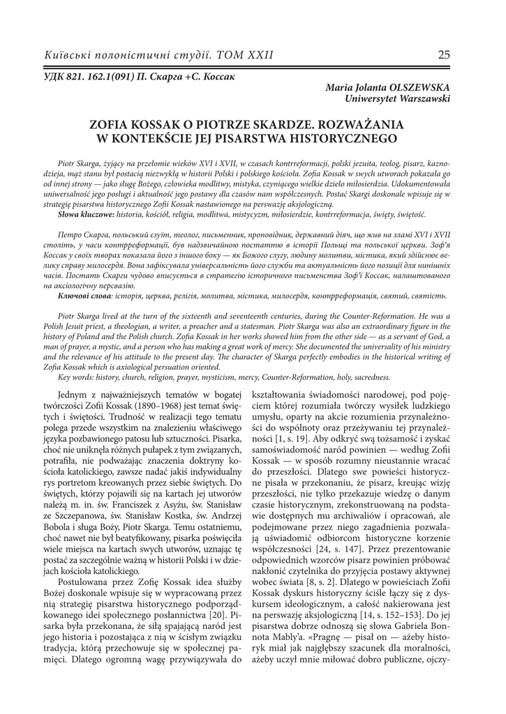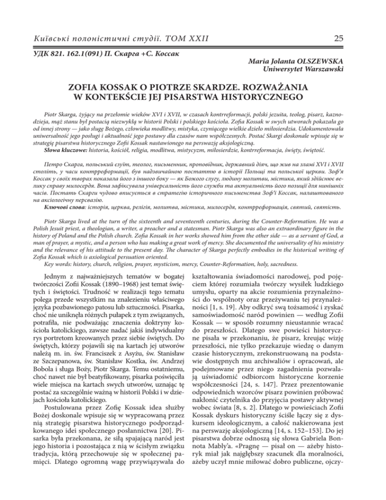 25 Київські полоністичні студії. ТОМ XХІІ УДК 821. 162.1(091) П. Скарга +С. Коссак Maria Jolanta OLSZEWSKA Uniwersytet Warszawski ZOFIA KOSSAK O PIOTRZE SKARDZE. ROZWAŻANIA W KONTEKŚCIE JEJ PISARSTWA HISTORYCZNEGO Piotr Skarga, żyjący na przełomie wieków XVI i XVII, w czasach kontrreformacji, polski jezuita, teolog, pisarz, kaznodzieja, mąż stanu był postacią niezwykłą w historii Polski i polskiego kościoła. Zofia Kossak w swych utworach pokazała go od innej strony — jako sługę Bożego, człowieka modlitwy, mistyka, czyniącego wielkie dzieło miłosierdzia. Udokumentowała uniwersalność jego posługi i aktualność jego postawy dla czasów nam współczesnych. Postać Skargi doskonale wpisuje się w strategię pisarstwa historycznego Zofii Kossak nastawionego na perswazję aksjologiczną. Słowa kluczowe: historia, kościół, religia, modlitwa, mistycyzm, miłosierdzie, kontrreformacja, święty, świętość. Петро Скарга, польський єзуїт, теолог, письменник, проповідник, державний діяч, що жив на зламі XVI i XVII століть, у часи контрреформації, був надзвичайною постаттю в історії Польщі та польської церкви. Зоф'я Коссак у своїх творах показала його з іншого боку — як Божого слугу, людину молитви, містика, який здійснює велику справу милосердя. Вона зафіксувала універсальність його служби та актуальність його позиції для нинішніх часів. Постать Скарги чудово вписується в стратегію історичного письменства Зоф'ї Коссак, налаштованого на аксіологічну персвазію. Ключові слова: історія, церква, релігія, молитва, містика, милосердя, контрреформація, святий, святість. Piotr Skarga lived at the turn of the sixteenth and seventeenth centuries, during the Counter-Reformation. He was a Polish Jesuit priest, a theologian, a writer, a preacher and a statesman. Piotr Skarga was also an extraordinary figure in the history of Poland and the Polish church. Zofia Kossak in her works showed him from the other side — as a servant of God, a man of prayer, a mystic, and a person who has making a great work of mercy. She documented the universality of his ministry and the relevance of his attitude to the present day. The character of Skarga perfectly embodies in the historical writing of Zofia Kossak which is axiological persuation oriented. Key words: history, church, religion, prayer, mysticism, mercy, Counter-Reformation, holy, sacredness. Jednym z najważniejszych tematów w bogatej twórczości Zofii Kossak (1890–1968) jest temat świętych i świętości. Trudność w realizacji tego tematu polega przede wszystkim na znalezieniu właściwego języka pozbawionego patosu lub sztuczności. Pisarka, choć nie uniknęła różnych pułapek z tym związanych, potrafiła, nie podważając znaczenia doktryny kościoła katolickiego, zawsze nadać jakiś indywidualny rys portretom kreowanych przez siebie świętych. Do świętych, którzy pojawili się na kartach jej utworów należą m. in. św. Franciszek z Asyżu, św. Stanisław ze Szczepanowa, św. Stanisław Kostka, św. Andrzej Bobola i sługa Boży, Piotr Skarga. Temu ostatniemu, choć nawet nie był beatyfikowany, pisarka poświęciła wiele miejsca na kartach swych utworów, uznając tę postać za szczególnie ważną w historii Polski i w dziejach kościoła katolickiego. Postulowana przez Zofię Kossak idea służby Bożej doskonale wpisuje się w wypracowaną przez nią strategię pisarstwa historycznego podporządkowanego idei społecznego posłannictwa [20]. Pisarka była przekonana, że siłą spajającą naród jest jego historia i pozostająca z nią w ścisłym związku tradycja, którą przechowuje się w społecznej pamięci. Dlatego ogromną wagę przywiązywała do kształtowania świadomości narodowej, pod pojęciem której rozumiała twórczy wysiłek ludzkiego umysłu, oparty na akcie rozumienia przynależności do wspólnoty oraz przeżywaniu tej przynależności [1, s. 19]. Aby odkryć swą tożsamość i zyskać samoświadomość naród powinien — według Zofii Kossak — w sposób rozumny nieustannie wracać do przeszłości. Dlatego swe powieści historyczne pisała w przekonaniu, że pisarz, kreując wizję przeszłości, nie tylko przekazuje wiedzę o danym czasie historycznym, zrekonstruowaną na podstawie dostępnych mu archiwaliów i opracowań, ale podejmowane przez niego zagadnienia pozwalają uświadomić odbiorcom historyczne korzenie współczesności [24, s. 147]. Przez prezentowanie odpowiednich wzorców pisarz powinien próbować nakłonić czytelnika do przyjęcia postawy aktywnej wobec świata [8, s. 2]. Dlatego w powieściach Zofii Kossak dyskurs historyczny ściśle łączy się z dyskursem ideologicznym, a całość nakierowana jest na perswazję aksjologiczną [14, s. 152–153]. Do jej pisarstwa dobrze odnoszą się słowa Gabriela Bonnota Mably’a. «Pragnę — pisał on — ażeby historyk miał jak najgłębszy szacunek dla moralności, ażeby uczył mnie miłować dobro publiczne, ojczy- 26 znę, sprawiedliwość, ażeby demaskował występek czcząc cnoty» [13, s. 575]. Wszystkie utwory Zofii Kossak, zarówno te oparte na fikcyjnej fabule, jak i publicystyczne, chociaż traktują o różnych okresach historii, tworzą spójną ideowo-myślową całość, wpisaną w konwencję wielkiego, z prawdziwą pasją wykreowanego, barwnego fresku historycznego, realizującego idee humanizmu chrześcija