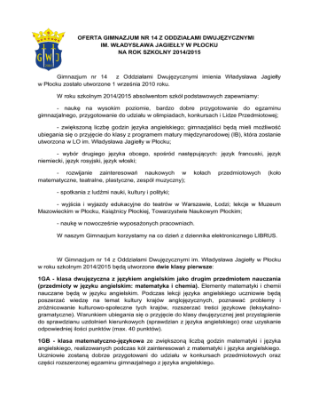 OFERTA GIMNAZJUM NR 14 Z ODDZIAŁAMI DWUJĘZYCZNYMI IM. WŁADYSŁAWA JAGIEŁŁY W PŁOCKU NA ROK SZKOLNY 2014/2015 Gimnazjum nr 14 z Oddziałami Dwujęzycznymi imienia Władysława Jagiełły w Płocku zostało utworzone 1 września 2010 roku. W roku szkolnym 2014/2015 absolwentom szkół podstawowych zapewniamy: - naukę na wysokim poziomie, bardzo dobre przygotowanie do egzaminu gimnazjalnego, przygotowanie do udziału w olimpiadach, konkursach i Lidze Przedmiotowej; - zwiększoną liczbę godzin języka angielskiego; gimnazjaliści będą mieli możliwość ubiegania się o przyjęcie do klasy z programem matury międzynarodowej (IB), która zostanie utworzona w LO im. Władysława Jagiełły w Płocku; - wybór drugiego języka obcego, spośród następujących: język francuski, język niemiecki, język rosyjski, język włoski; - rozwijanie zainteresowań naukowych w matematyczne, teatralne, plastyczne, zespół muzyczny); kołach przedmiotowych (koło - spotkania z ludźmi nauki, kultury i polityki; - wyjścia i wyjazdy edukacyjne do teatrów w Warszawie, Łodzi; lekcje w Muzeum Mazowieckim w Płocku, Książnicy Płockiej, Towarzystwie Naukowym Płockim; - naukę w nowocześnie wyposażonych pracowniach. W naszym Gimnazjum korzystamy na co dzień z dziennika elektronicznego LIBRUS. W Gimnazjum nr 14 z Oddziałami Dwujęzycznymi im. Władysława Jagiełły w Płocku w roku szkolnym 2014/2015 będą utworzone dwie klasy pierwsze: 1GA - klasa dwujęzyczna z językiem angielskim jako drugim przedmiotem nauczania (przedmioty w języku angielskim: matematyka i chemia). Elementy matematyki i chemii nauczane będą w języku angielskim. Podczas lekcji języka angielskiego uczniowie będą poszerzać wiedzę na temat kultury krajów anglojęzycznych, poznawać problemy i zróżnicowanie kulturowo-społeczne tych krajów, rozszerzać treści językowe (leksykalnogramatyczne). Warunkiem ubiegania się o przyjęcie do klasy dwujęzycznej jest przystąpienie do sprawdzianu uzdolnień kierunkowych (sprawdzian z języka angielskiego) oraz uzyskanie odpowiedniej ilości punktów (max. 40 punktów). 1GB - klasa matematyczno-językowa ze zwiększoną liczbą godzin matematyki i języka angielskiego, realizowanych podczas kół zainteresowań z matematyki i języka angielskiego. Uczniowie zostaną dobrze przygotowani do udziału w konkursach przedmiotowych oraz części rozszerzonej egzaminu gimnazjalnego z języka angielskiego.