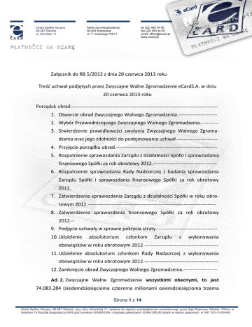 eCard Spółka Akcyjna 80-387 Gdańsk ul. Arkońska 11 Adres do korespondencji: 00-043 Warszawa ul. T. Czackiego 7/9/11 tel (22) 493 44 90 fax (22) 493 44 00 email: [email protected] www.ecard.pl Załącznik do RB 5/2013 z dnia 20 czerwca 2013 roku Treść uchwał podjętych przez Zwyczajne Walne Zgromadzenie eCardS.A. w dniu 20 czerwca 2013 roku Porządek obrad:-------------------------------------------------------------------------------1. Otwarcie obrad Zwyczajnego Walnego Zgromadzenia.----------------------2. Wybór Przewodniczącego Zwyczajnego Walnego Zgromadzenia.---------3. Stwierdzenie prawidłowości zwołania Zwyczajnego Walnego Zgromadzenia oraz jego zdolności do podejmowania uchwał.-----------------------4. Przyjęcie porządku obrad.-----------------------------------------------------------5. Rozpatrzenie sprawozdania Zarządu z działalności Spółki i sprawozdania finansowego Spółki za rok obrotowy 2012.-------------------------------------6. Rozpatrzenie sprawozdania Rady Nadzorczej z badania sprawozdania Zarządu Spółki i sprawozdania finansowego Spółki za rok obrotowy 2012. 7. Zatwierdzenie sprawozdania Zarządu z działalności Spółki w roku obrotowym 2012.---------------------------------------------------------------------------8. Zatwierdzenie sprawozdania finansowego Spółki za rok obrotowy 2012.-9. Podjęcie uchwały w sprawie pokrycia straty.-----------------------------------10. Udzielenie absolutorium członkom Zarządu z wykonywania obowiązków w roku obrotowym 2012.-------------------------------------------11. Udzielenie absolutorium członkom Rady Nadzorczej z wykonywania obowiązków w roku obrotowym 2012.-------------------------------------------12. Zamknięcie obrad Zwyczajnego Walnego Zgromadzenia.-------------------Ad. 2. Zwyczajne Walne Zgromadzenie wszystkimi obecnymi, to jest 74.083.284 (siedemdziesięcioma czterema milionami osiemdziesięcioma trzema Strona 1 z 14 eCard Spółka Akcyjna, 80-387 Gdańsk, przy ulicy Arkońskiej 11, wpisana do rejestru przedsiębiorców prowadzonego przez Sąd Rejonowy Gdańsk- Północ w Gdańsku VII Wydział Gospodarczy KRS pod numerem 0000042304, o kapitale zakładowym 16.840.000,00 złotych w całości opłaconym, nr NIP: 521-31-03-040 eCard Spółka Akcyjna 80-387 Gdańsk ul. Arkońska 11 Adres do korespondencji: 00-043 Warszawa ul. T. Czackiego 7/9/11 tel (22) 493 44 90 fax (22) 493 44 00 email: [email protected] www.ecard.pl tysiącami dwustu osiemdziesięcioma czterema) akcjami, z których oddano 74.083.284 (siedemdziesiąt cztery miliony osiemdziesiąt trzy tysiące dwieście osiemdziesiąt cztery) ważne głosy za, przy braku głosów przeciw i braku głosów wstrzymujących się, co stanowi 87,98 % (osiemdziesiąt siedem i dziewięćdziesiąt osiem setnych procenta) kapitału zakładowego, podjęło następującej treści uchwałę:--------------------------------„Uchwała nr 1 Zwyczajnego Walnego Zgromadzenia Spółki pod firmą eCard S.A. z siedzibą w Gdańsku z dnia 20 czerwca 2013 roku w sprawie wyboru Przewodniczącego Zwyczajnego Walnego Zgromadzenia § 1. Działając na podstawie art. 409 § 1 kodeksu spółek handlowych Zwyczajne Walne Zgromadzenie eCard S.A. wybiera na Przewodniczącego Zwyczajnego Walnego Zgromadzenia Panią Izabellę Małgorzatę Panek.-----------------------------------------------§ 2. Uchwała wchodzi w życie z dniem jej podjęcia.”------------------------------------ „Uchwała nr 2 Zwyczajnego Walnego Zgromadzenia Spółki pod firmą eCard S.A. z siedzibą w Gdańsku z dnia 20 czerwca 2013 roku w sprawie przyjęcia porządku obrad § 1. Zwyczajne Walne Zgromadzenie przyjmuje następujący porządek obrad:-----Strona 2 z 14 eCard Spółka Akcyjna, 80-387 Gdańsk, przy ulicy Arkońskiej 11, wpisana do rejestru przedsiębiorców prowadzonego przez Sąd Rejonowy Gdańsk- Północ w Gdańsku VII Wydział Gospodarczy KRS pod numerem 0000042304, o kapitale zakładowym 16.840.000,00 złotych w całości opłaconym, nr NIP: 521-31-03-040 eCard Spółka Akcyjna 80-387 Gdańsk ul. Arkońska 11 Adres do korespondencji: 00-043 Warszawa ul. T. Czackiego 7/9/11 tel (22) 493 44 90 fax (22) 493 44 00 email: [email protected] www.ecard.pl 1. Otwarcie obrad Zwyczajnego Walnego Zgromadzenia.----------------------------2. Wybór Przewodniczącego Zwyczajnego Walnego Zgromadzenia.----------------3. Stwierdzenie prawidłowości zwołania Zwyczajnego Walnego Zgromadzenia oraz jego zdolności do podejmowania uchwał.----------------------------------------4. Przyjęcie porządku obrad.---------------------------------------------------------------5. Rozpatrzenie sprawozdania Zarządu z działalności Spółki i sprawozdania finansowego Spółki za rok obrotowy 2012.--------------------------------------------6. Rozpatrzenie sprawozdania Rady Nadzorczej z badania sprawozdania Zarządu Spółki i sprawozdania finansowego Spółki za rok obrotowy 2012.----------------7. Zatwierdzenie sprawozdania Zarządu z działalności Spółki w roku obrotowym 2012.----------------------------------------------------------------------------------------8. Zatwierdzenie sprawozdania finansowego Spółki za rok obrotowy 2012.--------9. Podjęcie uchwały w sprawie pokrycia straty.-----------------------------------------10. Udzielenie absolutorium członkom Zarządu z wykonywania obowiązków w roku obrotowym 2012.----------------------------------------------------------------11. Udzielenie absolutorium członkom Rady Nadzorczej z wykonywania obowiązków w roku obrotowym 2012.-------------------------------------------------12. Zamknięcie obrad Zwyczajnego Walnego Zgromadzenia.--------------------------§ 2. Uchwała wchodzi w życie z dniem jej podjęcia.”------------------------------------ Za przyjęciem uchwały w powyższym brzmieniu brały udział wszystkie obecne, to jest 74.083.284 (siedemdziesiąt cztery miliony osiemdziesiąt trzy tysiące dwieście osiemdziesiąt cztery) akcje, 