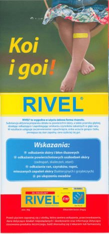 RIVEL: RIVELOto wygodna w użyciu żel owa forma rivanolu. Substancja aktywna preparatu działa na powierzchni skóry, a także przenika głębiej, działając odkażająco i zapobiegając wnikaniu czynników zakażnych w głąb rany. W rezultacie ustępuje zaczerwienienie i opuchnięcie, znika uczucie gorąca i bólu, zmniejsza się stan zapalny, rana szybciej się goi.