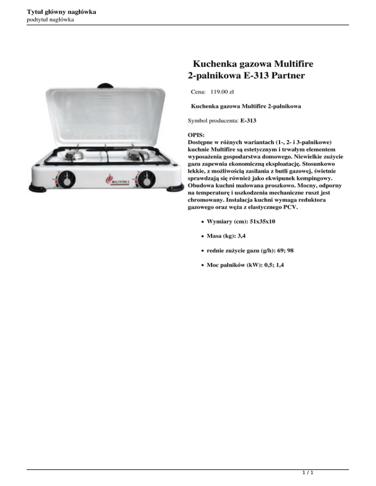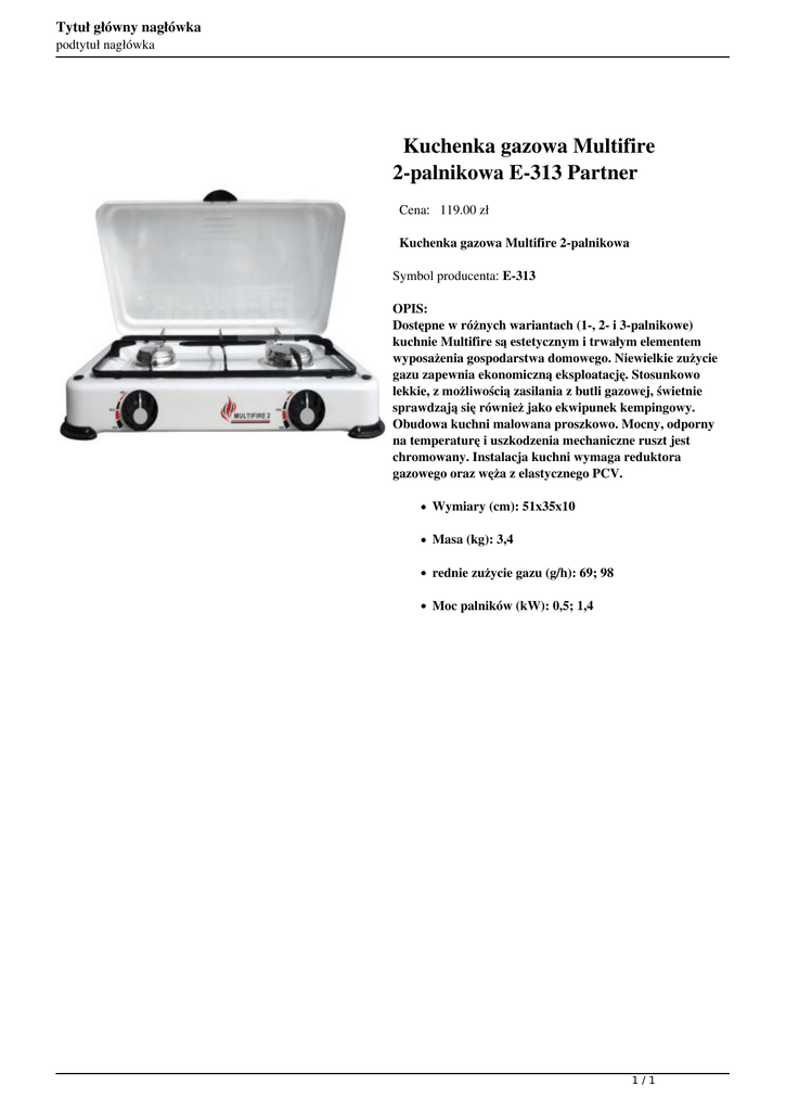 Tytuł główny nagłówka podtytuł nagłówka Kuchenka gazowa Multifire 2-palnikowa E-313 Partner Cena: 119.00 zł Kuchenka gazowa Multifire 2-palnikowa Symbol producenta: E-313 OPIS: Dostępne w różnych wariantach (1-, 2- i 3-palnikowe) kuchnie Multifire są estetycznym i trwałym elementem wyposażenia gospodarstwa domowego. Niewielkie zużycie gazu zapewnia ekonomiczną eksploatację. Stosunkowo lekkie, z możliwością zasilania z butli gazowej, świetnie sprawdzają się również jako ekwipunek kempingowy. Obudowa kuchni malowana proszkowo. Mocny, odporny na temperaturę i uszkodzenia mechaniczne ruszt jest chromowany. Instalacja kuchni wymaga reduktora gazowego oraz węża z elastycznego PCV. Wymiary (cm): 51x35x10 Masa (kg): 3,4 rednie zużycie gazu (g/h): 69; 98 Moc palników (kW): 0,5; 1,4 1/1 Powered by TCPDF (www.tcpdf.org)