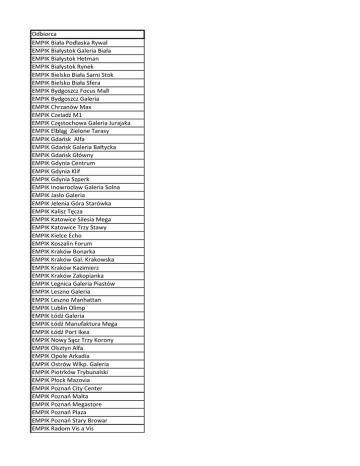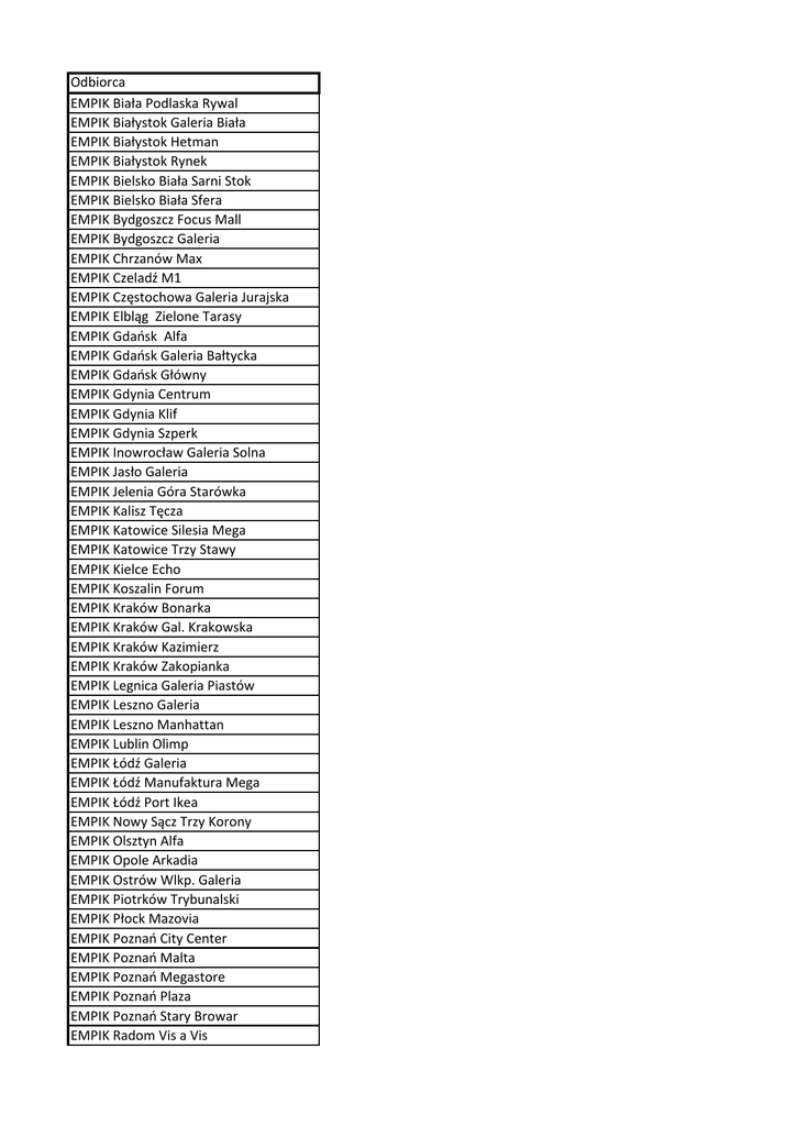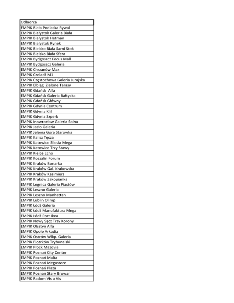 Odbiorca EMPIK Biała Podlaska Rywal EMPIK Białystok Galeria Biała EMPIK Białystok Hetman EMPIK Białystok Rynek EMPIK Bielsko Biała Sarni Stok EMPIK Bielsko Biała Sfera EMPIK Bydgoszcz Focus Mall EMPIK Bydgoszcz Galeria EMPIK Chrzanów Max EMPIK Czeladź M1 EMPIK Częstochowa Galeria Jurajska EMPIK Elbląg Zielone Tarasy EMPIK Gdańsk Alfa EMPIK Gdańsk Galeria Bałtycka EMPIK Gdańsk Główny EMPIK Gdynia Centrum EMPIK Gdynia Klif EMPIK Gdynia Szperk EMPIK Inowrocław Galeria Solna EMPIK Jasło Galeria EMPIK Jelenia Góra Starówka EMPIK Kalisz Tęcza EMPIK Katowice Silesia Mega EMPIK Katowice Trzy Stawy EMPIK Kielce Echo EMPIK Koszalin Forum EMPIK Kraków Bonarka EMPIK Kraków Gal. Krakowska EMPIK Kraków Kazimierz EMPIK Kraków Zakopianka EMPIK Legnica Galeria Piastów EMPIK Leszno Galeria EMPIK Leszno Manhattan EMPIK Lublin Olimp EMPIK Łódź Galeria EMPIK Łódź Manufaktura Mega EMPIK Łódź Port Ikea EMPIK Nowy Sącz Trzy Korony EMPIK Olsztyn Alfa EMPIK Opole Arkadia EMPIK Ostrów Wlkp. Galeria EMPIK Piotrków Trybunalski EMPIK Płock Mazovia EMPIK Poznań City Center EMPIK Poznań Malta EMPIK Poznań Megastore EMPIK Poznań Plaza EMPIK Poznań Stary Browar EMPIK Radom Vis a Vis EMPIK Rumia Galeria EMPIK Rybnik Plaza EMPIK Rzeszów Galeria City Center EMPIK Sopot Promenada EMPIK Starogard Gdański EMPIK Suwałki Plaza EMPIK Szczecin Galaxy EMPIK Świnoujście Wybrzeże EMPIK Toruń Copernicus EMPIK Toruń Starówka EMPIK Wałbrzych Galeria Victoria EMPIK Włocławek City EMPIK Wrocław Bielany EMPIK Wrocław Magnolia Park EMPIK Wrocław Megastore EMPIK Wrocław Pasaż Grunwald. EMPIK Wrocław Renoma EMPIK W-wa Arkadia Mega EMPIK W-wa Blue City II (Nowy) EMPIK W-wa Gal. Mokotów Mega EMPIK W-wa Gocław EMPIK W-wa Janki EMPIK W-wa Junior Mega EMPIK W-wa Nowy Świat Mega EMPIK W-wa Piaseczno EMPIK W-wa Promenada EMPIK W-wa Sadyba EMPIK W-wa Skorosze EMPIK W-wa Targówek EMPIK W-wa Wola Park EMPIK W-wa Złote Tarasy EMPIK Zielona Góra Westerplatt