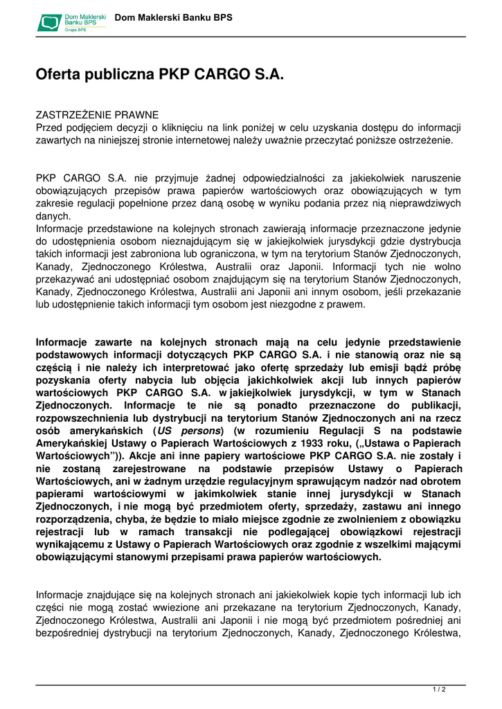Dom Maklerski Banku BPS Oferta publiczna PKP CARGO S.A. ZASTRZEŻENIE PRAWNE Przed podjęciem decyzji o kliknięciu na link poniżej w celu uzyskania dostępu do informacji zawartych na niniejszej stronie internetowej należy uważnie przeczytać poniższe ostrzeżenie. PKP CARGO S.A. nie przyjmuje żadnej odpowiedzialności za jakiekolwiek naruszenie obowiązujących przepisów prawa papierów wartościowych oraz obowiązujących w tym zakresie regulacji popełnione przez daną osobę w wyniku podania przez nią nieprawdziwych danych. Informacje przedstawione na kolejnych stronach zawierają informacje przeznaczone jedynie do udostępnienia osobom nieznajdującym się w jakiejkolwiek jurysdykcji gdzie dystrybucja takich informacji jest zabroniona lub ograniczona, w tym na terytorium Stanów Zjednoczonych, Kanady, Zjednoczonego Królestwa, Australii oraz Japonii. Informacji tych nie wolno przekazywać ani udostępniać osobom znajdującym się na terytorium Stanów Zjednoczonych, Kanady, Zjednoczonego Królestwa, Australii ani Japonii ani innym osobom, jeśli przekazanie lub udostępnienie takich informacji tym osobom jest niezgodne z prawem. Informacje zawarte na kolejnych stronach mają na celu jedynie przedstawienie podstawowych informacji dotyczących PKP CARGO S.A. i nie stanowią oraz nie są częścią i nie należy ich interpretować jako ofertę sprzedaży lub emisji bądź próbę pozyskania oferty nabycia lub objęcia jakichkolwiek akcji lub innych papierów wartościowych PKP CARGO S.A. w jakiejkolwiek jurysdykcji, w tym w Stanach Zjednoczonych. Informacje te nie są ponadto przeznaczone do publikacji, rozpowszechnienia lub dystrybucji na terytorium Stanów Zjednoczonych ani na rzecz osób amerykańskich (US persons) (w rozumieniu Regulacji S na podstawie Amerykańskiej Ustawy o Papierach Wartościowych z 1933 roku, („Ustawa o Papierach Wartościowych”)). Akcje ani inne papiery wartościowe PKP CARGO S.A. nie zostały i nie zostaną zarejestrowane na podstawie przepisów Ustawy o Papierach Wartościowych, ani w żadnym urzędzie regulacyjnym sprawującym nadzór nad obrotem papierami wartościowymi w jakimkolwiek stanie innej jurysdykcji w Stanach Zjednoczonych, i nie mogą być przedmiotem oferty, sprzedaży, zastawu ani innego rozporządzenia, chyba, że będzie to miało miejsce zgodnie ze zwolnieniem z obowiązku rejestracji lub w ramach transakcji nie podlegającej obowiązkowi rejestracji wynikającemu z Ustawy o Papierach Wartościowych oraz zgodnie z wszelkimi mającymi obowiązującymi stanowymi przepisami prawa papierów wartościowych. Informacje znajdujące się na kolejnych stronach ani jakiekolwiek kopie tych informacji lub ich części nie mogą zostać wwiezione ani przekazane na terytorium Zjednoczonych, Kanady, Zjednoczonego Królestwa, Australii ani Japonii i nie mogą być przedmiotem pośredniej ani bezpośredniej dystrybucji na terytorium Zjednoczonych, Kanady, Zjednoczonego Królestwa, 1/2 Dom Maklerski Banku BPS Australii ani Japonii ani na rzecz jakiejkolwiek osoby mającej miejsce stałego zamieszkania na tych terytoriach. Przedstawione informacje są aktualne na moment ich publikacji i w żadnym wypadku nie można uważać ich za poprawne w jakimkolwiek momencie następującym po dacie publikacji tych informacji ani sądzić, że od daty publikacji tych informacji nie zaszły żadne zmiany w sytuacji finansowej lub działalności PKP CARGO S.A. Niniejszy dokument może od czasu do czasu być aktualizowany, jednak PKP CARGO S.A. nie jest zobowiązane do zamieszczania takich zmian lub uzupełnień na swojej stronie internetowej. Kliknięcie na poniższy link w celu uzyskania dostępu do informacji na kolejnych stronach oraz innych informacji na niniejszej stronie internetowej jest tożsame ze złożeniem przez użytkownika oświadczenia i zapewnienia, że: (i) użytkownik nie znajduje się w chwili obecnej w jakiejkolwiek jurysdykcji w której dystrybucja informacji przedstawionych na niniejszej stronie internetowej jest zabroniona lub ograniczona, w tym na terytorium Stanów Zjednoczonych, Kanady, Zjednoczonego Królestwa, Australii lub Japonii; (ii) może zgodnie z prawem otrzymać kopię informacji przedstawionych na niniejszej stronie internetowej; oraz (iii) zapoznał się, zrozumiał oraz zobowiązuje się przestrzegać wszystkich ograniczeń przedstawionych powyżej. WYRAŻAM ZGODĘ NIE WYRAŻAM ZGODY 2/2