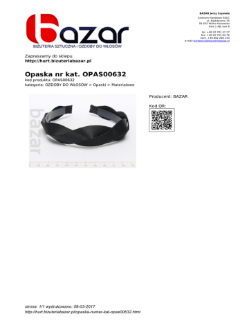 BAZAR Jerzy Szymala Centrum Handlowe EACC ul. Nadrzeczna 7A 05-552 Wólka Kosowska hala 1 AB, box B tel. +48 22 701 37 27 fax. +48 22 751 64 70 kom. +48 602 260 233 e-mail:[email protected] Zapraszamy do sklepu http://hurt.bizuteriabazar.pl Opaska nr kat. OPAS00632 kod produktu: OPAS00632 kategoria: OZDOBY DO WŁOSÓW > Opaski > Materiałowe Producent: BAZAR Kod QR: strona: 1/1 wydrukowano: 08-03-2017 http://hurt.bizuteriabazar.pl/opaska-numer-kat-opas00632.html