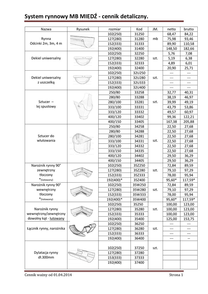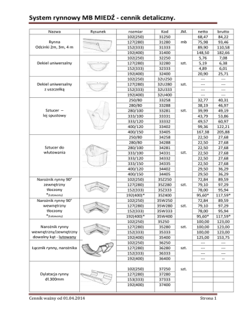 System rynnowy MB MIEDŹ - cennik detaliczny. Nazwa Rynna Odcinki 2m, 3m, 4 m Dekiel uniwersalny Dekiel uniwersalny z uszczelką Sztucer – lej spustowy Sztucer do wlutowania Narożnik rynny 90° zewnętrzny tłoczony *(lutowany) Narożnik rynny 90° wewnętrzny tłoczony *(lutowany) Narożnik rynny wewnętrzny/zewnętrzny dowolny kąt - lutowany Łącznik rynny, narożnika Dylatacja rynny dł.300mm Cennik ważny od 01.04.2014 Rysunek rozmiar 102(250) 127(280) 152(333) 192(400) 102(250) 127(280) 152(333) 192(400) 102(250) 127(280) 152(333) 192(400) 250/80 280/80 280/100 333/100 333/120 400/120 400/150 250/80 280/80 280/100 333/100 333/120 333/150 400/120 400/150 102(250) 127(280) 152(333) 192(400)* 102(250) 127(280) 152(333) 192(400)* 102(250) 127(280) 152(333) 192(400) 102(250) 127(280) 152(333) 192(400) Kod 31250 31280 31333 31400 32250 32280 32333 32400 32U250 32U280 32U333 32U400 33258 33288 33281 33331 33332 33402 33405 34258 34288 34281 34331 34332 34335 34402 34405 35Z250 35Z280 35Z333 35Z400 35W250 35W280 35W333 35W400 35250 35280 35333 35400 36250 36280 36333 36400 JM. 102(250) 127(280) 153(333) 192(400) 37250 37280 37333 37400 szt. mb szt. szt. szt. szt. szt. szt. szt. szt. netto 68,47 75,98 89,90 148,50 5,76 5,19 4,89 20,90 --------32,77 38,19 39,99 43,79 49,57 99,36 167,38 22,50 22,50 22,50 22,50 22,50 22,50 29,50 29,50 72,84 79,10 78,00 95,60* 72,84 79,10 78,00 95,60* 100,00 100,00 100,00 125,00 --------- brutto 84,22 93,46 110,58 182,66 7,08 6,38 6,01 25,71 --------40,31 46,97 49,19 53,86 60,97 122,21 205,88 27,68 27,68 27,68 27,68 27,68 27,68 36,29 36,29 89,59 97,29 95,94 117,59* 89,59 97,29 95,94 117,59* 123,00 123,00 123,00 153,75 -------- Strona 1 System rynnowy MB MIEDŹ - cennik detaliczny. Nazwa Hak rynny połaciowy Długi 320-350 mm Hak rynny połaciowy oplatany miedź długi 320-350 mm Hak rynny doczołowy Rura spustowa mufowana odcinki 1m,2m, 3m, 4 m Kolanko 72° Tłoczone *segmentowe Kolanko odsadzka ET-60 mm Tłoczone *segmentowe Kolanko odlewka Tłoczone *segmentowe Kolanko 45° segmentowe Złączka rury spustowej (mufa) Sitko Trójnik redukcyjny 72° Wys. 300 mm Trójnik 72° Wys. 300 mm Cennik ważny od 01.04.2014 Rysunek rozmiar 102(250) 127(280) 152(333) 192(400) 102(250) 127(280) 152(333) 192(400) 102(250) 127(280) 152(333) 192(400) 80 100 120 150 80 100 120 *150 80 100 120 *150 80 100 120 *150 80 100 120 150 80 100 120 150 80 100 120 150 100/80 120/80 Kod 38250 38280 38333 38400 08M250 08M280 08M333 08M400 38D250 38D280 38D333 38D400 3980 39100 39120 39150 31080 31010 31012 31015 31180 31110 31112 31115 312O80 312O10 312O12 312O15 31380 31310 31312 31315 31480 31410 31412 31415 31580 31510 31512 31515 31610 31612 150/80 31615 80/80 100/100 120/120 150/150 31780 31710 31712 31715 JM. szt. szt. mb szt. szt. szt. szt. szt. netto 33,58 36,97 37,87 58,00 15,39 15,85 15,99 --30,90 38,77 40,34 --78,32 94,81 109,95 136,77 25,99 34,08 61,07 69,50* 82,46 82,64 134,06 139,00* 28,49 36,58 63,57 72,00* 57,40 58,20 62,60 66,90 19,90 23,60 29,70 31,90 Brutto 41,30 45,47 46,58 71,34 18,93 19,50 19,67 --38,01 47,69 49,62 --96,33 116,61 135,24 168,23 31,97 41,92 75,12 85,49 101,43 101,65 164,89 170,97 35,04 44,99 78,19 88,56* 70,60 71,58 77,00 82,28 24,47 29,02 36,53 39,23 --99,00 105,00 --121,77 129,15 118,00 145,14 99,00 99,00 105,00 118,00 121,77 121,77 129,15 145,14 szt. szt. szt. Strona 2 System rynnowy MB MIEDŹ - cennik detaliczny. Nazwa Rozmiar 80 100 120 150 Kod 31880 31810 31812 ---- 80 100 120 150 Długość 140 mm 200 mm 250 mm 80 100 120 150 31980 31910 31912 31915 02014 02020 02025 32180 32110 32112 32115 szt. Uchwyt ścienny OCYNK M8 022 Redukcja Wg rysunku Kosz zlewny Wys.250 Szer.250 Gł.250 Łapacz wody - czyszczak z sitkiem Obejma rury pod dwu gwint M8 Dwu gwint do obejmy M8 + koszulka 12x60 Obejma rury MIEDŹIANA z trzpieniem L-200 Kosz zlewny Wg rys. Kolano typ. „ŁABĘDZIA SZYJA” Klej do klejenia rynien Rysunek JM netto 70,68 76,39 91,59 --- Brutto 86,94 93,96 112,66 --- --------- --------- 1,15 1,18 1,52 18,65 19,22 22,62 29,79 1,41 1,45 1,87 22,94 23,64 27,82 36,64 szt. 3,90 4,80 323 szt. od 64,00 Od 78,72 324 szt. 200,00 246,00 325 szt. Wycena indywidualna 326 szt. Wycena indywidualna szt. szt. szt. Wg rysunku Wg rysunku 027 szt. 35,00 43,05 23,58 29,00 300 ml bezbarwny, szary, brązowy, czarno-szary. Cyna LC 60 ok.245-250 g. Cennik ważny od 01.04.2014 028 szt. Strona 3 System rynnowy MB MIEDŹ - cennik detaliczny. Płyn do lutowania 250 ml. 029M szt. 39,40 Producent: Metal Błysk s.c. Paweł Ochał, Michał Ochał 31-126 Kraków ul. Czarnowiejska 1 tel./fax 12 633-05-98 email: [email protected] Niniejszy cennik jest jedynie informacją handlową w rozumieniu art. 71 kodeksu cywilnego i nie może być traktowany jako oferta handlowa w myśl art. 66 ust. 1 kodeksu cywilnego. Ceny podane w cenniku mogą ulec zmianie bez uprzedzenia. Podane ceny są cenami loco Metal Błysk s.c. Cennik ważny od 01.04.2014 Strona 4 48,46