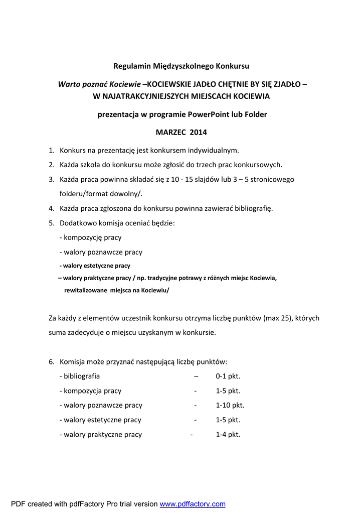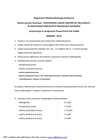 Regulamin Międzyszkolnego Konkursu Warto poznać Kociewie –KOCIEWSKIE JADŁO CHĘTNIE BY SIĘ ZJADŁO – W NAJATRAKCYJNIEJSZYCH MIEJSCACH KOCIEWIA prezentacja w programie PowerPoint lub Folder MARZEC 2014 1. Konkurs na prezentację jest konkursem indywidualnym. 2. Każda szkoła do konkursu może zgłosić do trzech prac konkursowych. 3. Każda praca powinna składać się z 10 - 15 slajdów lub 3 – 5 stronicowego folderu/format dowolny/. 4. Każda praca zgłoszona do konkursu powinna zawierać bibliografię. 5. Dodatkowo komisja oceniać będzie: - kompozycję pracy - walory poznawcze pracy - walory estetyczne pracy – walory praktyczne pracy / np. tradycyjne potrawy z różnych miejsc Kociewia, rewitalizowane miejsca na Kociewiu/ Za każdy z elementów uczestnik konkursu otrzyma liczbę punktów (max 25), których suma zadecyduje o miejscu uzyskanym w konkursie. 6. Komisja może przyznać następującą liczbę punktów: - bibliografia – 0-1 pkt. - kompozycja pracy - 1-5 pkt. - walory poznawcze pracy - 1-10 pkt. - walory estetyczne pracy - 1-5 pkt. - walory praktyczne pracy - 1-4 pkt. PDF created with pdfFactory Pro trial version www.pdffactory.com 7. W przypadku uzyskania przez uczestników konkursu takiej samej liczby punktów zajmują oni tę samą pozycję w rywalizacji. Członkowie komisji mogą w takim przypadku zdecydować o ewentualnym ponownym ocenieniu takich prac według wcześniejszych zasad (dotyczy uczestników konkursu, którzy zdobyli miejsca od I do III). 8. Praca konkursowa pozostanie u organizatora konkursu. 9. Informacja o konkursie i jego laureatach zostanie zamieszczona na stronie www.ekociewie.pl oraz stronie internetowej Zespołu Szkół Rzemieślniczych i Kupieckich www.zsrik.org . 10. Nagrodzone prace zostaną opublikowane na stronie internetowej Zespołu Szkół Rzemieślniczych i Kupieckich. 11. Uczestnicy konkursu wyrażają zgodę na publikację ich wizerunku oraz danych. 12. Zgłoszenie do udziału w konkursie jest równoznaczne z przyjęciem powyższych postanowień regulaminu. Organizatorzy: Ewa Racka-Koluch Justyna Deja Katarzyna Kosińska PDF created with pdfFactory Pro trial version www.pdffactory.com