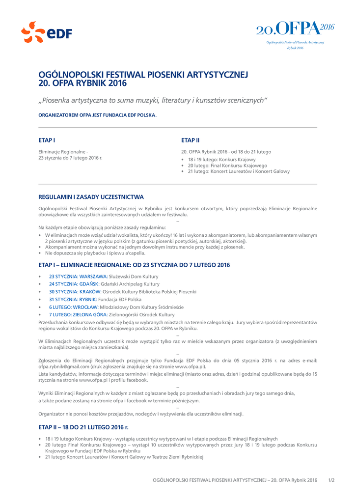 OGÓLNOPOLSKI FESTIWAL PIOSENKI ARTYSTYCZNEJ 20. OFPA RYBNIK 2016 „Piosenka artystyczna to suma muzyki, literatury i kunsztów scenicznych” ORGANIZATOREM OFPA JEST FUNDACJA EDF POLSKA. ETAP I ETAP II Eliminacje Regionalne 23 stycznia do 7 lutego 2016 r. 20. OFPA Rybnik 2016 - od 18 do 21 lutego • 18 i 19 lutego: Konkurs Krajowy • 20 lutego: Finał Konkursu Krajowego • 21 lutego: Koncert Laureatów i Koncert Galowy REGULAMIN I ZASADY UCZESTNICTWA Ogólnopolski Festiwal Piosenki Artystycznej w Rybniku jest konkursem otwartym, który poprzedzają Eliminacje Regionalne obowiązkowe dla wszystkich zainteresowanych udziałem w festiwalu. – Na każdym etapie obowiązują poniższe zasady regulaminu: • W eliminacjach może wziąć udział wokalista, który ukończył 16 lat i wykona z akompaniatorem, lub akompaniamentem własnym 2 piosenki artystyczne w języku polskim (z gatunku piosenki poetyckiej, autorskiej, aktorskiej). • Akompaniament można wykonać na jednym dowolnym instrumencie przy każdej z piosenek. • Nie dopuszcza się playbacku i śpiewu a’capella. ETAP I – ELIMINACJE REGIONALNE: OD 23 STYCZNIA DO 7 LUTEGO 2016 • 23 STYCZNIA: WARSZAWA: Służewski Dom Kultury • 24 STYCZNIA: GDAŃSK: Gdański Archipelag Kultury • 30 STYCZNIA: KRAKÓW: Ośrodek Kultury Biblioteka Polskiej Piosenki • 31 STYCZNIA: RYBNIK: Fundacja EDF Polska • 6 LUTEGO: WROCŁAW: Młodzieżowy Dom Kultury Śródmieście • 7 LUTEGO: ZIELONA GÓRA: Zielonogórski Ośrodek Kultury Przesłuchania konkursowe odbywać się będą w wybranych miastach na terenie całego kraju. Jury wybiera spośród reprezentantów regionu wokalistów do Konkursu Krajowego podczas 20. OFPA w Rybniku. – W Eliminacjach Regionalnych uczestnik może wystąpić tylko raz w mieście wskazanym przez organizatora (z uwzględnieniem miasta najbliższego miejsca zamieszkania). – Zgłoszenia do Eliminacji Regionalnych przyjmuje tylko Fundacja EDF Polska do dnia 05 stycznia 2016 r. na adres e-mail: [email protected] (druk zgłoszenia znajduje się na stronie www.ofpa.pl). Lista kandydatów, informacje dotyczące terminów i miejsc eliminacji (miasto oraz adres, dzień i godzina) opublikowane będą do 15 stycznia na stronie www.ofpa.pl i profilu facebook. – Wyniki Eliminacji Regionalnych w każdym z miast ogłaszane będą po przesłuchaniach i obradach jury tego samego dnia, a także podane zostaną na stronie ofpa i facebook w terminie późniejszym. – Organizator nie ponosi kosztów przejazdów, noclegów i wyżywienia dla uczestników eliminacji. ETAP II – 18 DO 21 LUTEGO 2016 r. • 18 i 19 lutego Konkurs Krajowy - wystąpią uczestnicy wytypowani w I etapie podczas Eliminacji Regionalnych • 20 lutego Finał Konkursu Krajowego – wystąpi 10 uczestników wytypowanych przez jury 18 i 19 lutego podczas Konkursu Krajowego w Fundacji EDF Polska w Rybniku • 21 lutego Koncert Laureatów i Koncert Galowy w Teatrze Ziemi Rybnickiej OGÓLNOPOLSKI FESTIWAL PIOSENKI ARTYSTYCZNEJ – 20. OFPA Rybnik 2016 1/2 Wokalista zakwalifikowany do finału Konkursu Krajowego ma prawo do próby technicznej w czasie ustalonym przez organizatora. – Kolejność występu w obu etapach ustala organizator (poprzez losowanie), natomiast kolejność wykonywania utworów leży w gestii wokalisty. – Prezentacje konkursowe oceniać będzie profesjonalne Jury, które w werdykcie ustali także podział nagród pieniężnych, oraz przyzna tytuł najlepszego akompaniatora festiwalu. WERDYKT: Finału Konkursu 20.OFPA ogłoszony zostanie przez jury 20 lutego podczas konferencji prasowej po koncercie towarzyszącym. Laureaci konkursu są zobowiązani do uczestnictwa w Koncercie Laureatów bieżącej edycji. Jurorzy decydują który utwór z repertuaru zostanie wykonany podczas Koncertu Laureatów. – Wręczenie nagród, Koncert Laureatów oraz Koncert Galowy odbędzie się 21 lutego 2015 r na scenie Teatru Ziemi Rybnickiej Plac Teatralny 1. NAGRODY: • Organizator festiwalu Fundacja EDF Polska - 20.000,00 zł (kwota do podziału przez jury). • inne nagrody (podane zostaną w późniejszym terminie) ZASADY ORGANIZACYJNE: Udział w eliminacjach jest obowiązkowy dla wszystkich zainteresowanych uczestnictwem w Konkursie Krajowym. W eliminacjach uczestnik może wystąpić tylko raz w mieście wskazanym przez organizatora. – Organizator nie bierze odpowiedzialności za nie dopełnienie przez wokalistów formalności związanych z wymogami prawa autorskiego. – Wykonawcy wyrażają zgodę na ewentualne rejestracje i emisje radiowe, telewizyjne lub internetowe, oraz wydanie płyty DVD. – Organizator zapewnia środki techniczne umożliwiające prezentację sceniczną. – Finał Konkursu Krajowego 20 lutego oraz Koncert Laureatów podczas Koncertu Galowego 21 lutego odbywać się będzie z udziałem publiczności. W każdym z tych dni odbędą się także koncerty zaproszonych gości. – Uczestnicy konkursu przyjeżdżają do Rybnika na koszt własny. Noclegi i wyżywienie zapewnia organizator festiwalu (szczegóły zostaną podane po eliminacjach). – Instruktorzy i obserwatorzy uczestniczą w imprezach na zasadach płatnych akredytacji. Informacje dotyczące akredytacji dostępne będą na stronie internetowej www.ofpa.pl – Zgłoszenia przyjmujemy na adres e-mail: [email protected]. Wypełnienie i podpisanie karty zgłoszenia jest równoznaczne z akceptacją regulaminu. – Wszelkich informacji organizacyjnych udziela Dyrektor Artystyczny Festiwalu Jadwiga Demczuk-Bronowska tel. 604-426-858 e-mail [email protected] Biuro organizacyjne pełni rolę koordynatora podczas festiwalu. – Organizator zastrzega sobie dokonywanie zmian w niniejszym regulaminie. Dane adresowe organizatora: Fundacja EDF Polska, 44-207 Rybnik, ul.Podmiejska, tel. 32 739 1898. fundacja.edf.pl ofpa.pl OGÓLNOPOLSKI FESTIWAL PIOSENKI ARTYSTYCZNEJ – 20. OFPA Rybnik 2016 2/2