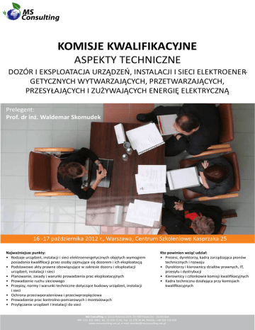 KOMISJE KWALIFIKACYJNE ASPEKTY TECHNICZNE DOZÓR I EKSPLOATACJA URZĄDZEŃ, INSTALACJI I SIECI ELEKTROENERGETYCZNYCH WYTWARZAJĄCYCH, PRZETWARZAJĄCYCH, PRZESYŁAJĄCYCH I ZUŻYWAJĄCYCH ENERGIĘ ELEKTRYCZNĄ Prelegent: Prof. dr inż. Waldemar Skomudek 16 -17 października 2012 r., Warszawa, Centrum Szkoleniowe Kasprzaka 25 Najważniejsze punkty: • Rodzaje urządzeń, instalacji i sieci elektroenergetycznych objętych wymogiem posiadania kwalifikacji przez osoby zajmujące się dozorem i ich eksploatacją • Podstawowe akty prawne obowiązujące w zakresie dozoru i eksploatacji urządzeń, instalacji i sieci • Planowanie, zasady i warunki prowadzenia prac eksploatacyjnych • Prowadzenie ruchu sieciowego • Przepisy, normy i warunki techniczne dotyczące budowy urządzeń, instalacji i sieci • Ochrona przeciwporażeniowa i przeciwprzepięciowa • Prowadzenie prac kontrolno-pomiarowych i montażowych • Przyłączanie urządzeń i instalacji do sieci Kto powinien wziąć udział: • Prezesi, dyrektorzy, kadra zarządzająca pionów technicznych i rozwoju • Dyrektorzy i kierownicy działów prawnych, IT, przesyłu i dystrybucji • Kierownicy i członkowie komisji kwalifikacyjnych • Kadra techniczna działająca przy komisjach kwalifikacyjnych MS Consulting ul. Zorzy Polarnej 23/4, 05-500 Piaseczno - Józefosław NIP: 522-105-3902, Tel: 22 250 15 92, Fax: 22 378 36 44, Mobile: +48 508 154 626 www.msconsulting.net.pl, e-mail: [email protected] KOMISJE KWALIFIKACYJNE - ASPEKTY TECHNICZNE O szkoleniu Szkolenie „Komisje Kwalifkacyjne – szkolenie techniczne. Dozór i eksploatacja urządzeń, instalacji i sieci elektroenergetycznych wytwarzających, przetwarzających, przesyłających i zużywających energię elektryczną.” poświęcone jest aktualizacji stanu wiedzy dotyczącej technicznych wymogów pracy dla osób z kwalifikacjami wymagającymi potwierdzenia przez komisje kwalifikacyjne. Jest to nie tylko kompendium wiedzy o aktualnym stanie podstawowych przepisów, norm i warunków technicznych dotyczących budowy urządzeń, instalacji i sieci ale również analiza szczególnych przypadków interpretacji przepisów, oparta na bogatej wiedzy, zarówno teoretycznej jak i praktycznej prof. dr hab. inż Waldemara Skomudka z Politechniki Opolskiej, który oprócz pracy naukowej piastował najwyższe stanowiska kierownicze w energetyce. W praktyce szkoleniowej naszej firmy przeszkoliliśmy do tej pory przedstawicieli 211 komisji, zarówno w aspekcie technicznym jak i regulacyjno-prawnym. O Prelegencie Prof. nzw. dr hab. inż. Waldemar Skomudek - Katedra Zarządzania Projektami Wydziału Inżynierii Produkcji i Logistyki, Politechnika Opolska. Posiada ponad 25-letni staż pracy zawodowej w energetyce zawodowe. W latach 2001-2008 pełnił funkcje zarządcze w spółkach elektroenergetycznych województw opolskiego i dolnośląskiego (stanowiska: Prezesa ZE Opole SA i Wiceprezesa EenergiiPro KE S.A.) oraz w latach 2008-2010 pełnił funkcję Wiceprezesa w spółce Polskie Sieci Eelektroenergetyczne Operator S.A. w Konstacinie-Jeziornej. Brał udział w tworzeniu grup kapitałowych EnergiaPro KE S.A. i TAURON S.A. i wydzieleniu Operatora Systemu Dystrybucyjnego. W pracy naukowo-badawczej zajmuje się głównie funkcjonowaniem rynku energii elektrycznej, problematyką stabilności pracy krajowego systemu elektroenergetycznego, problematyką inwestycyjną i eksploatacyjną sieci elektroenergetycznych, zarządzaniem podmiotami podsektora elektroenergetycznego w warunkach konkurencji, problematyką oceny stopnia zagrożenia i skuteczności ochrony przed oddziaływaniem zjawisk o charakterze falowym (elektromagnetycznym), które towarzyszą wyładowaniom atmosferycznym i stanom zakłóceniowym w sieciach elektroenergetycznych. W ramach prowadzonych badań opublikował ponad 100 artykułów naukowych i referatów, jest współautorem dwóch książek i autorem dwóch monografii. Jest m.in. członkiem Zespołu Doradców Ministerstwa Gospodarki do spraw rozwiązań systemowych w sektorze energetyki, ekspertem Narodowego Centrum Badań i Rozwoju, ekspertem Komisji Europejskiej ds. badań naukowych, wiceprezesem O/Opolskiego SEP, Senior Member IEEE (Institute of Electrical and Electronics Engineers), członkiem PKWSE CIGRE, PTETiS, PTPiREE i dwóch Sekcji Komitetu Elektrotechniki PAN. O Firmie MS Consulting jest wysokospecjalistyczną firmą consultingową dostarczającą usługi szkoleniowe i doradcze dla sektora energetyki i sektorów okołoenergetycznych. Świadczymy usługi dla takich firm jak:Tauron, ENEA S.A., ENERGA S.A., ENION SA, Citigorup, PGE S.A, PSE Operator, PZU Asset Management,Vattenfall, RWE Stoen,PSE Operator, PKN Orlen, Alcatel-Lucent, Hewlett-Packard, IBM Poland, Siemens i wielu innych. Prezesem firmy jest dr Marian Ślifierz, wieloletni doradca Regulatora i jego przedstawiciel w wielu ciałach unijnych, współpracownik OECD,IEA, ERRA, oraz instytucji regulacyjnych z wielu krajów. Więcej szczegółów o naszej firmie, spis naszych największych klientów, partnerów oraz ekspertów na stronie: www.msconsulting.net.pl KOMISJE KWALIFIKACYJNE - ASPEKTY TECHNICZNE Harmonogram Dzień pierwszy 9.00-10.30 Rodzaje urządzeń, instalacji i sieci elektroenergetycznych objętych wymogiem posiadania kwalifikacji przez osoby zajmujące się dozorem i ich eksploatacją • Charakterystyka i podstawowe funkcje urządzeń, instalacji i sieci elektroenergetycznych • Urządzenia prądotwórcze przyłączone do krajowej sieci elektroenergetycznej bez względu na wysokość napięcia znamionowego • Urządzenia, instalacje i sieci elektroenergetyczne o napięciu znamionowym nie wyższym niż 1 kV • Urządzenia, instalacje i sieci elektroenergetyczne o napięciu znamionowym wyższym niż 1 kV • Zespoły prądotwórcze o mocy powyżej 50 kVA • Urządzenia elektrotermiczne • Urządzenia do elektrolizy • Sieci elektryczne oświetlenia ulicznego • Elektryczna sieć trakcyjna 