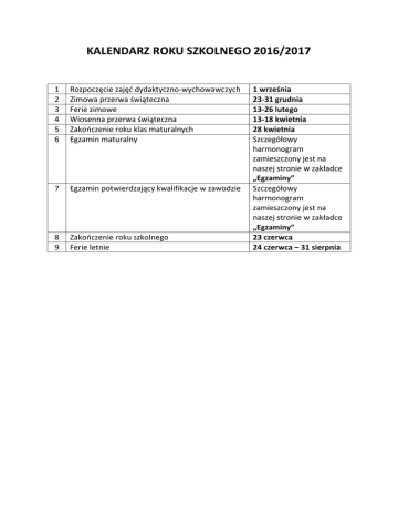 KALENDARZ ROKU SZKOLNEGO 2016/2017 1 2 3 4 5 6 Rozpoczęcie zajęć dydaktyczno-wychowawczych Zimowa przerwa świąteczna Ferie zimowe Wiosenna przerwa świąteczna Zakończenie roku klas maturalnych Egzamin maturalny 7 Egzamin potwierdzający kwalifikacje w zawodzie 8 9 Zakończenie roku szkolnego Ferie letnie 1 września 23-31 grudnia 13-26 lutego 13-18 kwietnia 28 kwietnia Szczegółowy harmonogram zamieszczony jest na naszej stronie w zakładce „Egzaminy” Szczegółowy harmonogram zamieszczony jest na naszej stronie w zakładce „Egzaminy” 23 czerwca 24 czerwca – 31 sierpnia
