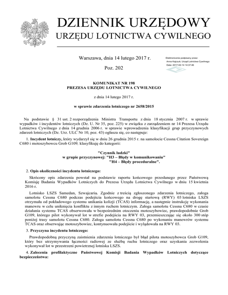 DZIENNIK URZĘDOWY URZĘDU LOTNICTWA CYWILNEGO Warszawa, dnia 14 lutego 2017 r. Elektronicznie podpisany przez: Anna Kajczuk; Urząd Lotnictwa Cywilnego Poz. 202 Data: 2017-02-14 14:37:46 KOMUNIKAT NR 198 PREZESA URZĘDU LOTNICTWA CYWILNEGO z dnia 14 lutego 2017 r. w sprawie zdarzenia lotniczego nr 2658/2015 Na podstawie § 31 ust. 2 rozporządzenia Ministra Transportu z dnia 18 stycznia 2007 r. w sprawie wypadków i incydentów lotniczych (Dz. U. Nr 35, poz. 225) w związku z zarządzeniem nr 14 Prezesa Urzędu Lotnictwa Cywilnego z dnia 14 grudnia 2006 r. w sprawie wprowadzenia klasyfikacji grup przyczynowych zdarzeń lotniczych (Dz. Urz. ULC Nr 10, poz. 43) ogłasza się, co następuje: 1. Incydent lotniczy, który wydarzył się w dniu 26 grudnia 2015 r. na samolocie Cessna Citation Sovereign C680 i motoszybowcu Grob G109, klasyfikuję do kategorii: "Czynnik ludzki" w grupie przyczynowej: "H3 – Błędy w komunikowaniu" "H4 – Błędy proceduralne". 2. Opis okoliczności incydentu lotniczego: Skrócony opis zdarzenia powstał na podstawie raportu końcowego przesłanego przez Państwową Komisję Badania Wypadków Lotniczych do Prezesa Urzędu Lotnictwa Cywilnego w dniu 15 kwietnia 2016 r. Lotnisko LSZS Samedan, Szwajcaria. Zgodnie z treścią zgłoszonego zdarzenia lotniczego, załoga samolotu Cessna C680 podczas podejścia końcowego na drogę startową (RWY) 03 lotniska LSZS otrzymała od pokładowego systemu unikania kolizji (TCAS) informację, a następnie instrukcję wykonania manewru w celu uniknięcia konfliktu z innym ruchem lotniczym. Załoga samolotu Cessna C680 w czasie działania systemu TCAS obserwowała w bezpośrednim otoczeniu motoszybowiec, prawdopodobnie Grob G109, którego pilot wykonywał lot w strefie podejścia na RWY 03, przemieszczając się około 300 stóp poniżej trasy samolotu Cessna C680. Załoga samolotu Cessna C680 po wykonaniu manewrów systemu TCAS oraz obserwując motoszybowiec, kontynuowała podejście i wylądowała na RWY 03. 3. Przyczyna incydentu lotniczego: Prawdopodobną przyczyną zaistnienia zdarzenia lotniczego był błąd pilota motoszybowca Grob G109, który bez utrzymywania łączności radiowej ze służbą ruchu lotniczego oraz uzyskania zezwolenia wykonywał lot w przestrzeni powietrznej lotniska LSZS. 4. Zalecenia profilaktyczne Państwowej Komisji Badania Wypadków Lotniczych dotyczące bezpieczeństwa: Dziennik Urzędowy Urzędu Lotnictwa Cywilnego –2– Poz. 202 Państwowa Komisja Badania Wypadków Lotniczych po zapoznaniu się ze zgromadzonymi w trakcie badania zdarzenia materiałami nie wydała zaleceń dotyczących bezpieczeństwa. Prezes Urzędu Lotnictwa Cywilnego Piotr Samson