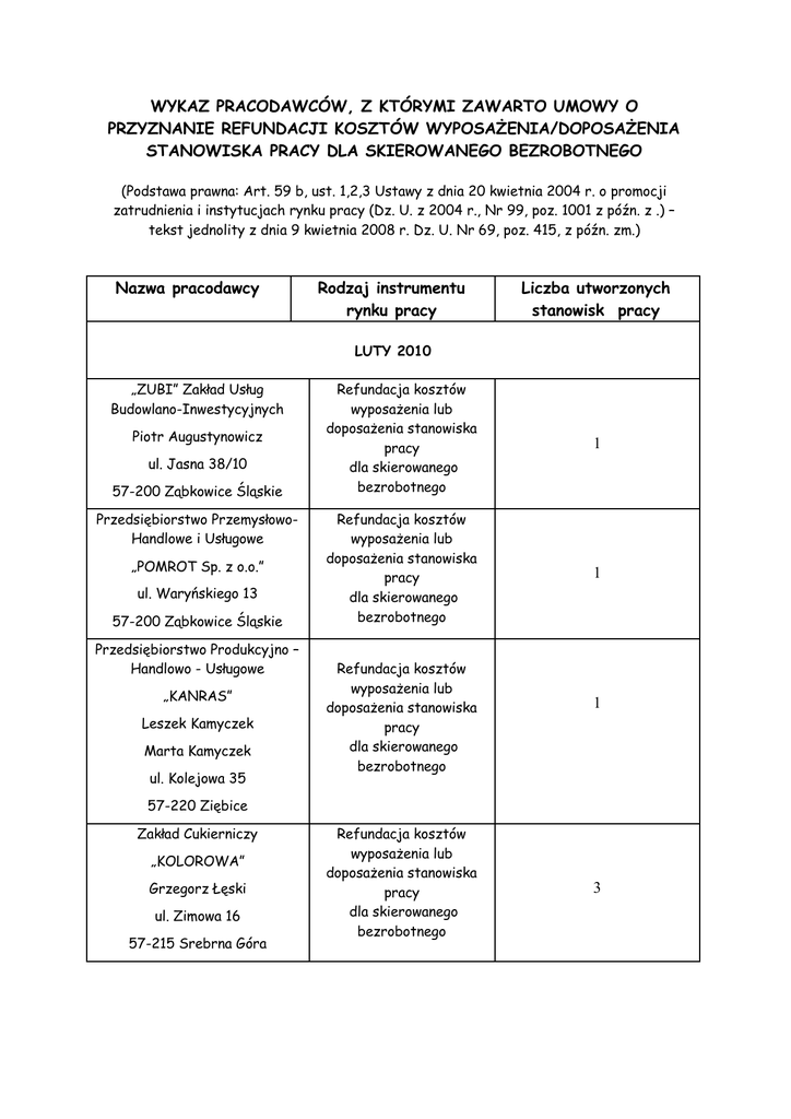 WYKAZ PRACODAWCÓW, Z KTÓRYMI ZAWARTO UMOWY O PRZYZNANIE REFUNDACJI KOSZTÓW WYPOSAŻENIA/DOPOSAŻENIA STANOWISKA PRACY DLA SKIEROWANEGO BEZROBOTNEGO (Podstawa prawna: Art. 59 b, ust. 1,2,3 Ustawy z dnia 20 kwietnia 2004 r. o promocji zatrudnienia i instytucjach rynku pracy (Dz. U. z 2004 r., Nr 99, poz. 1001 z późn. z .) – tekst jednolity z dnia 9 kwietnia 2008 r. Dz. U. Nr 69, poz. 415, z późn. zm.) Nazwa pracodawcy Rodzaj instrumentu rynku pracy Liczba utworzonych stanowisk pracy LUTY 2010 „ZUBI” Zakład Usług Budowlano-Inwestycyjnych Piotr Augustynowicz ul. Jasna 38/10 57-200 Ząbkowice Śląskie Przedsiębiorstwo PrzemysłowoHandlowe i Usługowe „POMROT Sp. z o.o.” ul. Waryńskiego 13 57-200 Ząbkowice Śląskie Przedsiębiorstwo Produkcyjno – Handlowo - Usługowe „KANRAS” Leszek Kamyczek Marta Kamyczek ul. Kolejowa 35 Refundacja kosztów wyposażenia lub doposażenia stanowiska pracy dla skierowanego bezrobotnego 1 Refundacja kosztów wyposażenia lub doposażenia stanowiska pracy dla skierowanego bezrobotnego 1 Refundacja kosztów wyposażenia lub doposażenia stanowiska pracy dla skierowanego bezrobotnego 1 57-220 Ziębice Zakład Cukierniczy „KOLOROWA” Grzegorz Łęski ul. Zimowa 16 57-215 Srebrna Góra Refundacja kosztów wyposażenia lub doposażenia stanowiska pracy dla skierowanego bezrobotnego 3