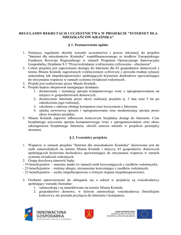 REGULAMIN REKRUTACJI I UCZESTNICTWA W PROJEKCIE "INTERNET DLA MIESZKAŃCÓW KRAŚNIKA" § 1. Postanowienia ogólne 1. Niniejszy regulamin określa warunki uczestnictwa i proces rekrutacji do projektu "Internet dla mieszkańców Kraśnika" współfinansowanego ze środków Europejskiego Funduszu Rozwoju Regionalnego w ramach Programu Operacyjnego Innowacyjna Gospodarka, Działanie 8.3 "Przeciwdziałanie wykluczeniu cyfrowemu - eInclusion". 2. Celem projektu jest zapewnienie dostępu do Internetu dla 65 gospodarstw domowych z terenu Miasta Kraśnik zagrożonych wykluczeniem cyfrowym z powodu trudnej sytuacji materialnej lub niepełnosprawności spełniających kryterium dochodowe upoważniające do otrzymania wsparcia w ramach systemu świadczeń rodzinnych . 3. Projekt jest realizowany przez Miasto Kraśnik. 4. Projekt będzie obejmował następujące działania: 1. dostarczenie i instalację sprzętu komputerowego wraz z oprogramowaniem na miejscu w gospodarstwach domowych, 2. dostarczenie Internetu przez okres realizacji projektu tj. 3 lata oraz 5 lat po zakończeniu jego realizacji, 3. szkolenie z zakresu obsługi komputera oraz korzystania z Internetu, 4. opiekę serwisową sprzętu i oprogramowania oraz modernizację sprzętu przez okres trwałości projektu. 5. Miasto Kraśnik zapewni odbiorcom końcowym bezpłatny dostęp do Internetu. Czas bezpłatnego użyczenia sprzętu komputerowego wraz z oprogramowaniem oraz okres udostępnienia bezpłatnego Internetu, określi umowa udziału w projekcie pomiędzy stronami. § 2. Uczestnicy projektu 1. Wsparcie w ramach projektu "Internet dla mieszkańców Kraśnika" skierowane jest do osób zamieszkałych na terenie Miasta Kraśnik i dotyczy 65 gospodarstw domowych spełniających kryterium dochodowe upoważniające do otrzymania wsparcia w ramach systemu świadczeń rodzinnych. 2. Grupę docelową stanowić będą: - 19 beneficjentów – samotne matki (w ramach osób korzystających z zasiłków rodzinnych); - 23 beneficjentów – rodziny ubogie, niezamożne korzystające z zasiłków rodzinnych; - 23 beneficjentów – osoby niepełnosprawne o różnym stopniu niepełnosprawności. 3. Osobami uprawnionymi do ubiegania się o udział w projekcie są wnioskodawcy spełniający warunki formalne: 1. zamieszkują i są zameldowane na terenie Miasta Kraśnik, 2. gospodarstwo domowe, w którym zamieszkuje wnioskodawca (beneficjent końcowy), nie posiada przyłącza do Internetu i komputera, 3. miesięczny dochód na osobę w gospodarstwie domowym beneficjenta nie przekracza kryterium uprawniającego do uzyskania wsparcia na podstawie ustawy o świadczeniach rodzinnych. 4. Beneficjent końcowy zobowiąże się do stosowania zasad określonych w niniejszym regulaminie. § 3. Zasady rekrutacji 1. Pierwszym etapem rekrutacji jest utworzenie listy zainteresowanych uczestnictwem w projekcie na podstawie weryfikacji kryteriów formalnych przedłożonych dokumentów aplikacyjnych - formularza zgłoszeniowego (załącznik do regulaminu) wraz z niezbędnymi załącznikami oraz analizy sytuacji finansowej gospodarstwa domowego. 2. Rekrutacja prowadzona będzie przez trzyosobowy Zespół rekrutacyjny powołany stosownym zarządzeniem Burmistrza Miasta Kraśnik. 3. Kolejnym etapem rekrutacji jest podjęcie decyzji przez Zespół rekrutacyjny o zakwalifikowaniu się do udziału w projekcie. 4. O zakwalifikowaniu się do udziału w projekcie uczestnik będzie poinformowany pisemnie lub telefonicznie. 5. Wybór beneficjentów końcowych odbędzie się na podstawie wysokości dochodów, wybierając od najniższych z pierwszeństwem dla rodzin posiadających dzieci w wieku szkolnym. Pozostałe osoby umieszczone zostaną na liście rezerwowej. 6. W przypadku rezygnacji beneficjenta końcowego z udziału w projekcie wolne miejsce zajmuje pierwsza osoba z listy rezerwowej. 7. Po weryfikacji formularzy Zespół rekrutacyjny sporządzi listę beneficjentów końcowych i przedłoży ją do zatwierdzenia Burmistrzowi Miasta Kraśnik. 8. Formularze zgłoszeniowe wraz z załącznikami można będzie składać do ….. grudnia 2011 roku. W przypadku nie wykorzystania limitu także po wskazanym terminie. 9. Formularz należy wypełnić, podpisać oraz dostarczyć osobiście lub pocztą (decyduje data wpływu) do siedziby Miejskiego Ośrodka Pomocy Społecznej w Kraśniku ul. Grunwaldzka 4a, 23-210 Kraśnik. 10. Każde gospodarstwo domowe może złożyć tylko jeden formularz zgłoszeniowy do projektu. 11. Do formularza należy dołączyć: 1. kserokopię dokumentu stwierdzającego tożsamość, 2. zaświadczenie z Miejskiego Ośrodka Pomocy Społecznej w Kraśniku o pobieraniu świadczenia rodzinnego z uwzględnieniem średniego dochodu na członka rodziny oraz liczbę osób we wspólnym gospodarstwie domowym. 3. oświadczenie beneficjenta ostatecznego, iż nie jest związany umową z dostawcą usług internetowych, 4. oświadczenie o niekorzystaniu z innego projektu w ramach Działania 8.3 "Przeciwdziałanie wykluczeniu cyfrowemu e-Inclusion". 12. Złożenie formularza zgłoszeniowego nie jest jednoznaczne z przyjęciem beneficjenta do projektu. 13. W przypadku zakwalifikowania do udziału w projekcie mniejszej niż zaplanowana liczba osób, Burmistrz Miasta Kraśnik może ogłosić rekrutację dodatkową i zmienić kryteria wyboru beneficjentów końcowych. § 4. Prawa i obowiązki beneficjenta ostatecznego 1. Przystępujący do projektu członek gospodarstwa domowego zobowiązuje się do: 1. nieodpłatnego przyjęcia do użytkowania przez okres realizacji i trwania sprzętu komputerowego wraz z oprogramowaniem i dostępem do Internetu, 2. niezbywania otrzymanego sprzętu (uczestnik ponosi odpowiedzialność finansową za ewentualne zaginięcie lub zniszczenie sprzętu z jego winy), 3. udostępnianie sprzętu na żądanie realizatora projektu w celu jego serwisowania oraz przeprowadzania kontroli, 4. uczestniczenia w szkoleniach związanych z nabyciem umiejętności obs