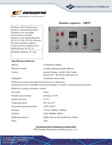 Detektor argonowy AR15 Detektory AR15 wykorzystuje zmiany w luminescencji argonu. Technika ta ma szczególne zastosowanie w kontroli zanieczyszczeń argonu takich jak: H2, O2, N2, CH4, CO, CO2. Pozwala również na pomiar i kontrolę zanieczyszczeń w innych gazach takich jak m.in. H2, O2, N2. Moduł do zabudowy 19” rack. Specyfikacja techniczna Zakresy od 50 ppb do 100ppm Mierzone związki wszelkie zanieczyszczenia śladowe Czułość poniżej 0,01ppm – dla H2, CH4, CnHm poniżej 0,02 – dla innych zanieczyszczeń Dokładność 2% pełnego zakresu skali Możliwość ręcznego ustawiania linii podstawowej / odniesienia (zautomatyzowane w przypadku zastosowania jednego z systemów automatycznego sterownia) Możliwość ręcznego ustawiania czułości Gaz nośny Argon Przepływ gazu nośnego pomiędzy 46 l/h Sygnał wyjściowy 010 V Temperatura pracy 20°C do 25°C Temperatura przechowywania 20°C do 60°C Wymiary 177mm x 480mm x 400mm Zasilanie 220V, 50/60Hz, 400VA Podłączenia gazowe gładka rurka ze stali nierdzewnej, 4/2mm Waga 15kg Przedstawiciel firmy Orthodyne na terenie Polski: SPA Systemy PomiarowoAnalityczne sp. z o.o.