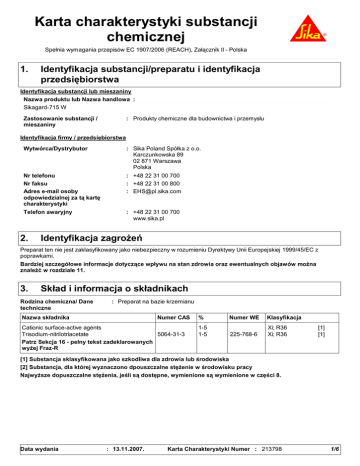 Karta charakterystyki substancji chemicznej Spełnia wymagania przepisów EC 1907/2006 (REACH), Załącznik II - Polska 1. Identyfikacja substancji/preparatu i identyfikacja przedsiębiorstwa Identyfikacja substancji lub mieszaniny Nazwa produktu lub Nazwa handlowa : Sikagard-715 W Zastosowanie substancji / mieszaniny : Produkty chemiczne dla budownictwa i przemysłu Identyfikacja firmy / przedsiębiorstwa Wytwórca/Dystrybutor : Sika Poland Spółka z o.o. Karczunkowska 89 02 871 Warszawa Polska Nr telefonu Nr faksu Adres e-mail osoby odpowiedzialnej za tą kartę charakterystyki : +48 22 31 00 700 : +48 22 31 00 800 : [email protected] Telefon awaryjny : +48 22 31 00 700 www.sika.pl 2. Identyfikacja zagrożeń Preparat ten nie jest zaklasyfikowany jako niebezpieczny w rozumieniu Dyrektywy Unii Europejskiej 1999/45/EC z poprawkami. Bardziej szczegółowe informacje dotyczące wpływu na stan zdrowia oraz ewentualnych objawów można znaleźć w rozdziale 11. 3. Skład i informacja o składnikach Rodzina chemiczna/ Dane techniczne : Preparat na bazie krzemianu Nazwa składnika Numer CAS Cationic surface-active agents Trisodium-nitrilotriacetate 5064-31-3 Patrz Sekcja 16 - pełny tekst zadeklarowanych wyżej Fraz-R % Numer WE Klasyfikacja 1-5 1-5 225-768-6 Xi; R36 Xi; R36 [1] [1] [1] Substancja sklasyfikowana jako szkodliwa dla zdrowia lub środowiska [2] Substancja, dla której wyznaczono dpouszczalne stężenie w środowisku pracy Najwyższe dopuszczalne stężenia, jeśli są dostępne, wymienione są wymienione w części 8. Data wydania : 13.11.2007. Karta Charakterystyki Numer : 213798 1/6 Sikagard-715 W 4. 13.11.2007 2/6 Pierwsza pomoc Pierwsza pomoc Wdychanie Spożycie : Bezzwłocznie zasięgnąć porady medycznej. Może być niebezpiecznym dla osoby udzielającej sztucznego oddychania usta usta. : Bezzwłocznie zasięgnąć porady medycznej. Nie wywoływać wymiotów, jeśli nie jest to zalecane przez personel medyczny. Oparzenia chemikaliami powinny być niezwłocznie opatrzone przez lekarza. Zapewnić otwartą wentylację. Kontakt ze skórą : Bezzwłocznie zasięgnąć porady medycznej. Spłukać skażoną skórę dużą ilością wody. Zdjąć skażoną odzież i buty. Należy dokładnie zmyć zanieczyszczone ubranie wodą przed jego zdjęciem lub założyć rękawice. Należy kontynuować płukanie przez co najmniej 10 minut. Oparzenia chemikaliami powinny być niezwłocznie opatrzone przez lekarza. Kontakt z okiem : Bezzwłocznie zasięgnąć porady medycznej. Natychmiast przepłukać oczy dużą ilością wody, od czasu do czasu podnosząc górna i dolna powiekę. Usunąć szkła kontaktowe jeżeli są. Należy kontynuować płukanie przez co najmniej 10 minut. Oparzenia chemikaliami powinny być niezwłocznie opatrzone przez lekarza. Informacje dla lekarza : W razie wdychania produktów rozkładu powstających podczas pożaru, wystąpienie objawów może być opóźnione. Narażona osoba może wymagać nadzoru lekarskiego przez 48 godzin. Bardziej szczegółowe informacje dotyczące wpływu na stan zdrowia oraz ewentualnych objawów można znaleźć w rozdziale 11. 5. Postępowanie w przypadku pożaru Środki gaśnicze Odpowiednie Nieodpowiednie Szczególne ryzyko narażenia Niebezpieczne produkty spalania Specjalne wyposażenie ochronne dla strażaków 6. : Użyć środka gaśniczego, właściwego dla otaczającego ognia. : Nie znane. : W ogniu oraz w razie ogrzania dochodzi do wzrostu ciśnienia i pojemnik może wybuchnąć. : Produkty rozkładu mogą zawierać następujące materiały: tlenki węgla tlenki azotu tlenek/tlenki metalu : Strażacy powinni nosić odpowiednie urządzenia ochronne oraz indywidualne aparaty oddechowe (SCBA) z maska zakrywającą całą twarz działająca przy dodatnim ciśnieniu. Postępowanie w przypadku niezamierzonego uwolnienia do środowiska Osobiste środki ostrożności : Nie udzielać zezwolenia na wejście - niepotrzebnemu i nie zabezpieczonemu personelowi. Nie dotykać, ani nie przechodzić, po rozlanym materiale. Nosić właściwe wyposażenie ochrony osobistej (patrz część 8). Zabezpieczenia środowiskowe : Należy unikać rozprzestrzeniania się rozlanego materiału jego spływania do gleby lub kontaktu z glebą, ciekami wodnymi, drenami i kanalizacją. Należy poinformować odpowiednie władze, w przypadku kiedy produkt spowodował zanieczyszczenie środowiska (ścieków, cieków wodnych, gleby lub powietrza). Duże rozlanie : Zatrzymać wyciek, jeśli jest to możliwe bez narażenia na niebezpieczeństwo. Wynieść pojemniki z obszaru rozlania. Zabezpieczyć ujścia kanalizacji, instalacji wodnych oraz wejścia do piwnic i obszarów zamkniętych. Należy zmyć rozlany/rozsypany materiał do oczyszczalni ścieków lub postępować w następujący sposób. Rozlane lub rozsypane substancje, należy zebrać za pomocą niepalnych substancji, takich jak: piasek, ziemia, wermikulit, ziemia okrzemkowa. Następnie umieścić w pojemnikach i utylizować zgodnie z miejscowymi przepisami (patrz sekcja 13). Małe rozlanie : Zatrzymać wyciek, jeśli jest to możliwe bez narażenia na niebezpieczeństwo. Wynieść pojemniki z obszaru rozlania. Zaabsorbować za pomocą obojętnego materiału i umieścić w odpowiednim pojemniku na odpady. Data wydania : 13.11.2007. Karta Charakterystyki Numer : 213798 2/6 Sikagard-715 W 7. 13.11.2007 3/6 Postępowanie z substancją/preparatem i jej/jego magazynowanie Posługiwanie się : Nosić właściwe wyposażenie ochrony osobistej (patrz część 8). Należy zabronić spożywania pokarmów i napojów oraz palenia tytoniu w obszarze, w którym ten materiał jest przechowywany, przemieszczany i przetwarzany. Pracownicy powinni umyć ręce i twarz przed jedzeniem, piciem i paleniem tytoniu. Nie dopuścić, do przedostania się do oczu, na skórę lub ubranie. Jeśli w normalnych warunkach użytkowania materiał stanowi zagrożenie dla dróg oddechowych, należy stosować odpowiednią wentylację lub nosi