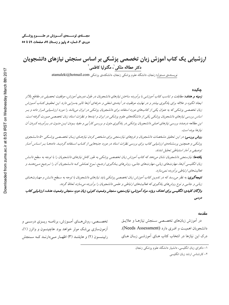 ƾƨººƃżěƭƺºººººƬƗŹŵƁŻƺºººƯōƽƶƘº ººſƺţƽƶƬ ºººŬƯ ÒÒŚţÑÖšŚŰƠƇÕÖƱŚŤƀƯŻƹżǀƿŚěÒƵŹŚưƃÐƽƵŹƹŵ Downloaded from zums.ac.ir at 8:53 IRST on Wednesday March 8th 2017 ƱŚƿƺŬƄƳřŵƽŚƷŻŚǀƳƂŬƴſŽŚſřźŝƾĪƃżěƾƈƈŴţƱŚŝŻƁŻƺƯōśŚŤĩĨƿƾŝŚǀƃŻŹř çƾưƓŚĩŚǀƫƺƴĮƯæƾĪƬƯƶƫřŚƐƗźŤĩŵ [email protected] ƾĪƃżěƽƵŶĪƄƳřŵ ƱŚŬƳŻƾĪƃżěƭƺƬƗƵŚĮƄƳřŵƱŚŬƳŻƩƺŘƀƯƽƵŶƴƀƿƺƳ ƵŶǀĪģ źţLJŚŝƖƏŚƤƯŹŵƾƬǀƈŰţŢǀƤƟƺƯƁŻƺƯōƽƵŹƹŵƩƺƏŹŵƱŚ ƿƺŬƄƳřŵƽŚƷŻŚǀƳƲŤųŚſƵŵŹƹōźŝŚŝƾƃŻƺƯōśŚŤĩŜſŚƴţƹŢƤŝŚƐƯƝŶƷƹƶƴǀƯŻ ƁŻƺºƯōśŚºŤĩƢºǀƤŰţƲƿřŵŹřŵƾƿřżſƶŝźǀŧŚţŚƷƱōƽřƶƟźůƹƾƬƜƃƽƵŶƴƿōŹŵŢǀƤƟƺƯŢƿŚƸƳŹŵƹźŤƄǀŝƽźǀĭŵŚƿƽřźŝƶƣLjƗƹƵżǀĮƳřŵŚŬƿř źºŝƹƵŵřŵŹřźºƣƾŝŚǀºƃŻŹřŵŹƺƯřŹŶƃŚŝƾ ƯƱřźƿřŹŵƾĪƃżěƱŚƿƺŬƄƳřŵƽřźŝƵŵŚƠŤſřŵŹƺƯƽŚƷśŚŤĩŻřƾĪƿƱřƺƴƗƶŝƶĩƾĪƃżěƾƈƈŴţƱŚŝŻ ŢſřƶŤƟźĭšŹƺƇƾƈƈŴţƱŚŝŻŵŚŤſřšřźƔƳƹŚƷƵŶ ƿřƹƱřźƿřŹŵƾĪƃżěƭƺƬƗƽŚƷƵŚĮƄƳřŵŻř ƾĪƿƾĪƃżěƱŚƿƺŬƄƳřŵƽŚƷŻŚǀƳƾſŹźŝŽŚſř ƱōƱŵźºĩƵŵŹƹōźºŝŹŵƱƺºŤƯƲºƿřƱŵƺºŝŶǀƠƯƹƾƿōŹŚĩƾſŹźŝƹƱƺŤƯƽźǀĭŵŚƿŹŵƾĪƃżěƱŚƿƺŬƄƳřŵƾƬƇřƽŚƷŻŚǀƳƾſŹźŝŵŶƇŹŵƶƘƫŚƐƯƲƿř ŢſřƵŵƺŝŚƷŻŚǀƳ ƽƺŬƄºƳřŵêåƾĪºƃżěƾƈºƈŴţƱŚºŝŻƽŚºƷŻŚǀƳƱŵźĩƆŴƄƯƽřźŝƾŬƴſŻŚǀƳƽŚƷƭźƟƹƱŚƿƺŬƄƳřŵšŚƈŴƄƯƢǀƤŰţƲƿřŹŵƾſŹźŝƁƹŹ ŹŚºƯōŽŚºſřźºŝŚºƷƵŵřŵ ŶºƿŵźĭƵŵŚƠŤºſřśŚºŤĩŻřƾƿŚƷƶŞƴūŵŹƺƯŹŵŵŚŤſřšřźƔƳƾſŹźŝƽřźŝśŚŤĩƾŝŚǀƃŻŹřƽƶƯŚƴƄſźěƲǀƴĤưƷƹƾĪƃżě ŶƳŶƃƪǀƬŰţƾƏŚŞƴŤſřŹŚƯōƹƾƠǀƇƺţ ƂºƳřŵŮƐſƶŝƶūƺţŚŝřŹƱŚƿƺŬƄƳřŵƽŚƷŻŚǀƳƪƯŚĩŹƺƏƶŝƾĪƃżěƾƈƈŴţƱŚŝŻƁŻƺƯōśŚŤĩƶĩŶƷŵƾ ƯƱŚƄƳƱŚƿƺŬƄƳřŵƾŬƴſŻŚǀƳŚƷƶŤƟŚ ƿ ƹŶºƴƷŵƾ ºƯŮǀūźºţřŹƱōƱŚƿƺŬƄºƳřŵƶºĩƾƬƯŚºƘţƕƺºƳŮºūŹřƽźǀĭŵŚºƿƽŚƷƁƹŹƾŞƳŚūƽŚƷšŹŚƸƯƾƳŚŝŻƽŚƷšŹŚƸƯŚƷƱōƾƀǀƬĮƳřƱŚŝŻ ŵŻŚſƾ ưƳƵŵŹƹōźŝƾƏŚŞţŹřƽŚƷŢ ǀƫŚƘƟ ƽŚºƷšŹ ŚºƸƯƹƂºƳřŵŮƐºſƶŝƶūƺţŚŝƱŚƿƺŬƄƳřŵƽŚƷŻŚǀƳŶƿŚŝƾĪƃżěƾƈƈŴţƱŚŝŻƁŻƺƯōśŚŤĩƲƿƹŶţŹŵƶĩŶſŹƾ ƯźƔƳƶŝƽźǀĭƶŬ ǀŤƳ ŵŵźĭƑŚŰƫŵŻŚſƾ ƯƵŵŹƹōźŝřŹƱŚƿƺŬƄƳřŵƾưƬƗƹƾƏŚŞţŹřƽŚƷŢ ǀƫŚƘƟƶĩƽźǀĭŵŚƿƽŚƷƁƹŹƕƺƳƹ ƾŞƳŚūƹƾƳŚŝŻ śŚŤĩƾŝŚǀƃŻŹřƝŶƷŢǀƘƋƹƂŬƴſƭƹŵƱŚŝŻƾƳƺƴĩŢǀƘƋƹƂŬƴſƾŬƴſŻŚǀƳƾƃŻƺƯōŵřƺƯƵĦƿƹƝřŶƷřƽřźŝƾƀǀƬĮƳřƽŶǀƬĩƱŚĭĥřƹ ƾſŹŵ ƹƾººſŹŵƽżººƿŹƶººƯŚƳźŝƁŻƺººƯōƽŚººƷƁƹŹ ƾƈººƈŴţ ƶƯŶƤƯ ƢºƿLjƗƹŚºƷŻŚǀƳƂŬƴºſƾƈºƈŴţƽŚƷƱŚŝŻƁŻƺƯōŹŵ ƂŬƴººſƶººĩŶººƳŹřŵƾ º ƯŹŚººƸƓřèŶººƴƬƿŚƷƹçƱƺƀººƴǀŝřŹ ƽŚºƷƱŚºŝŻ ƾºƃŻƺƯō ƽŚºƷśŚŤĩśŚŴŤƳřŹŵŚƷŻŚǀƳƲƿřħŹŵ æŻźţřƹƹƱƺƀƴǀģŚƷŵƺŝŶƷřƺųźŧƺƯĨƃƾ ŝ ƽŻŚſƱƺƯŻō (Needs Assessment)ŵŹřŵƽźºƟřƹŢºǀưƷřƱŚƿƺŬƄƳřŵ ƱŚŬƳŻƾĪƃżěƭƺƬƗƵŚĮƄƳřŵŹŚǀƄƳřŵƾƀǀƬĮƳřƱŚŝŻƽřźŤƧŵæ ƾƀǀƬĮƳřƱŚŝŻŶƃŹřŽŚƴƃŹŚĩç ƾĪƃżěƾƈƈŴţƱŚŝŻƁŻƺƯōśŚŤĩĨƿƾŝŚǀƃŻŹř ƱŚƿƺŬƄƳřŵŹŵƽźǀĭŵŚƿŶƴƿōźƟƪǀƸƀţƵĦƿƹƝřŶƷřƶŝƾŝŚǀŤſŵ ƾƀºǀƬĮƳřƱŚºŝŻƽźǀĭŵŚƿ ŻřřŹŚƷƱōƝŶƷƱŚƿƺŬƄƳřŵ ƽŚƷŻŚǀƳ Ŷƴĩƾ ƯŵŚƸƴƄǀěƾƈƈŴţƱŚŝŻƽŚƷśŚŤĩ ƽŚºƷśŚºŤĩƶºŝŻŚºǀƳŚºƷŻŚǀƳƲºƿřŻřƾºĪƿŶƄºŴŝƾ Ư ƽźŤƄǀŝ ƾŝŚǀºƃŻŹřƽřźºŝřŹƱŚƿƺŬƄºƳřŵ ƽřźºŝ ƽźǀĭŵŚƿƽŻŚſƶƴǀƯŻ ƹ ĨƿśŚŴŤƳřƹƪǀƬŰţƽřźŝƭŚĭƶŝƭŚĭŶƴƿōźƟĨƿíźĮƴƿŹŚĭ Downloaded from zums.ac.ir at 8:53 IRST on Wednesday March 8th 2017 ̋˹ śŚºŤĩŜſŚƴţŶƴƿōźƟƲƿřƶƧŢſřƵŵźĩƶƋźƗřŹƾſŹŵśŚŤĩ ƱŚĭŶºƳźǀĭŵŚƿ ƝřŶºƷřƹƢºƿLjƗƲºſƾºĮƴƷźƟ ƽŚƷƶƴ ǀƯŻŚŝ ƾºſŹŵŵřƺƯƽŶƴŝƶūŹŵƾƳŚŝŻƽŚƷšŹŚƸƯŶǀƫƺţŹŵƾƄŴŝźŧř ŢºưǀƣƪºŨƯƾºƬưƗŦºůŚŞƯƹŢŴºſƶŝƵŵŚſŻřšŚƴƿźưţƹ ŵźǀĭƾƯźŝŹŵřŹ ƵźǀƛƹƭřƹŵŢǀƠǀĩ ƲƿřƶŤƟźĭŹřźƣƾſŹźŝŵŹƺƯƹŭźƐƯƢǀƤŰţƲƿřŹŵƶĩ ƾƫřƺſ ƽŚºƷŻŚǀƳƾĪºƃżěƱŚƿƺŬƄºƳřŵƽřźŝ ƾƀǀƬĮƳřśŚŤĩŚƿōƶĩ ŵƺŝ ƹƶºƿŚěƲǀºƴĤưƷŶºƴĩƾ ºƯƲǀƯŚţřŹƾĪƃżěƱŚƿƺŬƄƳřŵƾƳŚŝŻ śŚºŤĩƶºĩŶºƿŵźĭŹřƺŤºſřŢºŞŨƯƶǀƋźƟƲƿřźŝƢǀƤŰţŽŚſř ƱŚƿƺŬƄºƳřŵ ƾƳŚºŝŻ ƽŚƷŻŚǀƳ ƾĪƃżěƱŚƿƺŬƄƳřŵ ƽřźŝ ƾƀǀƬĮƳř ƾſŹźŝƪƯŚƃƢǀƤŰţƝřŶƷřƖƣřƹŹŵŶƴĩƾ ƯƲǀƯŚţřŹƾĪƃżě śŚºŤĩ ƽřƺºŤŰƯŚºŝƱŚƿƺŬƄƳřŵ ƾƳŚŝŻ ƽŚƷŻŚǀƳƱŵřŵŢƤŝŚƐƯƹ ŚºƷŻŚǀƳƲƿřƱŶƄƳƵŵŹƹōźŝŚƿƱŶƃƵŵŹƹōźŝƾſŹźŝƹźƔƳŵŹƺƯ ŵƺŝƵŶƃžƿŹŶţśŚŤĩŜƫŚƐƯŚŝ ƾſŹźŝƁƹŹ ŹŵƾƈºƈŴţƱŚºŝŻŵŚŤºſřĨƿƹƾĪƃżěƽƺŬƄƳřŵƵŚŬƴě ƹźºŤųŵçìŻřƪĪƄºŤƯƱŚƿƺŬƄƳřŵŶƳŵźĩŢĩźƃƶƘƫŚƐƯƲƿř ƺƌºƗŽŹŵŵŚŤºſřŶºƳŵƺŝƩŚºſçæƾƴºſƲǀĮƳŚǀƯŚŝźƀěçè ƲºƿřŹŵŵƺºŝžƿŹŶţƽƶƤŝŚſƩŚſççŚŝƵŚĮƄƳřŵƾưƬƗšŚǀ