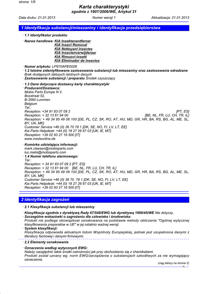 36.0.2 strona: 1/6 Karta charakterystyki zgodnie z 1907/2006/WE, Artykuł 31 Data druku: 21.01.2013 Numer wersji 1 Aktualizacja: 21.01.2013 1 Identyfikacja substancji/mieszaniny i identyfikacja przedsiębiorstwa · 1.1 Identyfikator produktu · Nazwa handlowa: KIA Insektenentferner KIA Insect Removal KIA Nettoyant insectes KIA Insectenverwijderaar KIA Rimuovi-insetti KIA Eliminador de insectos · Numer artykułu: LP970APE002K · 1.2 Istotne zidentyfikowane zastosowania substancji lub mieszaniny oraz zastosowania odradzane Brak dostępnych dalszych istotnych danych · Zastosowanie substancji / preparatu Środek czyszczący · 1.3 Dane dotyczące dostawcy karty charakterystyki · Producent/Dostawca: Mobis Parts Europe N.V. Bosstraat 52, B-3560 Lummen Belgium Tel.: Reception: +34 91 83 07 09 2 [PT, ES] Reception: + 32 13 61 94 00 [BE, NL, FR, LU, CH, TR, IL] Reception: + 49 34 95 49 06 100 [DE, PL, CZ, SK, RO, AT, HU, MD, GR, HR, BA, RS, BG, AL, ME, SL, BY, UA, MK] Customer Service +46 (0) 36 70 78 1 [DK, SE, NO, FI, LV, LT, EE] Kia Parts Helpdesk: +44 (0) 18 27 26 67 03 [UK, IE, MT] Reception: +39 02 93 27 16 500 [IT] www.msdsonline.de · Komórka udzielająca informacji: [email protected] [email protected] · 1.4 Numer telefonu alarmowego: Tel.: Reception: + 34 91 83 07 09 2 [PT, ES] Reception: + 32 13 61 94 00 [BE, NL, FR, LU, CH, TR, IL] Reception: + 49 34 95 49 06 100 [DE, PL, CZ, SK, RO, AT, HU, MD, GR, HR, BA, RS, BG, AL, ME, SL, BY, UA, MK] Customer Service +46 (0) 36 70 78 1 [DK, SE, NO, FI, LV, LT, EE] Kia Parts Helpdesk: +44 (0) 18 27 26 67 03 [UK, IE, MT] Reception: +39 02 93 27 16 500 [IT] 2 Identyfikacja zagrożeń · 2.1 Klasyfikacja substancji lub mieszaniny · Klasyfikacja zgodnie z dyrektywą Rady 67/548/EWG lub dyrektywą 1999/45/WE Nie dotyczy. · Szczególne wskazówki o zagrożeniu dla człowieka i środowiska: Produkt nie podlega obowiązkowi oznakowania na podstawie metody obliczania "Ogólnej wytycznej klasyfikowania preparatów w UE" w jej ostatnio ważnej wersji. · System klasyfikacji: Klasyfikacja odpowiada aktualnym listom Wspólnoty Europejskiej, jednak jest uzupełniona danymi z literatury fachowej i danymi firmowymi. · 2.2 Elementy oznakowania · Oznaczenia według wytycznych EWG: Należy uwzględnić takie środki ostrożności jak przy obchodzeniu się z chemikaliami. Produkt został uznany wg. norm EWG/zarządzenia o substancjach szkodliwych za nie wymagający oznaczenia. (ciąg dalszy na stronie 2) PL 36.0.2 strona: 2/6 Karta charakterystyki zgodnie z 1907/2006/WE, Artykuł 31 Data druku: 21.01.2013 Numer wersji 1 Aktualizacja: 21.01.2013 Nazwa handlowa: KIA Insektenentferner KIA Insect Removal KIA Nettoyant insectes KIA Insectenverwijderaar KIA Rimuovi-insetti KIA Eliminador de insectos (ciąg dalszy od strony 1) · Szczególne oznaczenia określonych preparatów: Karta charakterystyki dostępna na żądanie użytkownika prowadzącego działalność zawodową. · 2.3 Inne zagrożenia · Wyniki oceny właściwości PBT i vPvB · PBT: Nie nadający się do zastosowania. · vPvB: Nie nadający się do zastosowania. 3 Skład/informacja o składnikach · 3.2 Charakterystyka chemiczna: Mieszaniny · Opis: Mieszanka z niżej wymienionych składników z bezpiecznymi domieszkami. · Składniki niebezpieczne: CAS: 5064-31-3 trisodium nitrilotriacetate Xn R22-40; Xi R36 EINECS: 225-768-6 Rakotw. Kat. 3 Carc. 2, H351; Acute Tox. 4, H302; Eye Irrit. 2, H319 · Wskazówki dodatkowe: Pełna treść przytoczonych wskazówek dotyczących zagrożeń znajduje się w rozdziale 16. 1-2,5% 4 Środki pierwszej pomocy · 4.1 Opis środków pierwszej pomocy · Wskazówki ogólne: Środki specjalne nie są konieczne. · Po wdychaniu: Dostarczyć świeże powietrze, w razie dolegliwości wezwać lekarza. · Po styczności ze skórą: Ogólnie produkt nie działa drażniąco na skórę. · Po styczności z okiem: Płukać oczy z otwartą powieką przez kilka minut pod bieżącą wodą. · Po przełknięciu: Przy trwałych dolegliwościach porozumieć się z lekarzem. · 4.2 Najważniejsze ostre i opóźnione objawy oraz skutki narażenia Brak dostępnych dalszych istotnych danych · 4.3 Wskazania dotyczące wszelkiej natychmiastowej pomocy lekarskiej i szczególnego postępowania z poszkodowanym Brak dostępnych dalszych istotnych danych 5 Postępowanie w przypadku pożaru · 5.1 Środki gaśnicze · Przydatne środki gaśnicze: CO2, proszek gaśniczy lub strumień wody. Większy pożar zwalczać strumieniem wody lub pianą odporną na działanie alkoholu. · 5.2 Szczególne zagrożenia związane z substancją lub mieszaniną Brak dostępnych dalszych istotnych danych · 5.3 Informacje dla straży pożarnej · Specjalne wyposażenie ochronne: Środki specjalne nie są konieczne. 6 Postępowanie w przypadku niezamierzonego uwolnienia do środowiska · 6.1 Indywidualne środki ostrożności, wyposażenie ochronne i procedury w sytuacjach awaryjnych Nie konieczne. (ciąg dalszy na stronie 3) PL 36.0.2 strona: 3/6 Karta charakterystyki zgodnie z 1907/2006/WE, Artykuł 31 Data druku: 21.01.2013 Numer wersji 1 Aktualizacja: 21.01.2013 Nazwa handlowa: KIA Insektenentferner KIA Insect Removal KIA Nettoyant insectes KIA Insectenverwijderaar KIA Rimuovi-insetti KIA Eliminador de insectos (ciąg dalszy od strony 2) · 6.2 Środki ostrożności w zakresie ochrony środowiska: Rozcieńczyć dużą ilością wody. Nie dopuścić do przeniknięcia do kanalizacji /wód powierzchniowych /wód gruntowych. · 6.3 Metody i materiały zapobiegające rozprzestrzenianiu się skażenia i służące do usuwania skażenia: Zebrać za pomocą materiału wiążącego ciecze (piasek, ziemia okrzemkowa, materiał wiążący kwasy, materiał wiążący uniwersalny, trociny). · 6.4 Odniesienia do innych sekcji Nie powstają żadne materiały niebezpieczne. Informacje na temat bezpiecznej obsługi patrz rozdział 7. Informacje na temat osobistego wyposażenia ochronnego patrz rozdział 8. Informacje na temat ut