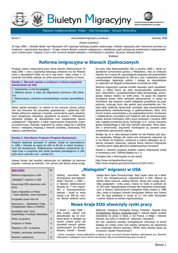 Numer 7 www.biuletynmigracyjny.uw.edu.pl Czerwiec 2006 Drodzy Czytelnicy! W maju 2006 r. Ośrodek Badań nad Migracjami UW rozpoczął realizację projektu badawczego „Polityka migracyjna jako instrument promocji zatrudnienia i ograniczania bezrobocia”. W jego ramach Biuletyn zostanie wzbogacony o dodatkową część poświęconą problematyce międzynarodowych rynków pracy i migracji. A już w tym numerze dodatek specjalny z informacjami o projekcie. Życzymy ciekawej lektury! Redakcja Reforma imigracyjna w Stanach Zjednoczonych Przyjęcie ustawy imigracyjnej przez Senat Stanów Zjednoczonych 25 maja 2006 r. wraz z poprawką dotyczącą zniesienia wiz dla Polaków (choć o obywatelach Polski nie ma w niej mowy - patrz ramka 1 i 2) wznieciło nad Wisłą nadzieje na rychłe bezwizowe podróże za Ocean. Ramka 1. Warunki udziału w próbnym 2-letnim programie bezwizowym do USA 1. Członkostwo w Unii Europejskiej. 2. Militarna pomoc w Iraku lub Afganistanie (minimum 300 żołnierzy). 3. Nienaruszanie „interesów amerykańskiego wymiaru sprawiedliwości”. Należy jednak pamiętać, że ustawa ta ma znacznie szerszy zakres. Jest ona kluczowa dla przyszłości gospodarczej i społecznej USA. Debata polityczna obejmuje 3 kwestie: wzmocnienie granic południowych (propozycja rozbudowy ogrodzenia na granicy z Meksykiem), ułatwienie dostępu do obywatelstwa oraz uregulowanie statusu „nielegalnych” imigrantów, a także wypracowanie programów migracji pracowniczej. Dyskusja i poprawki do ustawy wiążą się w głównej mierze z nielegalną imigracją z Ameryki Łacińskiej, stanowiącą 75% napływu cudzoziemców. Ramka 2. Visa Waiver Program (Program Bezwizowy) Program obejmuje obywateli 27 państw. Został on wprowadzony w 1986 r. Pozwala na wjazd do USA na 90 dni w celach turystycznych lub biznesowych. Podstawowym warunkiem uczestnictwa danego kraju w programie jest udział obywateli pozostających w USA poza okres ważności wizy - poniżej 2%. Ustawa Senatu jest bardziej restrykcyjna niż zakładały jej pierwsze projekty i intencje jej twórców. Tym samym jest bliższa wersji przyjęSpis treści: Str. Reforma imigracyjna w USA 1 „Nielegalni” migranci w USA 1 Nowe kraje EOG otworzyły rynki pracy 1 Dzieci imigrantów w Polsce - nowe zjawisko, nowe wyzwania 2 Przypadek Ayaan Hirsi Ali 3 Rozmowa z... Wiesławem Tarką (Podsekretarz Stanu w MSWiA) 3 Komentarz prof. Ireny Rzeplińskiej z Fundacji Helsińskiej 3 Polacy za granicą 4 Imigranci w Polsce 5 Migracje w UE i na świecie 6 Projekty, seminaria, konferencje 7 Nowości wydawnicze 8 tej przez Izbę Reprezentantów (IR) w grudniu 2005 r. Senat zaaprobował wzmocnienie granicy z Meksykiem, choć na krótszym odcinku niż w wersji IR, wprowadzenie programu dla pracowników cudzoziemskich (kontyngent do 200 tys.) oraz 3-stopniowy system umożliwiający legalizację pobytu i dostęp do obywatelstwa (w zależności od długości przebywania na terytorium USA). Reforma imigracyjna ujawniła konflikt wewnątrz partii republikańskiej, w której ściera się obóz konserwatystów społecznych (tzw. natywistów) z przedstawicielami lobby biznesowego, promującego większy napływ na rynek pracy. Ta grupa ma poparcie prezydenta Busha, który stwierdził jednoznacznie, iż uważa za niechlubne, aby imigranci musieli nielegalnie przedzierać się przez pustynie, ryzykując życie, aby spełnić swój amerykański sen. Debata także odsłoniła sprzeczność pomiędzy ideą amerykańskiego społeczeństwa wielokulturowego a społeczeństwem, które chce chronić kulturę amerykańską w jej anglosaskiej formie. Duchowym i intelektualnym przywódcą tych ostatnich stał się kontrowersyjny badacz Samuel Huntington, który swym artykułem z kwietnia 2004 roku rozpętał prawdziwą burzę, krytykując m.in. wzrost znaczenia języka hiszpańskiego w USA oraz wartości latynoskie. Mimo oskarżeń o stronniczość, argumenty Huntingtona są używane przez zwolenników ograniczenia migracji. Wydaje się, że w całej dyskusji kwestia wiz dla Polaków jest sprawą marginalną. Dlatego tak ważne jest intensywne włączenie się w nią Polonii za Oceanem, zwłaszcza w trakcie zbliżającej się jesiennej kampanii wyborczej, podczas której reforma imigracyjna i kontrola granic będą głównymi podejmowanymi tematami. Szerzej o szansach przyjęcia projektu ustawy imigracyjnej czytaj w komentarzu prof. Clifforda Batesa na s. 4. Przydatne linki z informacjami na ten temat: http://www.immigrationforum.org/ http://www.congress.gov/cgi-bin/query/z?c109:S.2611: „Nielegalni” migranci w USA Według szacunków INS (Immigration and Naturalization Service) z 2000 r. w Stanach Zjednoczonych mieszka ok. 7 mln migrantów o nieuregulowanym statusie i liczba ta może rosnąć o ok. 500 tys. rocznie. Bardzo zbliżone oceny podaje Biuro Spisu Powszechnego. Stąd często mówi się o około 10-11 mln nierejstrowanych cudzoziemców w USA. Obecne są jednak także szacunki, według których, biorąc pod uwagę dynamikę gospodarki i rynku pracy, można by liczby te podwoić do 22 mln osób. Najważniejsza amnestia dla imigrantów przebywających w Stanach Zjednoczonych nielegalnie miała miejsce w 1986 roku, kiedy to Kongres uchwalił Immigration Reform and Control Act. Na jego podstawie w sumie aż 2,7 mln osób skorzystało z szansy wejścia na ścieżkę regularyzacyjną. Nowe kraje EOG otworzyły rynki pracy Z dniem 1 maja 2006 r. kilka krajów „starej” Unii zdecydowało się na zniesienie barier w dostępie do swoich rynków pracy dla obywateli nowych państw członkowskich. Do Wielkiej Brytanii, Irlandii i Szwecji dołączyły: Hiszpania, Portugalia, Grecja, Finlandia i Islandia (kraj Europejskiego Obszaru Gospodarczego*). Łatwiej będzie uzyskać zezwolenie na pracę w Danii, a we Francji, w Belgii i Holandii również, lecz tylko w niektórych sektorach i zawodach. [W celu uzyskania bardziej szczegółowych informacji na temat dostępu do rynków 