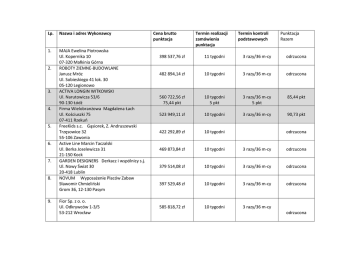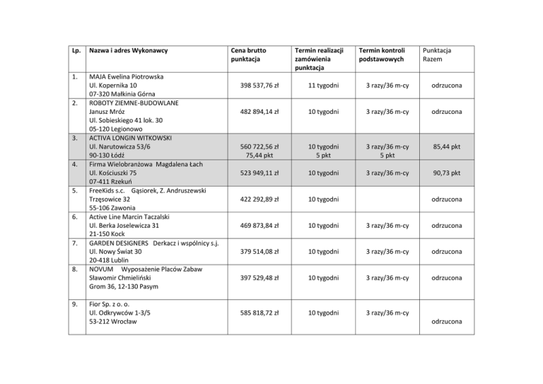 Lp. Nazwa i adres Wykonawcy 1. MAJA Ewelina Piotrowska Ul. Kopernika 10 07-320 Małkinia Górna ROBOTY ZIEMNE-BUDOWLANE Janusz Mróz Ul. Sobieskiego 41 lok. 30 05-120 Legionowo ACTIVA LONGIN WITKOWSKI Ul. Narutowicza 53/6 90-130 Łódź Firma Wielobranżowa Magdalena Łach Ul. Kościuszki 75 07-411 Rzekuń FreeKids s.c. Gąsiorek, Z. Andruszewski Trzęsowice 32 55-106 Zawonia Active Line Marcin Taczalski Ul. Berka Joselewicza 31 21-150 Kock GARDEN DESIGNERS Derkacz i wspólnicy s.j. Ul. Nowy Świat 30 20-418 Lublin NOVUM Wyposażenie Placów Zabaw Sławomir Chmieliński Grom 36, 12-130 Pasym 2. 3. 4. 5. 6. 7. 8. 9. Fior Sp. z o. o. Ul. Odkrywców 1-3/5 53-212 Wrocław Cena brutto punktacja Termin realizacji zamówienia punktacja Termin kontroli podstawowych Punktacja Razem 398 537,76 zł 11 tygodni 3 razy/36 m-cy odrzucona 482 894,14 zł 10 tygodni 3 razy/36 m-cy odrzucona 560 722,56 zł 75,44 pkt 10 tygodni 5 pkt 3 razy/36 m-cy 5 pkt 85,44 pkt 523 949,11 zł 10 tygodni 3 razy/36 m-cy 90,73 pkt 422 292,89 zł 10 tygodni 469 873,84 zł 10 tygodni 3 razy/36 m-cy odrzucona 379 514,08 zł 10 tygodni 3 razy/36 m-cy odrzucona 397 529,48 zł 10 tygodni 3 razy/36 m-cy odrzucona 585 818,72 zł 10 tygodni 3 razy/36 m-cy odrzucona odrzucona 10. 11. 12. 13. 14. DRO-MAR Marcin Dróżdż Makowiec, ul. Radomska 138 26-640 Skaryszew AG-COMPLEX Sp. z o. o. Ul. Płytowa 14 03-046 Warszawa StanBud Sp. z o. o. Ul. Przasnycka 16/55 01-756 Warszawa OSKARBUD Artur Stolarzak Ul. Skrajna 32B lok. 25 05-091 Ząbki ZIEL-BUD Wojciech Rukat Ul. Mehoffera 122 03-158 Warszawa 489 684,72 zł 86,38 pkt 10 tygodni 5 pkt 3 razy/36 m-cy 5 pkt 96,38 pkt 488 921,33 zł 10 tygodni 581 320,18 zł 72,77 pkt 10 tygodni 5 pkt 3 razy/36 m-cy 5 pkt 82,77 pkt 469 979,56 zł 90 pkt 10 tygodni 5 pkt 3 razy/36 m-cy 5 pkt 100 pkt 482 170,28 zł 87,73 pkt 10 tygodni 5 pkt 3 razy/36 m-cy 5 pkt 97,73 pkt odrzucona Burmistrz Wyszkowa Grzegorz Nowosielski