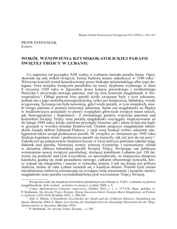 Śląskie Studia Historyczno-Teologiczne 45,2 (2012), s. 421-427 Piotr Stefaniak Kraków Wokół wznowienia Rzymskokatolickiej Parafii Świętej Trójcy w Lubaniu Co najmniej od początku XIII wieku w Lubaniu istniała parafia farna. Ogniskowała się ona wokół świątyni, której budowę miano zakończyć w 1190 roku 1. Wówczas kościół został konsekrowany przez biskupa miśnieńskiego albo jego delegata. Owa miejska świątynia parafialna na mocy dyplomu wydanego w dniu 8 stycznia 1320 roku w Zgorzelcu przez księcia jaworskiego i świdnickiego Henryka I otrzymała nowego patrona: stał się nim konwent magdalenek w Nowogrodźcu 2. Odtąd prawne losy parafii ściśle związane były z tym zakonem, jednak nie z jego siedzibą nowogrodziecką, tylko już miejscową, lubańską, wtedy erygowaną. Sytuacja nie była nowością, gdyż wiele parafii, w tym miejskich, miało swego patrona w postaci instytucji zakonnej. Same zaś magdalenki na Śląsku w średniowieczu posiadały to prawo względem głównych świątyń miast takich, jak Nowogrodziec i Szprotawa 3. Z formalnego punktu widzenia patronat nad kościołem Świętej Trójcy oraz parafią magdalenki rozciągały nieprzerwanie aż do lutego 1945 roku, kiedy zarówno przyległy klasztor, jak i sama świątynia legły w gruzach w wyniku działań frontowych. Ostatni prepozyt magdalenek lubańskich, ksiądz doktor Edmund Piekorz, z racji swej funkcji wobec zakonnic pielęgnował także urząd proboszcza parafii. W związku ze zmianami po 1945 roku funkcja kapelana sióstr i proboszcza parafii się rozeszły, tak też jest do tej pory 4. Zakończył się jednocześnie średniowieczny w swej metryce patronat zakonu magdalenek nad parafią. Niemniej siostry wnoszą wymierny i nieoceniony wkład w aktualne oblicze lubańskiej parafii Świętej Trójcy. Świętując zaś jubileusz wzniesienia nowej świątyni parafialnej, służącej katolikom Lubania już 150 lat, warto się pochylić nad tym wszystkim, co spowodowało, że miejscowa diaspora katolicka godną się stała posiadania nowego, całkiem obszernego kościoła, który wpisał się integralnie i mocno w sylwetkę miasta. I tak się dzieje już półtora stulecia, mimo że sam Lubań zmienia się z każdym dniem. Pośród tych zmian nieodmienną stałością odznaczają się trwające tutaj nieustannie i pospołu siostry magdalenki oraz parafia rzymskokatolicka pod wezwaniem Trójcy Świętej. Świątynia stała się miejskim kościołem parafialnym po lokacji w 1220 r. Lubania na prawie magdeburskim. Zob. Lubań – polubisz to miejsce, Lubań 2009, s. 9. Codex diplomaticus Lusatiae superioris, Görlitz 1821, t. 1, s. 177-178, tłum. polskie w: P. Stefaniak, Na chwałę Trójcy Świętej. Dzieje klasztoru Sióstr Świętej Marii Magdaleny od Pokuty w Lubaniu 1320-2010, Kraków 2011, s. 290-291. Zob. F. Micke, Urkundliche Geschichte der Stadt und des früheren Klosters Naumburg am Quais, Bunzlau 1844; E. Baier, Geschichte der Stadtpfarrkirche ehemalige Klosterkirche der Magdalenerinnen zu Sprottau, Breslau 1934. P. Stefaniak, Na chwałę Trójcy Świętej..., s. 185. 422 Piotr Stefaniak Czasy tuż przed odnowieniem parafii katolickiej w Lubaniu Po zmianach, które niósł ze sobą kongres wiedeński, doszło również do przeorganizowania diecezji wrocławskiej; poszerzono ją między innymi o tereny diecezji miśnieńskiej, które znalazły się w państwie pruskim 5. Wtedy też, czyli w 1821 roku, Lubań został przyłączony do wrocławskiej jednostki kościelnej. W mieście i jego najbliższej okolicy, obok wówczas przeważającego i dominującego żywiołu protestanckiego, żyli i katolicy, głównie związani na różne sposoby z klasztorem magdalenek. Zarówno katolicy, jak protestanci realizowali swoje duchowe i religijne potrzeby najpierw wspólnie, symultanicznie w starej farze pod wezwaniem Świętej Trójcy, a potem, gdy brak tolerancji konfesyjnej w XVIII wieku spowodował, że katolicy nie mogli uczęszczać do świątyni parafialnej, osobno 6. Wówczas przygarnęły ich do swego klasztornego kościółka Świętej Anny siostry magdalenki. Jak wiemy, stary kościół farny w Lubaniu spłonął w wielkim pożarze miasta 14 lipca 1760 roku 7. Pozostały po nim ruiny i tak zwana Wieża Trynitarska. Ruiny zostały rozebrane w 1879 roku 8, natomiast wieża do dziś stanowi ważny punkt architektoniczny historycznego Lubania. Po spaleniu fary funkcję kościoła parafialnego dla protestantów przejęła świątynia Świętego Krzyża, należąca do czasów reformacji do franciszkanów. Katolicy zaś gromadzili się u magdalenek w ich wewnętrznym kościele zakonnym Świętej Anny 9. Stało się zatem faktem, i to na długie lata, że diaspora katolicka w Lubaniu nie posiadała własnej świątyni. Ten brak wpisywał się w antykatolicki program rządów kolejnych władców pruskich: Fryderyka Wilhelma II (1786-1797), Fryderyka Wilhelma III (1797-1840) i Fryderyka Wilhelma IV (1840-1861), którzy sami wychowani w protestantyzmie, w tej konfesji upatrywali środka na zunifikowanie oraz germanizację ziem im podległych. Z przyczyny więc niesprzyjających czasów, gdy zarówno miejscowi protestanci, jak i władze państwowe dopuszczały się szykan wobec katolików, dążąc do marginalizacji ich obecności w Prusach, nie było możliwe, aby odbudować farę albo wznieść szybko dla nich nowy kościół. Także głęboki kryzys Kościoła partykularnego diecezji wrocławskiej nie sprzyjał oddolnym inicjatywom, mającym na celu reaktywowanie struktury parafialnej w Lubaniu. Wprawdzie istniał nadal urząd prepozyta magdalenek, który był też proboszczem parafii farnej, jednak w okresie do połowy XIX wieku jego działalność ograniczała się do posługi wobec mniszek i duszpasterzowania pośród przybywających do kościoła zakonnic katolików z miasta oraz z dóbr konwenckich. Zmiany nastąpiły dopiero u progu drugiej połowy XIX wieku, kiedy niechlubnej pamięc