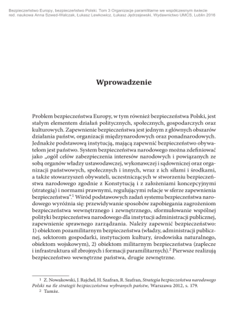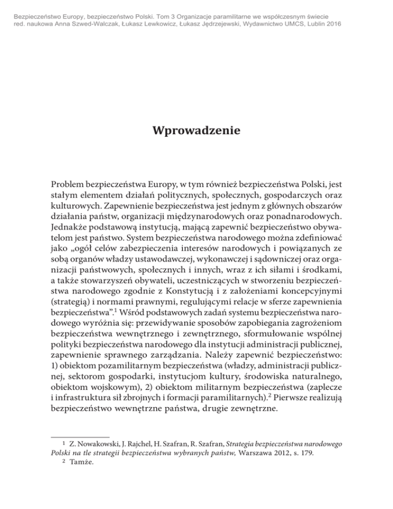 Bezpieczeństwo Europy, bezpieczeństwo Polski. Tom 3 Organizacje paramilitarne we współczesnym świecie red. naukowa Anna Szwed-Walczak, Łukasz Lewkowicz, Łukasz Jędrzejewski, Wydawnictwo UMCS, Lublin 2016 Wprowadzenie Problem bezpieczeństwa Europy, w tym również bezpieczeństwa Polski, jest stałym elementem działań politycznych, społecznych, gospodarczych oraz kulturowych. Zapewnienie bezpieczeństwa jest jednym z głównych obszarów działania państw, organizacji międzynarodowych oraz ponadnarodowych. Jednakże podstawową instytucją, mającą zapewnić bezpieczeństwo obywatelom jest państwo. System bezpieczeństwa narodowego można zdefiniować jako „ogół celów zabezpieczenia interesów narodowych i powiązanych ze sobą organów władzy ustawodawczej, wykonawczej i sądowniczej oraz organizacji państwowych, społecznych i innych, wraz z ich siłami i środkami, a także stowarzyszeń obywateli, uczestniczących w stworzeniu bezpieczeństwa narodowego zgodnie z Konstytucją i z założeniami koncepcyjnymi (strategią) i normami prawnymi, regulującymi relacje w sferze zapewnienia bezpieczeństwa”.1 Wśród podstawowych zadań systemu bezpieczeństwa narodowego wyróżnia się: przewidywanie sposobów zapobiegania zagrożeniom bezpieczeństwa wewnętrznego i zewnętrznego, sformułowanie wspólnej polityki bezpieczeństwa narodowego dla instytucji administracji publicznej, zapewnienie sprawnego zarządzania. Należy zapewnić bezpieczeństwo: 1) obiektom pozamilitarnym bezpieczeństwa (władzy, administracji publicznej, sektorom gospodarki, instytucjom kultury, środowiska naturalnego, obiektom wojskowym), 2) obiektom militarnym bezpieczeństwa (zaplecze i infrastruktura sił zbrojnych i formacji paramilitarnych).2 Pierwsze realizują bezpieczeństwo wewnętrzne państwa, drugie zewnętrzne. Z. Nowakowski, J. Rajchel, H. Szafran, R. Szafran, Strategia bezpieczeństwa narodowego Polski na tle strategii bezpieczeństwa wybranych państw, Warszawa 2012, s. 179. 2 Tamże. 1 10 Wprowadzenie Można wskazać, że rosnące zagrożenia spowodowały również oddolną organizację obywateli w celu zapewnienia bezpieczeństwa własnym rodzinom, „małym ojczyznom” oraz państwu. Aktywność organizacji pozarządowych w zakresie ochrony i obrony narodowej polega na realizacji kilku kategorii zadań: 1) lokalnej oraz regionalnej samoorganizacji bezpieczeństwa, pomocy siłom zbrojnym w czasie pokoju, kryzysu i wojny, 2) konstruowania analiz dotyczących systemu obronnego, projektów prawnych, kontroli inicjatyw proobronnych, 3) edukacji i promocji w zakresie powszechnego obowiązku obrony i ojczyzny.3 W Polsce (szczególnie w sytuacji konfliktu ukraińsko-rosyjskiego) proobronne działania obywateli zostały zauważone przez Ministerstwo Obrony Narodowej. W dniu 20 listopada 2014 r. decyzją nr 460/MON powołano Pełnomocnika Ministra Obrony Narodowej do spraw Społecznych i Inicjatyw Proobronnych. Został nim gen. dyw. w st. spocz. prof. Bogusław Pacek.4 W dniach 20–21 marca 2015 r. w Centrum Konferencyjnym MON w Warszawie zorganizowano I Ogólnopolski Kongres Organizacji Proobronnych i Klas Mundurowych. Jego efektem było powołanie 21 marca 2015 r. Federacji Organizacji Proobronnych.5 Warunkiem akcesu do organizacji Bezpieczeństwo narodowe Polski w XXI wieku: wyzwania i strategie, red. R. Jakubczak, J. Flis, Warszawa 2006, s. 376; por. A. Skrabacz, Organizacje pozarządowe w bezpieczeństwie narodowym Polski, Warszawa 2006, s. 196–199. 4 W listopadzie 2015 r. gen. Pacek został odwołany z funkcji przez nowego ministra obrony narodowej, a stanowisko zostało zlikwidowane, zob.: P. Wywiał, Organizacje proobronne w systemie bezpieczeństwa narodowego Polski, Warszawa 2016, s. 107–108. 5 Członkami założycielami Federacji Organizacji Proobronnych zostały: Związek Strzelecki „Strzelec”, Związek Strzelecki „Strzelec” im. J. Piłsudskiego, Związek Strzelecki „Strzelec” Wągrowiec, Związek Strzelecki, Stowarzyszenie Instruktorów Legia Akademicka w Lublinie oraz Stowarzyszenie FIA. FOP miała budować potencjał organizacji proobronnych w celu wsparcia systemu obronnego państwa, ułatwić organizacjom proobronnym współpracę z MON i przygotowywać rezerwy osobowe dla Narodowych Sił Zbrojnych. Za zasadne uznano również przygotowanie do lokalnego reagowania kryzysowego w przypadku zagrożeń militarnych i niemiltarnych, a także budowę komponentu Obrony Terytorialnej z zaangażowaniem jednostek paramilitarnych. Wyszczególniono również zadania FOP: 1) w czasie pokoju, 2) w czasie kryzysu o charakterze militarnym, 3) w czasie wojny. Dnia 14 listopada 2015 r. do FOP weszło 10 nowych członków: Wodne Ochotnicze Pogotowie Ratunkowe, Federacja Kawalerii Ochotniczej z Warszawy, Klub Kawaleryjski im. 12 Pułku Ułanów Podolskich, Ranger Survival Club w Gliwicach, Kwidzyńskie Stowarzyszenie Sportowo-Kolekcjonerskie „GWARD”, Fundacja Oddział Kawalerii Ochotniczej im. Pułku Czwartego Ułanów Zaniemeńskich, Stowarzyszenie im. Rycerza Okunia, Fundacja „Ars Creatori” z Warszawy oraz Stowarzyszenie Proobronne-Oświatowe „Kadet”. Liczba 3 Wprowadzenie 11 było przestrzeganie zasad: apolityczności, apartyjności, transparentności, a także działalności zgodnie z obowiązującym prawem.6 Prezesem FOP został Bogusław Pacek, który zrezygnował z funkcji w styczniu 2016 roku.7 Warto wspomnieć, że FOP nie zrzeszał wszystkich organizacji proobronych w Polsce. W Kongresie uczestniczyło ok. 120 organizacji, fundacji i stowarzyszeń deklarujących swoją działalność jako proobronną, w skład FOP weszło 16 z nich.8 Podczas Targów „Pro Defense” w dniach 2–3 czerwca 2016 r. odbył się Międzynarodowy Kongres Organizacji Proobronnych w Ostródzie, którego organizatorem było Stowarzyszenie FIA – Fideles et Instructi Arnis – Wierni w gotowości pod bronią. Wzięli w nim udział przedstawiciele „wzorcowych organizacji
