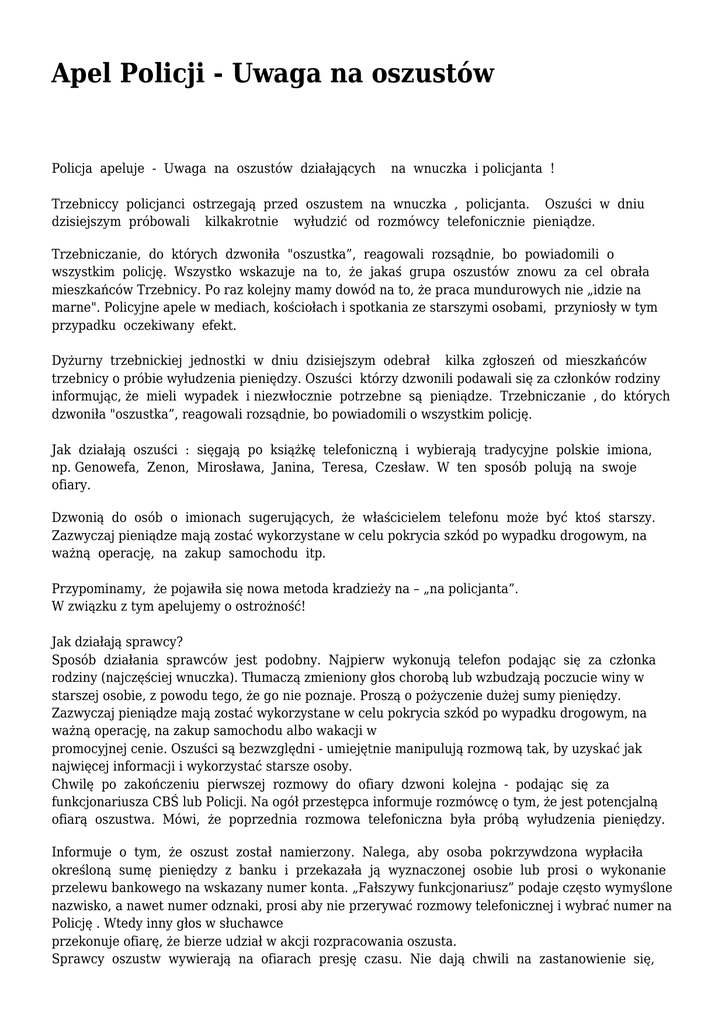 Apel Policji - Uwaga na oszustów Policja apeluje - Uwaga na oszustów działających na wnuczka i policjanta ! Trzebniccy policjanci ostrzegają przed oszustem na wnuczka , policjanta. Oszuści w dniu dzisiejszym próbowali kilkakrotnie wyłudzić od rozmówcy telefonicznie pieniądze. Trzebniczanie, do których dzwoniła "oszustka”, reagowali rozsądnie, bo powiadomili o wszystkim policję. Wszystko wskazuje na to, że jakaś grupa oszustów znowu za cel obrała mieszkańców Trzebnicy. Po raz kolejny mamy dowód na to, że praca mundurowych nie „idzie na marne". Policyjne apele w mediach, kościołach i spotkania ze starszymi osobami, przyniosły w tym przypadku oczekiwany efekt. Dyżurny trzebnickiej jednostki w dniu dzisiejszym odebrał kilka zgłoszeń od mieszkańców trzebnicy o próbie wyłudzenia pieniędzy. Oszuści którzy dzwonili podawali się za członków rodziny informując, że mieli wypadek i niezwłocznie potrzebne są pieniądze. Trzebniczanie , do których dzwoniła "oszustka”, reagowali rozsądnie, bo powiadomili o wszystkim policję. Jak działają oszuści : sięgają po książkę telefoniczną i wybierają tradycyjne polskie imiona, np. Genowefa, Zenon, Mirosława, Janina, Teresa, Czesław. W ten sposób polują na swoje ofiary. Dzwonią do osób o imionach sugerujących, że właścicielem telefonu może być ktoś starszy. Zazwyczaj pieniądze mają zostać wykorzystane w celu pokrycia szkód po wypadku drogowym, na ważną operację, na zakup samochodu itp. Przypominamy, że pojawiła się nowa metoda kradzieży na – „na policjanta”. W związku z tym apelujemy o ostrożność! Jak działają sprawcy? Sposób działania sprawców jest podobny. Najpierw wykonują telefon podając się za członka rodziny (najczęściej wnuczka). Tłumaczą zmieniony głos chorobą lub wzbudzają poczucie winy w starszej osobie, z powodu tego, że go nie poznaje. Proszą o pożyczenie dużej sumy pieniędzy. Zazwyczaj pieniądze mają zostać wykorzystane w celu pokrycia szkód po wypadku drogowym, na ważną operację, na zakup samochodu albo wakacji w promocyjnej cenie. Oszuści są bezwzględni - umiejętnie manipulują rozmową tak, by uzyskać jak najwięcej informacji i wykorzystać starsze osoby. Chwilę po zakończeniu pierwszej rozmowy do ofiary dzwoni kolejna - podając się za funkcjonariusza CBŚ lub Policji. Na ogół przestępca informuje rozmówcę o tym, że jest potencjalną ofiarą oszustwa. Mówi, że poprzednia rozmowa telefoniczna była próbą wyłudzenia pieniędzy. Informuje o tym, że oszust został namierzony. Nalega, aby osoba pokrzywdzona wypłaciła określoną sumę pieniędzy z banku i przekazała ją wyznaczonej osobie lub prosi o wykonanie przelewu bankowego na wskazany numer konta. „Fałszywy funkcjonariusz” podaje często wymyślone nazwisko, a nawet numer odznaki, prosi aby nie przerywać rozmowy telefonicznej i wybrać numer na Policję . Wtedy inny głos w słuchawce przekonuje ofiarę, że bierze udział w akcji rozpracowania oszusta. Sprawcy oszustw wywierają na ofiarach presję czasu. Nie dają chwili na zastanowienie się, czy sprawdzenie informacji o dzwoniącym. Przekonują starsze osoby, że ich pieniądze pomogą w schwytaniu przestępców. Mówią, że gotówka przechowywana na koncie nie jest bezpieczna, a oszust ma do nich łatwy dostęp. Przestępcy podając się za funkcjonariuszy, grożą konsekwencjami prawnymi, jeżeli ich rozmówca nie będzie współpracował. Tuż po przekazaniu pieniędzy kontakt się urywa, a przestępcy znikają ze wszystkimi oszczędnościami ofiary. Gdy taka osoba zadzwoni należy bezzwłocznie powiadomić telefonicznie dyżurnego jednostki Policji na numer 997 Pamiętaj ! 1. Nigdy nie przekazuj pieniędzy nieznajomym. 2. Zawsze potwierdzaj „prośbę o pomoc” dzwoniąc do kogoś z rodziny. 3. W razie jakichkolwiek podejrzeń natychmiast powiadom Policję dzwoniąc na numery alarmowe 997 lub 112. Zwracamy się z apelem do wszystkich mieszkańców o zachowanie czujności . Rozmawiajmy z naszymi rodzicami , dziadkami o tym że są osoby które mogą chcieć ich oszukać. źródło: www.policja.pl Oficer Prasowy KPP w Trzebnicy asp. sztab Iwona Mazur Gmina Rytwiany - www.rytwiany.com.pl