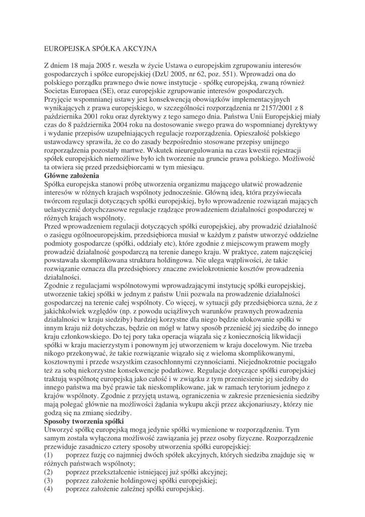 EUROPEJSKA SPÓŁKA AKCYJNA Z dniem 18 maja 2005 r. weszła w ycie Ustawa o europejskim zgrupowaniu interesów gospodarczych i spółce europejskiej (DzU 2005, nr 62, poz. 551). Wprowadzi ona do polskiego porz dku prawnego dwie nowe instytucje - spółk europejsk , zwan równie Societas Europaea (SE), oraz europejskie zgrupowanie interesów gospodarczych. Przyj cie wspomnianej ustawy jest konsekwencj obowi zków implementacyjnych wynikaj cych z prawa europejskiego, w szczególno ci rozporz dzenia nr 2157/2001 z 8 pa dziernika 2001 roku oraz dyrektywy z tego samego dnia. Pa stwa Unii Europejskiej miały czas do 8 pa dziernika 2004 roku na dostosowanie swego prawa do wspomnianej dyrektywy i wydanie przepisów uzupełniaj cych regulacje rozporz dzenia. Opieszało polskiego ustawodawcy sprawiła, e co do zasady bezpo rednio stosowane przepisy unijnego rozporz dzenia pozostały martwe. Wskutek nieuregulowania na czas kwestii rejestracji spółek europejskich niemo liwe było ich tworzenie na gruncie prawa polskiego. Mo liwo ta otwiera si przed przedsi biorcami w tym miesi cu. Główne zało enia Spółka europejska stanowi prób utworzenia organizmu maj cego ułatwi prowadzenie interesów w ró nych krajach wspólnoty jednocze nie. Główn ide , która przy wiecała twórcom regulacji dotycz cych spółki europejskiej, było wprowadzenie rozwi za maj cych uelastyczni dotychczasowe regulacje rz dz ce prowadzeniem działalno ci gospodarczej w ró nych krajach wspólnoty. Przed wprowadzeniem regulacji dotycz cych spółki europejskiej, aby prowadzi działalno o zasi gu ogólnoeuropejskim, przedsi biorca musiał w ka dym z pa stw utworzy oddzielne podmioty gospodarcze (spółki, oddziały etc), które zgodnie z miejscowym prawem mogły prowadzi działalno gospodarcz na terenie danego kraju. W praktyce, zatem najcz ciej powstawała skomplikowana struktura holdingowa. Nie ulega w tpliwo ci, e takie rozwi zanie oznacza dla przedsi biorcy znaczne zwielokrotnienie kosztów prowadzenia działalno ci. Zgodnie z regulacjami wspólnotowymi wprowadzaj cymi instytucj spółki europejskiej, utworzenie takiej spółki w jednym z pa stw Unii pozwala na prowadzenie działalno ci gospodarczej na terenie całej wspólnoty. Co wi cej, w sytuacji gdy przedsi biorca uzna, e z jakichkolwiek wzgl dów (np. z powodu uci liwych warunków prawnych prowadzenia działalno ci w kraju siedziby) bardziej korzystne dla niego b dzie ulokowanie spółki w innym kraju ni dotychczas, b dzie on mógł w łatwy sposób przenie jej siedzib do innego kraju członkowskiego. Do tej pory taka operacja wi zała si z konieczno ci likwidacji spółki w kraju macierzystym i ponownym jej utworzeniem w kraju docelowym. Nie trzeba nikogo przekonywa , e takie rozwi zanie wi zało si z wieloma skomplikowanymi, kosztownymi i przede wszystkim czasochłonnymi czynno ciami. Niejednokrotnie poci gało te za sob niekorzystne konsekwencje podatkowe. Regulacje dotycz ce spółki europejskiej traktuj wspólnot europejsk jako cało i w zwi zku z tym przeniesienie jej siedziby do innego pa stwa ma by prawie tak nieskomplikowane, jak w ramach terytorium jednego z krajów wspólnoty. Zgodnie z przyj t ustaw , ograniczenia w zakresie przeniesienia siedziby maj polega głównie na mo liwo ci dania wykupu akcji przez akcjonariuszy, którzy nie godz si na zmian siedziby. Sposoby tworzenia spółki Utworzy spółk europejsk mog jedynie spółki wymienione w rozporz dzeniu. Tym samym została wył czona mo liwo zawi zania jej przez osoby fizyczne. Rozporz dzenie przewiduje zasadniczo cztery sposoby utworzenia spółki europejskiej: (1) poprzez fuzj co najmniej dwóch spółek akcyjnych, których siedziba znajduje si w ró nych pa stwach wspólnoty; (2) poprzez przekształcenie istniej cej ju spółki akcyjnej; (3) poprzez zało enie holdingowej spółki europejskiej; (4) poprzez zało enie zale nej spółki europejskiej. W dwóch ostatnich przypadkach dopuszczalny jest udział, obok spółek akcyjnych, m.in. tak e spółek z ograniczon odpowiedzialno ci . Nale y podkre li , e zawsze musi by zachowana zasada, e podmioty tworz ce SE podlegaj , co najmniej dwóm ró nym porz dkom prawnym, przy czym w wypadku, gdy spółk europejsk zawi zuj , obok spółki-matki, m.in. spółki zale ne lub oddziały z siedzib w innym pa stwie członkowskim ni spółka-matka, wymagane jest, by taka spółka zale na lub oddział istniały, co najmniej dwa lata. Ponadto, w gestii pa stw członkowskich pozostała mo liwo przyznania prawa tworzenia spółek europejskich spółkom, których główny zarz d znajduje si poza terytorium wspólnoty. Takie spółki mog uczestniczy w zawi zaniu spółki akcyjnej z zastrze eniem ł cznego spełnienia nast puj cych warunków: (i) spółka została utworzona zgodnie z prawem jednego z pa stw członkowskich; (ii) ma statutow siedzib w jednym z pa stw członkowskich oraz (iii) istnieje rzeczywisty i stały zwi zek z ekonomi pa stwa członkowskiego. Struktura wewn trzna Kapitał zakładowy spółki ma wynosi , co najmniej 120 000 euro. Spółka europejska uzyskuje osobowo prawn z chwil dokonania rejestracji w stosownym rejestrze - w Polsce b dzie to rejestr przedsi biorców w ramach Krajowego Rejestru S dowego. Z ciekawszych rozwi za mo na wskaza , e spółka europejska daje wspólnikom prawo wyboru pomi dzy dualistycznym modelem administracji (rada nadzorcza i zarz d) a modelem monistycznym z jednym organem administruj cym (rada administruj ca). Nale y wskaza równie , e ustawa szczegółowo okre la reguły przenoszenia statutowej siedziby spółki europejskiej. Zapisy ustawy maj zapewni przestrzeganie wynikaj cej z rozporz dzenia zasady, e siedziba statutowa spółki i jej główny zarz d musz by ulokowane w tym samym pa stwie członkowskim. Ustawa przewiduje liczne rodki egzekwuj ce przestrzeganie omawianej zasady, m.in. mo liwo nało enia grzywny przez s d rejestrowy lub te ustanowienie kuratora w celu przywrócenia zgodno ci siedziby statutowej i g