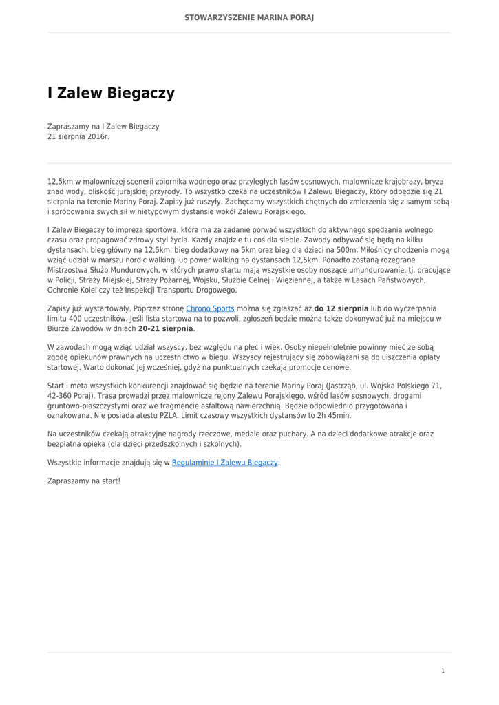 STOWARZYSZENIE MARINA PORAJ I Zalew Biegaczy Zapraszamy na I Zalew Biegaczy 21 sierpnia 2016r. 12,5km w malowniczej scenerii zbiornika wodnego oraz przyległych lasów sosnowych, malownicze krajobrazy, bryza znad wody, bliskość jurajskiej przyrody. To wszystko czeka na uczestników I Zalewu Biegaczy, który odbędzie się 21 sierpnia na terenie Mariny Poraj. Zapisy już ruszyły. Zachęcamy wszystkich chętnych do zmierzenia się z samym sobą i spróbowania swych sił w nietypowym dystansie wokół Zalewu Porajskiego. I Zalew Biegaczy to impreza sportowa, która ma za zadanie porwać wszystkich do aktywnego spędzania wolnego czasu oraz propagować zdrowy styl życia. Każdy znajdzie tu coś dla siebie. Zawody odbywać się będą na kilku dystansach: bieg główny na 12,5km, bieg dodatkowy na 5km oraz bieg dla dzieci na 500m. Miłośnicy chodzenia mogą wziąć udział w marszu nordic walking lub power walking na dystansach 12,5km. Ponadto zostaną rozegrane Mistrzostwa Służb Mundurowych, w których prawo startu mają wszystkie osoby noszące umundurowanie, tj. pracujące w Policji, Straży Miejskiej, Straży Pożarnej, Wojsku, Służbie Celnej i Więziennej, a także w Lasach Państwowych, Ochronie Kolei czy też Inspekcji Transportu Drogowego. Zapisy już wystartowały. Poprzez stronę Chrono Sports można się zgłaszać aż do 12 sierpnia lub do wyczerpania limitu 400 uczestników. Jeśli lista startowa na to pozwoli, zgłoszeń będzie można także dokonywać już na miejscu w Biurze Zawodów w dniach 20-21 sierpnia. W zawodach mogą wziąć udział wszyscy, bez względu na płeć i wiek. Osoby niepełnoletnie powinny mieć ze sobą zgodę opiekunów prawnych na uczestnictwo w biegu. Wszyscy rejestrujący się zobowiązani są do uiszczenia opłaty startowej. Warto dokonać jej wcześniej, gdyż na punktualnych czekają promocje cenowe. Start i meta wszystkich konkurencji znajdować się będzie na terenie Mariny Poraj (Jastrząb, ul. Wojska Polskiego 71, 42-360 Poraj). Trasa prowadzi przez malownicze rejony Zalewu Porajskiego, wśród lasów sosnowych, drogami gruntowo-piaszczystymi oraz we fragmencie asfaltową nawierzchnią. Będzie odpowiednio przygotowana i oznakowana. Nie posiada atestu PZLA. Limit czasowy wszystkich dystansów to 2h 45min. Na uczestników czekają atrakcyjne nagrody rzeczowe, medale oraz puchary. A na dzieci dodatkowe atrakcje oraz bezpłatna opieka (dla dzieci przedszkolnych i szkolnych). Wszystkie informacje znajdują się w Regulaminie I Zalewu Biegaczy. Zapraszamy na start! 1