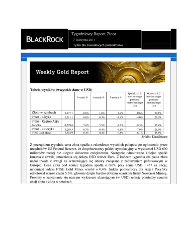 Tygodniowy Raport Złota 7 kwietnia 2011 Tylko dla zawodowych pośredników Tabela wyników (wszystkie dane w USD) 1-week % Złoto w sztabach FTGM – Afryka FTGM – Region Azji i Pacyfiku FTGM – Ameryka FTSE Gold Mines 1-month % 3-month % Spadek z 12miesięcznego poziomu maksymalnego (%) Wzrost z 12miesięcznego poziomu minimalnego (%) 1,437.1 -0.6% 1.6% 1.4% -0.6% 29.1% 3,511.1 0.8% 0.3% -1.9% -4.0% 26.0% 18,529.6 5.6% 5.5% -2.2% -8.5% 57.4% 3,203.5 3,814.9 -0.7% 0.4% -0.4% 0.4% -4.6% -3.8% -7.9% -6.1% 26.9% 28.8% Źródło: DataStream Z początkiem tygodnia cena złota spadła z rekordowo wysokich pułapów po ogłoszeniu przez urzędników US Federal Reserve, że dotychczasowy pakiet stymulacyjny w wysokości USD 600 miliardów raczej nie ulegnie dalszemu zwiększeniu. Następnie odnotowano kolejne spadki kruszca z chwilą umocnienia się dolara USD wobec Euro. Z końcem tygodnia zła passa złota nadal trwała z uwagi na wznawiające się obawy związane z zadłużeniem państwowym w Europie. Cena złota pod koniec tygodnia spadła o 0,6% przy cenie USD 1 437 za uncję, natomiast indeks FTSE Gold Mines wzrósł o 0,4%. Indeks pomocniczy dla Azji i Pacyfiku odnotował wzrost rzędu 5.6%, głównie dzięki bardzo dobrym wynikom firmy Newcrest Mining. Prosimy o zapoznanie się naszym wykresem ukazującym (w USD) relację pomiędzy cenami akcji złota a złota w sztabach. W odniesieniu do rynku akcji, firma Newcrest Mining and Harmony gościła analityków przebywających z wizytą w Wafi-Golpu, przedsięwzięciu wydobywczym miedzi i złota w Papui-Nowej Gwinei. Złoże, z geologicznego punktu widzenia bardzo podobne do ogromnych kopalni Grasberg i Oyu Tolgoi, przekształca się w światowej klasy składnik majątkowy o znaczącym potencjale zwiększenia zasobów. Gatunki również przedstawiają się bardzo dobrze na tle innych złóż porfirowych, przy czym jedynie Grasberg i Oyu Tolgoi posiadają wyższe gatunki równowartości złota. Obecnie prowadzone jest studium wykonalności, przy czym rozpoczęcie produkcji oczekiwane jest na rok 2017. Rynek pozytywnie zareagował na wieści z kopalni , windując akcje Newcrest o 6% w przeciągu tygodnia. Reakcje na wizyty analityków w Tasiast w Mauretanii oraz w Chirano w Ghanie również odniosły pozytywny wydźwięk. Przedsięwzięcie w Tasiast jest szczególnie interesujące i potencjalnie może stac się kopalnia o światowym znaczeniu. Prognoza Aktualne fundamentalne czynniki kształtujące rynek złota sprzyjają wyższym cenom. Popyt inwestycyjny stanowił do chwili obecnej zasadniczą siłę napędową hossy, natomiast kluczowe czynniki napędzające ten popyt – tzn. obawy o sytuację na światowych rynkach finansowych, zadłużenie w strefie Euro oraz inflacja – prawdopodobnie utrzymają się w najbliższej przyszłości. Potencjał dalszych zakupów netto przez banki centralne również mogą sprzyjać cenom. Co się tyczy rynku akcji związanego ze złotem, to sądzimy, że zarobki wzrosną wraz ze zwyżką cen złota, co z kolei zachęci inwestorów do powrotu do tego sektora. Zasadniczym zagrożeniem dla rynku złota jest wzrost realnych stóp procentowych. Przy wzroście realnych stóp procentowych, koszt związany z posiadaniem złota zachęci inwestorów do sprzedaży kruszca. Zespól ds. Zasobów Naturalnych Blackrock © 2011 BlackRock, Inc. All rights reserved. 7 Kwietnia 2011 Niniejszy materiał jest przeznaczony wyłącznie do dystrybucji wsród zawodowych pośredników. Żadne inne osoby nie powinny sie nim posługiwać ani na nim polegać. BGF jest towarzystwem funduszy inwestycyjnych otwartych z siedzibą w Luksemburgu działającym na podstawie art. 264 Ustawy o Usługach i Rynkach Finansowych z 2000r (Financial Services and Markets Act). Subskrypcje sa ważne jedynie jeśli zostały dokonane na podstawie bieżącego Prospektu, ostatnich raportów finansowych oraz Uproszczonego Prospektu, dostępnych na naszej stronie internetowej. Część oferty subfunduszy BGF posiada akcje klasy A, które są zgodne z wymaganiami niezbędnymi do uzyskania statusu Dystrybutora w Wielkiej Brytanii. W celu uzyskania dalszych informacji prosimy o skontaktowanie sie z Państwa Menedżerem. Wahania mogą zaznaczyć sie szczególnie w przypadku Funduszu o wyższej niestabilności, zaś wartość inwestycji moze spaść w sposób nagły i znaczny. Inwestorzy winni zapoznać sie z ryzykami właściwymi dla konkretnego funduszu opisanymi w Uproszczonym Prospekcie. Wyniki historyczne nie są gwarancją osiagnięcia podobnych wyników w przyszłości. Wartość inwestycji oraz osiąganego z nich dochodu nie jest gwarantowana i może zarówno rosnać, jak i spadać. Zmiany kursów walut mogą powodować spadek lub wzrost wartości inwestycji. Inwestor moze nie odzyskac zainwestowanej kwoty. Jednostki BGF nie są sprzedawane podmiotom z USA. Jednostki BGF nie są oferowane do sprzedaży ani sprzedawane w USA ani też na obszarze terytoriów lub posiadłości USA. Informacje dotyczace produktów BGF nie powinny byc publikowane w USA. Jednostki funduszy są dostępne do sprzedaży tylko w pewnych jurysdykcjach. Nazwa BlackRock i logo sa znakami firmowymi i są używane za pozwoleniem BlackRock & Co. Inc. Wydano przez BlackRock Investment Management (UK) Limited (firmę zarejestrowaną i nadzorowaną przez Władze Finansowe (Financial Services Authority). Adres firmy: 33 King William Street, London, EC4R 9AS. Numer rejestru w Anglii: 2020394. Wydano w Szwajcarii przez oddział BlackRock Investment Management (UK), Limited Oddział w Zurychu, Dreikönigstrasse 31a, 8002 Zurych, gdzie można bezpłatnie uzyskać Prospekt firmy, Uproszczony Prospekt, Statut, Raport Roczny oraz Raport Pólroczny. Agentem platniczym w Szwajcarii jest JPMorgan Chase Bank, National Association, Columbus, Oddział w Zurychu, Szwajcaria. Dla Państwa bezpieczenstwa rozmowy telefoniczne bedą zazwyczaj nagrywane. W celu dystrybucji w Polsce, BGF został zarejestrowa
