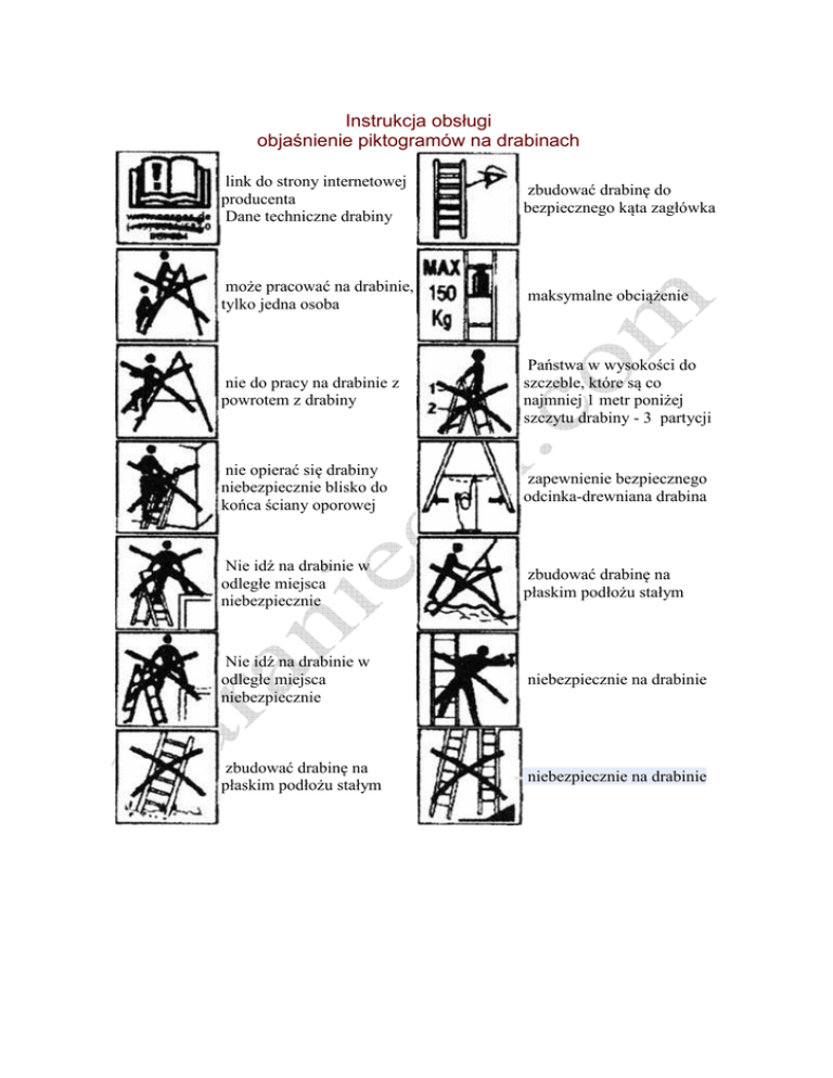 Instrukcja obsługi objaśnienie piktogramów na drabinach link do strony internetowej producenta Dane techniczne drabiny zbudować drabinę do bezpiecznego kąta zagłówka może pracować na drabinie, tylko jedna osoba maksymalne obciążenie nie do pracy na drabinie z powrotem z drabiny Państwa w wysokości do szczeble, które są co najmniej 1 metr poniżej szczytu drabiny - 3 partycji nie opierać się drabiny niebezpiecznie blisko do końca ściany oporowej zapewnienie bezpiecznego odcinka-drewniana drabina Nie idź na drabinie w odległe miejsca niebezpiecznie zbudować drabinę na płaskim podłożu stałym Nie idź na drabinie w odległe miejsca niebezpiecznie niebezpiecznie na drabinie zbudować drabinę na płaskim podłożu stałym niebezpiecznie na drabinie