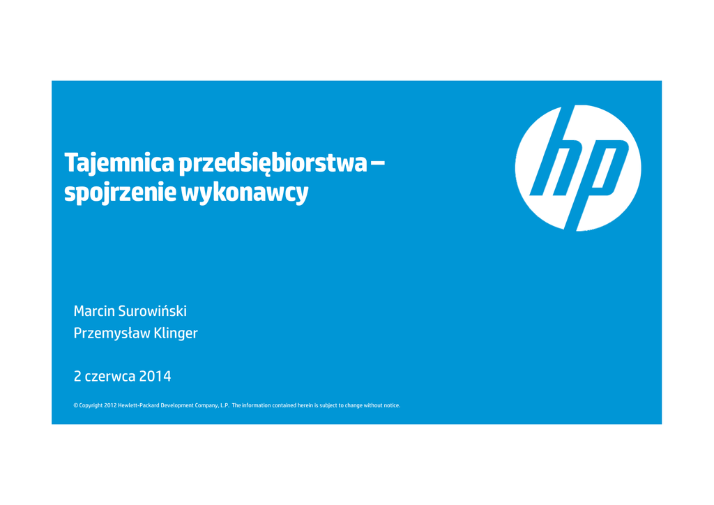 Tajemnica przedsiębiorstwa – spojrzenie wykonawcy Marcin Surowiński Przemysław Klinger 2 czerwca 2014 © Copyright 2012 Hewlett-Packard Development Company, L.P. The information contained herein is subject to change without notice. Rola tajemnicy przedsiębiorstwa w zamówieniu publicznym Narzędzie ochrony słusznych praw wykonawcy 2 Sposób utrudniania dostępu do informacji w ramach vs. zamówień publicznych © Copyright 2012 Hewlett-Packard Development Company, L.P. The information contained herein is subject to change without notice. Praktyka wykonawców Zastrzeżenie całości dokumentu Zastrzegane dokumenty vs. Zastrzeżenie elementów dokumentu 3 © Copyright 2012 Hewlett-Packard Development Company, L.P. The information contained herein is subject to change without notice. Automatyczne zastrzeganie dokumentów Praktyka zamawiających Żądanie wyjaśnień Brak pogłębionej analizy uzyskanych wyjaśnień 4 © Copyright 2012 Hewlett-Packard Development Company, L.P. The information contained herein is subject to change without notice. Przykłady aktualnego orzecznictwa KIO Wykaz dostaw i usług Wykaz osób Wyjaśnienia z art. 90 ust. 1 pzp Zobowiązania osób trzecich Opis rozwiązania 5 © Copyright 2012 Hewlett-Packard Development Company, L.P. The information contained herein is subject to change without notice. Opinia bankowa/polisa ubezpieczeniowa Wykaz dostaw KIO 264/14, KIO 344/14 „Zdaniem składu orzekającego Izby informacje ujęte w ofercie wykonawcy Antinus w wykazach dostaw i osób mogą stanowić tajemnicę przedsiębiorstwa. (…) Z wykazu dostaw wynika, że podmiot ubiegający się o zamówienie publiczne przedstawił dostawy zrealizowane na rzecz osób fizycznych, których dane osobowe objęte są ochroną odrębnych ustaw. Co za tym idzie, również dokumenty dołączone do przedmiotowego wykazu wystawione przez wymienione osoby fizyczne podlegają ochronie.” KIO 1707/13 - 24 lipca 2013 r. „Izba ustaliła w tym względzie, że część wykazu i referencje objęte tajemnicą przedsiębiorstwa dotyczą usług wykonywanych na rzecz podmiotu prywatnego, poza reżimem ustawy. Zdaniem Izby informacje tam zawarte posiadają walor tajemnicy przedsiębiorstwa. (…) żaden przepis ustawy nie statuuje powinności zamawiającego dokonania badania zastrzeżenia informacji jako tajemnicy przedsiębiorstwa, zatem ewentualne zaniechania zamawiającego w tej mierze nie mogą prowadzić do uwzględnienia zarzutu w sytuacji, gdy dokonanie zastrzeżenia odpowiada prawu.” 6 © Copyright 2012 Hewlett-Packard Development Company, L.P. The information contained herein is subject to change without notice. Wykaz osób KIO 245/14 „Izba uznała, że informacje zawarte w wykazie osób, które będą uczestniczyć w realizacji zamówienia mają dla wykonawcy istotne znaczenie gospodarcze. Ujawnienie takich informacji jak dane osobowe, wykształcenie, doświadczenie czy zdobyte uprawnienia, a także forma współpracy z wykonawcą, mogą ułatwić dotarcie konkurencji do poszczególnych osób, a w konsekwencji nawet wpłynąć na pozycje wykonawcy na rynku.” KIO 264/14, 344/14 „W przypadku wykazu osób, uznano, że zawarte w tym wykazie informacje niewątpliwie mogą mieć dla wykonawcy wartość gospodarczą, a więc uprawniony był on do objęta tych informacji klauzulą tajemnicy przedsiębiorstwa.” 7 © Copyright 2012 Hewlett-Packard Development Company, L.P. The information contained herein is subject to change without notice. Wyjaśnienia z art. 90 ust. 1 pzp KIO 2216/13, KIO 2221/13 - 7 października 2013 r. „Izba nie podzieliła poglądu Zamawiającego, że informacje zastrzeżone przez Comparex posiadają wartość gospodarcza. Przeciwnie, z doświadczenia posiadanego przez skład orzekający w sprawach o zbliżonym stanie faktycznym wynika, że informacje takie jak, podane przez Comparex są zazwyczaj jawne w postepowaniu o udzielenie zamówienia. (…) W wyjaśnieniach ceny oferty wykonawca nie podał wysokości marży. Informacja o posłużeniu się przy ewentualnym wykonaniu umowy przez Comparex zasobami posiadanymi w magazynie była przedmiotem rozważań na jawnej rozprawie.” KIO 2253/13 - 17 stycznia 2014 r. „Izba stwierdziła, że jej zdaniem w większości [wyjaśnienia] nie zawierają informacji organizacyjnych mających wartość gospodarczą, charakterystycznych tylko dla tego przedsiębiorcy. W wyjaśnieniach tych bowiem wykonawca wskazywał na ogólne czynniki ekonomiczne i zasady prowadzenia przedsiębiorstwa oraz minimalizacji kosztów znane każdemu ekonomiście czy przedsiębiorcy. (…) Niektóre obliczenia, np. zużycie soli drogowej, jak wskazał wykonawca, odnoszą się do norm przyjętych w stosownych rozporządzeniach, zatem tu również trudno mówić o informacjach mających charakter tajemnicy przedsiębiorstwa.” 8 © Copyright 2012 Hewlett-Packard Development Company, L.P. The information contained herein is subject to change without notice. Zobowiązania osób trzecich KIO 245/14 „Izba stwierdziła też, że wypracowane kontakty, nazwy partnerów handlowych, warunki zawartych porozumień, które wynikają z zobowiązań podmiotów trzecich posiadają wartość gospodarczą. Ich poufność może mieć znaczenie z punktu widzenia konkurencyjności wykonawcy.” KIO 382/14 „Izba po szczegółowym zapoznaniu się z wyjaśnieniami uznała, że niewątpliwie wartość gospodarczą posiadają takie informacje jak kierowane do przystępującego oferty cenowe dostawców materiałów, obejmujące stawki materiałów, czy te dane dostawcy materiałów, z którym wykonawca współpracuje.” „Zasada jawności postępowania nie może być interpretowana w ten sposób, że każdy wykonawca ma prawo żądania wejścia w posiadanie informacji odnośnie źródeł zaopatrzenia, zasad rządzących współpracą innego wykonawcy z dostawcami materiałów czy podwykonawcami, w sytuacji gdy na daną pozycję rynkową dany podmiot często pra