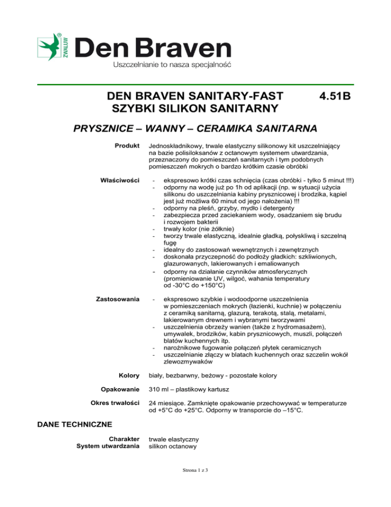 DEN BRAVEN SANITARY-FAST SZYBKI SILIKON SANITARNY 4.51B PRYSZNICE – WANNY – CERAMIKA SANITARNA Produkt Właściwości Jednoskładnikowy, trwale elastyczny silikonowy kit uszczelniający na bazie polisiloksanów z octanowym systemem utwardzania, przeznaczony do pomieszczeń sanitarnych i tym podobnych pomieszczeń mokrych o bardzo krótkim czasie obróbki - - - Zastosowania - - - Kolory Opakowanie Okres trwałości ekspresowo krótki czas schnięcia (czas obróbki - tylko 5 minut !!!) odporny na wodę już po 1h od aplikacji (np. w sytuacji użycia silikonu do uszczelniania kabiny prysznicowej i brodzika, kąpiel jest już możliwa 60 minut od jego nałożenia) !!! odporny na pleśń, grzyby, mydło i detergenty zabezpiecza przed zaciekaniem wody, osadzaniem się brudu i rozwojem bakterii trwały kolor (nie żółknie) tworzy trwale elastyczną, idealnie gładką, połyskliwą i szczelną fugę idealny do zastosowań wewnętrznych i zewnętrznych doskonała przyczepność do podłoży gładkich: szkliwionych, glazurowanych, lakierowanych i emaliowanych odporny na działanie czynników atmosferycznych (promieniowanie UV, wilgoć, wahania temperatury od -30°C do +150°C) ekspresowo szybkie i wodoodporne uszczelnienia w pomieszczeniach mokrych (łazienki, kuchnie) w połączeniu z ceramiką sanitarną, glazurą, terakotą, stalą, metalami, lakierowanym drewnem i wybranymi tworzywami uszczelnienia obrzeży wanien (także z hydromasażem), umywalek, brodzików, kabin prysznicowych, muszli, połączeń blatów kuchennych itp. narożnikowe fugowanie połączeń płytek ceramicznych uszczelnianie złączy w blatach kuchennych oraz szczelin wokół zlewozmywaków biały, bezbarwny, beżowy - pozostałe kolory 310 ml – plastikowy kartusz 24 miesiące. Zamknięte opakowanie przechowywać w temperaturze od +5°C do +25°C. Odporny w transporcie do –15°C. DANE TECHNICZNE Charakter System utwardzania trwale elastyczny silikon octanowy Strona 1 z 3 DEN BRAVEN SANITARY-FAST – SZYBKI SILIKON SANITARNY, 4.51B Ciężar właściwy Szybkość wyciskania Kożuszenie Ściekanie Dopuszczalne odkształcenia Czas utwardzania Twardość Shore A Odporność termiczna po utwardzeniu Moduł 100% Maksymalna odporność na rozciąganie Maksymalne wydłużenie przy zerwaniu Możliwość naprawy Możliwość malowania 1,02 g/ml 100 g/min (3 mm / 6,3 bar) 5 minut (przy 23°C i 55% wilgotności względnej) wg normy ISO 7390: < 2 mm ± 25% 2-3 mm dziennie (przy 23°C i 55% wilgotności względnej) wg normy DIN 53505: 29° od –30°C do +150°C wg normy DIN 53504: 0,6 MPa wg normy DIN 53504: 1,6 MPa wg normy DIN 53504: 400% tym samym materiałem nie PODŁOŻA Rodzaje powierzchni Przygotowanie Stan podłoża szkło, glazura, ceramika sanitarna, porcelana, powierzchnie emaliowane, panele poliestrowe i epoksydowe, polistyren, stal nierdzewna, aluminium anodowane, impregnowane drewno, powłoki malarskie, poliakryl, PCW i tym podobne podłoża Jeżeli resztki zaprawy klejowej lub zaprawy do fugowania pozostały na powierzchni płytek, przed przystąpieniem do nakładania silikonu należy je wpierw usunąć. Usunąć z podłoża tłuszcze, brud i inne zabrudzenia. Podłoża silnie porowate i chłonne (np. podłoża betonowe lub gipsowe) zaleca się wstępnie zagruntować dostępnymi gruntami przeznaczonymi pod kity silikonowe. Dla zapewnienia optymalnej przyczepności, do podłoży mineralnych ogólnie zaleca się stosować kity silikonowe neutralne chemicznie, np. Den Braven Silicone-NAF lub kity na bazie MS Polimeru, np. Den Braven Uni-Fix. Przed użyciem na podłożach z tworzyw sztucznych lub powłokach malarskich zaleca się przeprowadzić test przyczepności. Powierzchnia czysta, sucha, dokładnie i starannie odtłuszczona, wolna od kurzu i tym podobnych zanieczyszczeń ROZMIARY SPOIN Minimalna szerokość 4 mm Maksymalna szerokość 25 mm Maksymalna głębokość 14 mm Zalecane proporcje Szerokość w mm: 4-8 10-12 14-16 18-20 22-24 Głębokość w mm: 6 8 10 12 14 W celu uzyskania żądanej głębokości spoiny i nie dopuszczenia do trzy punktowego styku, stosować profile dylatacyjne. SPOSÓB UŻYCIA Narzędzia Temperatura otoczenia Pistolety ręczne lub pneumatyczne od +5°C do +40°C Strona 2 z 3 DEN BRAVEN SANITARY-FAST – SZYBKI SILIKON SANITARNY, 4.51B Zalecenia Zdjąć nakrętkę, naciąć końcówkę tuby, ponownie nałożyć nakrętkę i naciąć ją pod kątem na szerokości odpowiadającej wielkości spoiny. Fugę wygładzić szpachelką maczaną w wodzie z niewielką domieszka mydła w ciągu 5 minut od nałożenia kitu. Dobrym środkiem pomocniczym jest Den Braven Finisher - profesjonalny środek do wygładzania fug na mokro. Fuga powinna mieć kształt pozwalający na swobodne ściekanie wody. Czyszczenie Do czyszczenia rąk, narzędzi czy powierzchni zaleca się użyć specjalne ściereczki czyszczące Den Braven Bravo. Ewentualnie do mycia narzędzi po zakończeniu pracy można stosować terpentynę, benzynę ekstrakcyjną lub środek Den Braven MEK Cleaner. Do mycia rąk można także użyć środek Den Braven Handfris. Utwardzony silikon można usunąć przy pomocy środka Den Braven Sili-Kill. Ograniczenia Nie stosować do połączeń z teflonem, PP, PE. Neopren i bitum mogą spowodować plamienie. Nie stosować do marmuru, ołowiu, cynku, miedzi, żelaza i przyklejania luster. Do akwariów stosować Den Braven Aqua-Silicone. Bezpieczeństwo ogólne Patrz: Karta charakterystyki 4.51B UWAGA: Chronić przed dziećmi. Odpowiedzialność: Podane informacje są wynikiem badań i doświadczeń Den Braven Sealants, co jest podstawą ich rzetelności i wiarygodności. Producent nie mógł przewidzieć jednak wszystkich możliwości zastosowania swoich produktów, a ponieważ sposób użycia produktów jest całkowicie poza jego kontrolą, użytkownik bierze na siebie odpowiedzialność za właściwy wybór i zastosowanie produktu. Producent nie bierze na siebie odpowiedzialności za występujące u