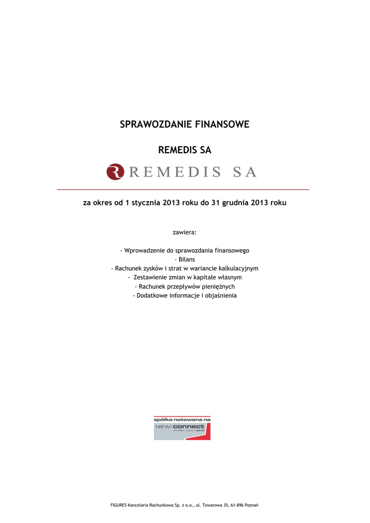 SPRAWOZDANIE FINANSOWE REMEDIS SA za okres od 1 stycznia 2013 roku do 31 grudnia 2013 roku zawiera: - Wprowadzenie do sprawozdania finansowego - Bilans -‐ Rachunek zysków i strat w wariancie kalkulacyjnym -‐ Zestawienie zmian w kapitale własnym -‐ Rachunek przepływów pieniężnych -‐ Dodatkowe informacje i objaśnienia FIGURES Kancelaria Rachunkowa Sp. z o.o., ul. Towarowa 35, 61-‐896 Poznań Sprawozdanie finansowe REMEDIS SA sporządzone na dzień 31 grudnia 2013 roku w złotych polskich A. WPROWADZENIE DO SPRAWOZDANIA FINANSOWEGO 1. DANE JEDNOSTKI Nazwa: Remedis SA (dalej: "Spółka" lub "Jednostka") Forma prawna: spółka akcyjna Siedziba: Petera Mansfelda 4 60-‐855 Poznań Kraj rejestracji: Polska Podstawowy przedmiot działalności: Spółka prowadzi działalność pod numerem PKD 64.99.Z. Należy do niej: 1) działalność holdingów finansowych (PKD 64.20.Z), 2) działalność trustów, funduszów i podobnych instytucji finansowych (64.30.Z), 3) pozostała finansowa działalność usługowa gdzie indziej niesklasyfikowana, z wyłączeniem ubezpieczeń i funduszy emerytalnych (PKD 64.99.Z). 4) pozostałe doradztwo w zakresie prowadzenia działalności gospodarczej i zarządzania 5) pozostała działalność profesjonalna, naukowa i techniczna, gdzie indziej niesklasyfikowana 6) działalność wspomagająca edukację Organ prowadzący rejestr: Sąd Rejonowy Poznań – Nowe Miasto i Wilda, Wydział VIII Gospodarczy Krajowego Rejestru Sądowego Numer rejestru: KRS 0000270485 Numer statystyczny REGON: 300464078 Czas trwania działalności Jednostki jest nieograniczony. Niniejsze sprawozdanie finansowe zawiera dane za okres od 1 stycznia 2013 roku do 31 grudnia 2013 roku oraz dane porównawcze za okres od 1 stycznia 2012 roku do 31 grudnia 2012 roku dla rachunku zysków i strat, rachunku przepływów pieniężnych i sprawozdania ze zmian w kapitale własnym, dla bilansu dane prezentowane są według stanu na dzień 31 grudnia 2013 roku oraz według stanu na dzień 31 grudnia 2012 roku. Dnia 13 grudnia 2013 roku Zarząd Spółki podjął uchwałę nr 03/12/2013 o zmianie siedziby Spółki począwszy od dnia 1 stycznia 2014 roku. Zmiana została zarejestrowana dnia 28 stycznia 2014 roku. Dnia 27 lutego 2013 roku odbyło się posiedzenie Rady Nadzorczej Spółki na którym podjęto uchwałę nr 1 w związku z pozytywnym zaopiniowaniem planu połączenia ze spółką Inwest Consulting SA oraz dalszymi planami rozwoju. Dnia 1 marca 2013 roku odbyło się Walne Zgromadzenie, na którym podjęto decyzję o połączeniu Spółki Remedis SA ze spółką Inwest Consulting SA. Decyzja o połączeniu została zgłoszona do KRS dnia 6 marca 2013 roku. Połączenie zostało zarejstrowane dnia 11 kwietnia 2013 roku. W celu realizacji połączenia na mocy uchwały nr 4 podwyższony został kapitał podstawowy w drodze emisji 24.173.436 akcji zwykłych na okaziciela serii E o wartości nominalnej 0,10 PLN. Kapital podstawowy wzrósł o 2.417.343,60 PLN to jest do kwoty 6.330.010,20 PLN. Nowo wyemitowane akcje zostały przydzielone jedynemu akcjonariuszowi spółki przejmowanej tj. INC SA. (dawniej Investcon Group SA) w stosunku 1:0,967. Poniżej przedstawione zostały szczegółowe warunki połączenia i jego rozliczenie: Podwyższenie kapitału podstawowego w spółce Remedis Ilość akcji nowej emisji cena nominalna akcji kurs akcji z dnia rejestracji połączenia tj. 11.04.2013 24 173 436 0,10 0,18 Kapitał podstawowy (nowa emisja) 2 417 343,60 Zwiększenie kapitału wg wartości akcji z dnia 11.04.2013 4 351 218,48 Kapitał zapasowy wynikający z podwyższenia kapitału po kursie akcji z dnia 11.04.2013 1 933 874,88 FIGURES Kancelaria Rachunkowa Sp. z o.o., ul. Towarowa 35, 61-‐896 Poznań 2 z 23 Sprawozdanie finansowe REMEDIS SA sporządzone na dzień 31 grudnia 2013 roku w złotych polskich Cena przejęcia Ilość akcji nowej emisji 24 173 436 kurs akcji z dnia rejestracji połączenia tj. 11.04.2013 0,18 Cena rynkowa 4 351 218,48 Płatność za akcje w formie gotówki 156,40 Koszty połączenia (koszty planu, ogłoszenia i badania połączenia) 5 450,32 Cena przejęcia 4 356 825,20 Dane bilansowe spółki przejmowanej Inwest Consulting S.A. Wartość na dzień 11.04.2013 Wyłączenia zgodnie z UoR art. 44b ust. 4 pkt. 8 Skorygowana wartość na dzień 11.04.2013 Aktywa 2 439 111,20 -2 342 511,00 96 600,20 Kapitał 2 438 876,20 0,00 2 438 876,20 Zobowiązania 235,00 0,00 235,00 Aktywa netto 2 438 876,20 -2 342 511,00 96 365,20 Ustalenie wartości firmy Cena przejęcia Wartość godziwa aktywów netto spółki przejmowanej Wartość firmy 4 356 825,20 96 365,20 4 260 460,00 W związku z połączeniem spółek i powstaniem wartości firmy Zarząd Spółki uważa, iż pozytywne efekty połączenia będą widoczne w okresie dłuższym niż 5 lat. Ponadto, jeżeli Spółka przyjmie 5 letni okres amortyzacji, wówczas kwota amortyzacji może w istotny sposób zaburzyć wynik brutto Spółki. Dlatego też Zarząd podjął decyzję o dokonywaniu odpisów amortyzacyjnych wartości firmy metodą liniową przez okres 20 lat od jej powstania. 2. ZAŁOŻENIE KONTYNUACJI DZIAŁALNOŚCI GOSPODARCZEJ Sprawozdanie finansowe zostało sporządzone przy założeniu kontynuowania działalności gospodarczej przez Jednostkę w dającej się przewidzieć przyszłości. Nie są nam znane okoliczności, które wskazywałyby na zagrożenie kontynuowania działalności. 3. PODSTAWA SPORZĄDZENIA SPRAWOZDANIA FINANSOWEGO Spółka sporządza sprawozdanie finansowe zgodnie z ustawą o rachunkowości (dalej: "ustawa"). Niniejsze sprawozdanie finansowe Spółki podlegało obowiązkowemu badaniu przez biegłego rewidenta, na podstawie art. 64 ust 1 ustawy. Do badania sprawozdania finansowego wybrana została firma CGS-‐Audytor Spółka z o.o. 4. PRZYJĘTE ZASADY (POLITYKA) RACHUNKOWOŚCI Środki trwałe i wartości niematerialne i prawne wycenia się według ceny nabycia lub kosztu wytworzenia, pomniejszonych
