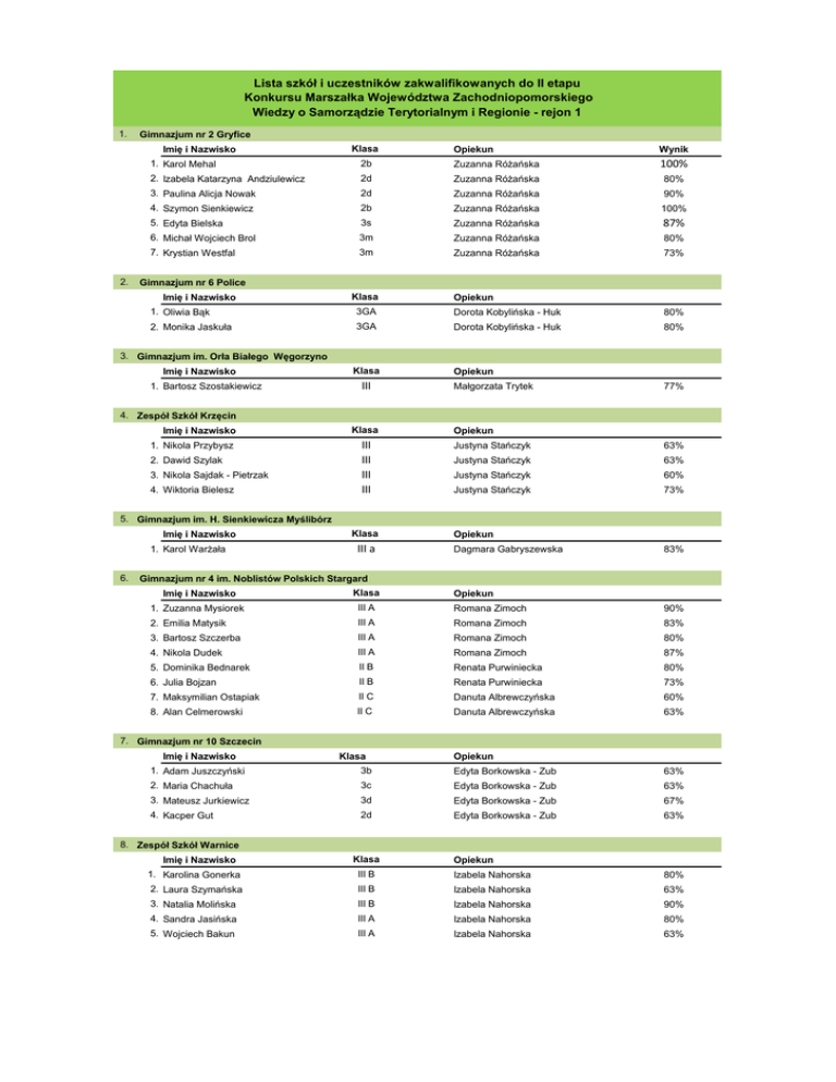 Lista szkół i uczestników zakwalifikowanych do II etapu Konkursu Marszałka Województwa Zachodniopomorskiego Wiedzy o Samorządzie Terytorialnym i Regionie - rejon 1 1. Gimnazjum nr 2 Gryfice Imię i Nazwisko 2. Klasa Opiekun Wynik 1. Karol Mehal 2b Zuzanna Różańska 100% 2. Izabela Katarzyna Andziulewicz 2d Zuzanna Różańska 80% 3. Paulina Alicja Nowak 2d Zuzanna Różańska 90% 4. Szymon Sienkiewicz 2b Zuzanna Różańska 100% 5. Edyta Bielska 3s Zuzanna Różańska 87% 6. Michał Wojciech Brol 3m Zuzanna Różańska 80% 7. Krystian Westfal 3m Zuzanna Różańska 73% Gimnazjum nr 6 Police Imię i Nazwisko Klasa Opiekun 1. Oliwia Bąk 3GA Dorota Kobylińska - Huk 80% 2. Monika Jaskuła 3GA Dorota Kobylińska - Huk 80% 3. Gimnazjum im. Orła Białego Węgorzyno Imię i Nazwisko 1. Bartosz Szostakiewicz Klasa III Opiekun Małgorzata Trytek 77% 4. Zespół Szkół Krzęcin Imię i Nazwisko 1. Nikola Przybysz 2. Dawid Szylak 3. Nikola Sajdak - Pietrzak 4. Wiktoria Bielesz Klasa III III III III Opiekun Justyna Stańczyk 63% Justyna Stańczyk 63% Justyna Stańczyk 60% Justyna Stańczyk 73% 5. Gimnazjum im. H. Sienkiewicza Myślibórz Imię i Nazwisko 1. Karol Warżała 6. Klasa III a Opiekun Dagmara Gabryszewska 83% Gimnazjum nr 4 im. Noblistów Polskich Stargard Imię i Nazwisko Klasa 1. Zuzanna Mysiorek III A Romana Zimoch 90% 2. Emilia Matysik III A Romana Zimoch 83% 3. Bartosz Szczerba III A Romana Zimoch 80% 4. Nikola Dudek III A Romana Zimoch 87% 5. Dominika Bednarek II B Renata Purwiniecka 80% 6. Julia Bojzan II B Renata Purwiniecka 73% 7. Maksymilian Ostapiak II C Danuta Albrewczyńska 60% 8. Alan Celmerowski II C Danuta Albrewczyńska 63% Opiekun 7. Gimnazjum nr 10 Szczecin Imię i Nazwisko Klasa Opiekun 1. Adam Juszczyński 3b Edyta Borkowska - Zub 63% 2. Maria Chachuła 3c Edyta Borkowska - Zub 63% 3. Mateusz Jurkiewicz 3d Edyta Borkowska - Zub 67% 4. Kacper Gut 2d Edyta Borkowska - Zub 63% 8. Zespół Szkół Warnice Imię i Nazwisko Klasa Opiekun 1. Karolina Gonerka III B Izabela Nahorska 80% 2. Laura Szymańska III B Izabela Nahorska 63% 3. Natalia Molińska III B Izabela Nahorska 90% 4. Sandra Jasińska III A Izabela Nahorska 80% 5. Wojciech Bakun III A Izabela Nahorska 63% 9. Katolickie Gimnazjum im. św. Stanisława Kostki Szczecin Imię i Nazwisko Klasa Opiekun 1. Patrycja Głoćko 3a Beata Florczak 87% 2. Hanna Kaźmierczak 3a Beata Florczak 63% 3. Zuzana Wojownik 3a Beata Florczak 63% 4. Laura Mazur 3b Beata Florczak 63% 10. Gimnazjum Publiczne im. A. Fiedlera Dębno Imię i Nazwisko 1. Maja Zarzycka Klasa 3e Opiekun Beata Dziadul 80% 11. Gimnazjum nr 1 Stargard Imię i Nazwisko Klasa Opiekun 1. Agata Mroczkowska II Iwona Zielińska 60% 2. Marcel Szkuciak III Iwona Zielińska 67% 3. Paweł Wilk III Iwona Zielińska 60% 4. Mateusz Wawrzyniak III Iwona Zielińska 70% 5. Jakub Chrul III Iwona Zielińska 63% 6. Jakub Dziakowicz III Iwona Zielińska 63% 12. Gimnazjum nr 42 Szczecin Imię i Nazwisko Klasa 1. Matylda Godlewska 2gb Urszula Suwaj 63% 2. Mateusz Kowalczyk 2gb Urszula Suwaj 60% 3. Wojciech Mazurkiewicz 3gb Urszula Suwaj 93% 4. Cezary Orłowski 3gb Urszula Suwaj 90% 5. Weronika Jaszek 2gb Urszula Suwaj 63% 6. Lidia Zombirt 3gb Urszula Suwaj 63% 7. Julia Zamęcka 3gb Urszula Suwaj 83% 8. Marcelina Wajdziak 3gb Urszula Suwaj 63% 9. Urszula Marczak 3gb Urszula Suwaj 63% 10. Maksymilian Maron 2ga Urszula Suwaj 63% 11. Natalia Bulikowska 2ga Urszula Suwaj 67% 12. Julia Orłowska 2gc Urszula Suwaj 70% 13. Jakub Snop 3gb Urszula Suwaj 90% 14. Wardak Joanna 2ga Urszula Suwaj 60% Opiekun 13. Gimnazjum nr 2 z Oddziałami Mistrzostwa Sportowego Stargard Imię i Nazwisko Klasa Opiekun 1. Wojciech Szulkowski III b Elżbieta Siwa 87% 2. Szymon Dębiński III a Elżbieta Siwa 90% 14. Gimnazjum nr 12 im. Stanisława Lema Szczecin Imię i Nazwisko Klasa 1. Alicja Jeziorowska 2e Małgorzata Walinowska 100% 2. Andrzej Bednarz 3e Małgorzata Walinowska 66% 3. Mateusz Balbuza 3d Małgorzata Walinowska 66% 4. Jakub Strzelczyk 3d Małgorzata Walinowska 60% Opiekun 15. Gimnazjum nr 1 Nowogard Imię i Nazwisko 1. Jakub Niemczyn Klasa 3a Opiekun Arkadiusz Piórkowski 60% 16. Gimnazjum nr 46 Szczecin Imię i Nazwisko Klasa Opiekun 1. Anna Padiasek 3a Halina Durajczyk 87% 2. Jakub Boruch 3a Halina Durajczyk 83% 3. Damian Kolenda 3b Halina Durajczyk 67% 4. Mateusz Błachowiak 3b Halina Durajczyk 83% 5. Adrian Olkowski 3b Halina Durajczyk 80% 17. Gimnazjum Publiczne im. Noblistów Polskich Przybiernów Imię i Nazwisko Klasa Opiekun 1. Daria Romanus III a Małgorzata Łuczak 60% 2. Jakub Gębicz III a Małgorzata Łuczak 73% 3. Kacper Kazanowski III a Małgorzata Łuczak 66% 18. Gimnazjum Publiczne Wolin Imię i Nazwisko Klasa 1. Jan Mieleszkiewicz III Radosław Kaliciuk 83% 2. Michał Jagiełowicz I Radosław Kaliciuk 76% 3. Natalia Pożoga III Radosław Kaliciuk 73% Opiekun 19. Gimnazjum nr 3 Stargard Imię i Nazwisko Klasa Opiekun 1. Katarzyna Rytwińska 3a Małgorzata Dębińska 63% 2. Agnieszka Czerniak 3f Małgorzata Dębińska 83% 3. Jakub Kowalski 3f Małgorzata Dębińska 80% 4. Dominika Słaba 3f Małgorzata Dębińska 90% 20. Gimnazjum im. Jana Pawła II Chociwel Imię i Nazwisko Klasa Opiekun 1. Paulina Kmet III A Teresa Słowik 60% 2. Wiktoria Chełstowska III A Teresa Słowik 83% 3. Justyna Kowalczyk III B Teresa Słowik 87% 4. Adam Chałupnik III B Teresa Słowik 67% 5. Oliwia Jakubowska III C Teresa Słowik 70% 6. Maciej Kusz II B Teresa Słowik 87% 7. Weronika Adamiak II A Teresa Słowik 60% 21. Gimnazjum im. Polskich Olimpijczyków Kliniska Wielkie Imię i Nazwisko Klasa Opiekun 1. Dominika Mikuś III A Mirosława Saczuk 63% 2. Katarzyna Obolik III B Mirosława Saczuk 70% 3. Paweł Połomski III B Mirosława Saczuk 73% 4. Piotr Wróbel III B Mirosława Saczuk 77% 22. Gimnazjum im. Noblistów Polskich Stara Dąbrowa Imię i Nazwisko Klasa Opiekun 1. Artur Jaremba III b Tomasz Urbański 63% 2. Bartosz Pałka III b Tomasz Urbański 66% 23. Gimnazjum Towarzystwa Salezjańskie