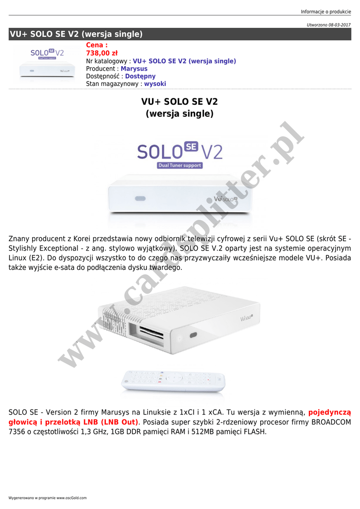 Informacje o produkcie Utworzono 08-03-2017 VU+ SOLO SE V2 (wersja single) Cena : 738,00 zł Nr katalogowy : VU+ SOLO SE V2 (wersja single) Producent : Marysus Dostępność : Dostępny Stan magazynowy : wysoki sp lit te r .p l VU+ SOLO SE V2 (wersja single) w w w .c ar d Znany producent z Korei przedstawia nowy odbiornik telewizji cyfrowej z serii Vu+ SOLO SE (skrót SE Stylishly Exceptional - z ang. stylowo wyjątkowy). SOLO SE V.2 oparty jest na systemie operacyjnym Linux (E2). Do dyspozycji wszystko to do czego nas przyzwyczaiły wcześniejsze modele VU+. Posiada także wyjście e-sata do podłączenia dysku twardego. SOLO SE - Version 2 firmy Marusys na Linuksie z 1xCI i 1 xCA. Tu wersja z wymienną, pojedynczą głowicą i przelotką LNB (LNB Out). Posiada super szybki 2-rdzeniowy procesor firmy BROADCOM 7356 o częstotliwości 1,3 GHz, 1GB DDR pamięci RAM i 512MB pamięci FLASH. Wygenerowano w programie www.oscGold.com Specyfikacja: ● ● ● ● ● ● ● ● ● ● ● ● ● ● ● ● ● w w ● .p l ● sp lit te r ● ar d ● Wydajny, szybki procesor 7356 Broadcom Dual Core 1300 MHz Open-Source Linux System (zgodne z Enigma2) 1 GB pamięci RAM 512 MB Flash Obsługa PIP HD 1 x wymienna pojedyncza głowica DVB-S2 z LNB Out MPEG2/ H.264 Hardware decoding 1 x CI (Common Interface Slot) 1 x Smartcard-Reader (Conax) - po przeprogramowaniu wielosystemowy Sieciowe gniazdo ethernet 10/100 2 x USB 2.0 1 x e-SATA (zewnętrzny) wyjście HDMI 1.4 1 x wyjście cinch Video i L/R audio 1 x S/PDIF (wyjście optyczne) EPG (electronic program guide) Plugin Support (JPEG, MP3, XVID...) nieograniczona ilość kanałów i list ulubionych menu OSD, obsługa Skinów Videotext DiSEqC 1.0/1.1/1.2, USALS Parametry Video: w .c ● ● - Video resolution CCIR 601 (720 x 576 lines), 576p, 720p, 1080i - Video decoding MPEG-2, MPEG-4 compatible - Input data rate 2-45 MSymb/s - S/N 53 dB Parametry Audio: - Decoding AC 3, MPEG-4 (AAC-HE), MPEG-1, Layer 1, 2 and 3 - Sampling rate 32/44.1/48 kHz - S/N 65 dB ● Zasilanie: - 100-240 V - 50-60 Hz - Zewnętrzny zasilacz 12 V (3,5A) ● Pobór mocy: - 13W (w czasie pracy) - 0,7W (głębokie czuwanie) Informacje o produkcie ● ● ● ● Wymiary: 211 x 40 x 185 mm Masa: 2 kg Gwarancja: 24 miesiące Kolor: biały w w w .c ar d sp lit te r .p l Uwaga! W przypadku większości modułów CI nie ma możliwości nagrywania dwóch kodowanych kanałów jednocześnie, z uwagi na ograniczenia samych modułów (np. Cyfrowego Polsatu). Wygenerowano w programie www.oscGold.com
