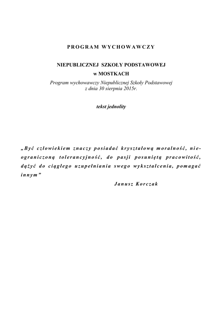 PROGRAM WYCHOWAWCZY NIEPUBLICZNEJ SZKOŁY PODSTAWOWEJ w MOSTKACH Program wychowawczy Niepublicznej Szkoły Podstawowej z dnia 30 sierpnia 2015r. tekst jednolity „Być człowiekiem znaczy posiadać kryształową moralność, ni eograniczoną tolerancyjność, do pasji posuniętą pracowitość, dążyć do ciągłego uzupełniania swego wykształcenia, pomagać innym” Janusz Korczak 2 1. DEKALOG DLA RODZICÓW I WYCHOWAWCÓW Nie upokarzaj dziecka, bo ono tak jak ty ma silne poczucie własnej godności. Staraj się nie stosować takich metod, których sam w dzieciństwie nie akceptowałeś. Pozwalaj dziecku dokonywać wyboru najczęściej jak możesz. Jeżeli zachowałeś się wobec dziecka niewłaściwie, przeproś je i wytłumacz się. Nie bój się utraty autorytetu, dziecko i tak wie kiedy popełniasz błędy. Nigdy nie mów źle o dziecku, w szczególności w obecności innych osób. Nie mów „zrobisz to, bo ja tak chcę”, jeżeli musisz czegoś zabronić zawsze to uzasadnij. Jeśli wydajesz polecenia dziecku, staraj się nie stać nad nim i mówić „z góry swego autorytetu”. Gdy nie wiesz jak postąpić, pomyśl jak ty poczułbyś się będąc dzieckiem. Staraj się być czasem adwokatem dziecka. „Konwencja o prawach dziecka” przyjęta przez Zgromadzenie Ogólne ONZ w dniu 20 listopada 1989 roku. 3 2. „SZKOŁA DLA TWOJEGO DZIECKA” W naszej szkole pracujemy nad tym aby dzieci były twórcze, otwarte, pogodne, tolerancyjne. Umożliwiamy im zdobycie wiedzy i umiejętności, dzięki którym poznają świat, odnajdując w nim własne miejsce. Staramy się rozbudzić w naszych wychowankach uczucia patriotyczne, uświadamiać przynależność regionalną, lokalną i europejską. Szanujemy prawa dziecka, jednocześnie ucząc odpowiedzialności i poszanowania drugiego człowieka. Jesteśmy przeciwni przemocy i agresji. Chcemy ustrzec młodego człowieka przed niebezpieczeństwami współczesnego świata. Wspieramy rozwój osobowości każdego ucznia, a w przypadku niepowodzeń oferujemy fachową pomoc wychowawców i logopedy. Każdy uczeń ma możliwość korzystania z księgozbioru biblioteki szkolnej, nauki języków obcych, udziału w kołach zainteresowań. Zapewniamy przyjazne, bezpieczne i korzystne dla zdrowia uczniów warunki edukacji. Osiągamy to dzięki dobrej bazie lokalowej, jednozmianowości zajęć lekcyjnych, estetycznemu wyglądowi wnętrza budynku szkoły. Gwarantujemy dzieciom opiekę w świetlicy szkolnej, proponujemy też spożywanie posiłków. Stwarzamy dobre warunki do rozwoju: intelektualnego, osobowościowego oraz fizycznego każdego ucznia. Rodziców traktujemy jako pełnoprawnych członków naszej społeczności, wspomagających pracę wychowawczą i współtworzących wizerunek naszej szkoły. 4 3. ABSOLWENT NASZEJ SZKOŁY Pragniemy, aby uczeń kończący Niepubliczną Szkołę Podstawową w Mostkach posiadł wiedzę i umiejętności potrzebne mu do kontynuowania z sukcesem dalszej edukacji. Chcemy, aby posiadał kompetencje społeczne pozwalające dobrze funkcjonować wśród rówieśników i dorosłych, mierzyć się z trudnymi wyzwaniami współczesnego świata. Mamy nadzieję, że absolwent naszej szkoły będzie opierał swoje postępowanie na spójnym i mocnym systemie wartości. DEKALOG ABSOLWENTA NIEPUBLICZNEJ SZKOŁY PODSTAWOWEJ W MOSTKACH 1. Jestem życzliwy i tolerancyjny, okazuję szacunek innym ludziom. 2. Jestem wrażliwy na potrzeby drugiego człowieka. Reaguję, gdy komuś dzieje się krzywda. Nie jestem obojętny na przejawy dyskryminacji. 3. Jestem aktywny społecznie. Pomagam potrzebującym. Uczestniczę w akcjach charytatywnych. 4. Jestem odpowiedzialny za siebie i innych. Rówieśnicy i dorośli mogą na mnie liczyć. 5. Rozwijam swoje talenty i zainteresowania, potrafię samodzielnie zdobywać wiedzę, jestem ciekawy świata. 6. Charakteryzuje mnie wysoka kultura osobista i kieruję się w życiu pozytywnymi wartościami. 7. Jestem ambitny, pomysłowy, twórczy i pracowity. Jestem zwolennikiem zdrowego trybu życia. 8. Myślę o sobie dobrze – jestem otwarty na świat i ludzi. Charakteryzuje mnie umiejętność nawiązywania kontaktów interpersonalnych, umiem współpracować w grupie 9. Nie poddaję się przeciwnościom – umiem sobie radzić w sytuacjach trudnych. 5 4. PODSTAWA PRAWNA PROGRAMU WYCHOWAWCZEGO - Ustawa z dnia 7 września 1991r. o systemie oświaty w nauczaniu i wychowaniu z pózn. zm wraz z aktami niższego rzędu, tj. rozporządzeniami MEN - Powszechna Deklaracja Praw Człowieka z 10 grudnia 1948 r. - Europejska Konwencja o Ochronie Praw Człowieka i Podstawowych Wolności z 4 listopada 1950 r. - Deklaracja Praw Dziecka z 1959 r. - Konwencja o Prawach Dziecka Narodów Zjednoczonych z 20 listopada 1989 r. - Konstytucja Rzeczypospolitej Polskiej z 1997 r. (art. 48, 53, 70) - Ustawa z 26.01.1982 r. Karta Nauczyciela (art. 6) - Program Polityki Prorodzinnej Państwa z 17.11.1998 r. - Rozporządzenie MEN z 15.02.1999 r. w sprawie ramowego statutu szkoły publicznej (§ 2.1, § 2.2) - Rozporządzenie MEN z 15.02.1999 r. w sprawie podstawy programowej kształcenia ogólnego - Ramowy Statut szkoły - Podstawa Programowa kształcenia ogólnego. 5. PROMOWANE WARTOŚCI Szkoła za podstawę przyjmuje uniwersalne zasady etyki. Kształtuje umiłowanie mądrości, piękna, dobra. Wspiera kształtowanie takich wartości jak przyjaźń, szacunek. Kształcenie i wychowanie służy rozwijaniu u młodzieży poczucia odpowiedzialności, miłości ojczyzny oraz poszanowania dla polskiego dziedzictwa kulturowego, przy jednoczesnym otwarciu się na wartości kultur Europy i świata. Szkoła wspiera rozwój poczucia wspólnotowości i równości, ale zauważa też i promuje indywidualność każdego dziecka. Szkoła realizuje zadania opiekuńcze, wychowawcze i dydaktyczne uwzględniając poziom rozwoju psycho-fizycznego ucznia i jego sytuację rodzinną. 6 6. ZAŁOŻENIA OGÓLNE Szkoła umożliwia: zdobycie wykształcenia na p