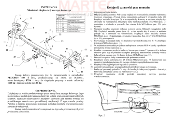 INSTRUKCJA MontaŜu i eksploatacji zaczepu kulowego 11 5 12 7 17 17 Kolejność czynności przy montaŜu 1. 2. Oznaczenie zacisku wg ISO PN 1 L 2 + 3 31 4 R 5 58R 6 54 7 58L Łączenie przewodów Kierunkowskazy lewe Tylne światła przeciwmgłowe Masa Kierunkowskazy prawe Światła pozycyjne prawe Światła hamowania Światła pozycyjne lewe 22 23 11 1 9 3 14 11 13 12 6 11 25 10 2 24 4 8 11 Zaczep kulowy przeznaczony jest do zamontowania w samochodzie PEUGEOT 407 4 drz., produkowanego od 2004r. do 08.2008r., numer katalogowy F29A i słuŜy do ciągnięcia przyczep o masie całkowitej 1600 kg i nacisku na kulę max 65 kg. Zdemontować tylne światła Odkręcić czaszę zderzaka. Pod czaszą znajduje się wzmocnienie zderzaka wykonane z tworzywa sztucznego. Z lewej strony wzmocnienia odkręcić 4 oryginalne śruby M8. PrzyłoŜyć nakładkę lewą (poz. 5) w ten sposób aby 4 otwory w nakładce pokryły się z otworami we wzmocnieniu. Przykręcić luźno nakładkę śrubami M8x50mm (poz. 13) pamiętając o włoŜeniu w pozostałe dwa otwory śrub M12x40mm (poz. 11), patrz rysunek. 3. Następnie podobne czynności wykonać z prawej strony. Odkręcić 4 oryginalne śruby M8. PrzyłoŜyć nakładkę prawą (poz. 4) w ten sposób aby 4 otwory w nakładce pokryły się z otworami we wzmocnieniu. Przykręcić luźno nakładkę śrubami M8x50mm (poz. 13) pamiętając o włoŜeniu w pozostałe dwa otwory śrub M12x40mm (poz. 11), patrz rysunek. 4. Na wystające z nakładek śruby M12 nałoŜyć wsporniki boczne poz. 8 i 9 i przykręcić je śrubami M12x40mm (poz. 11). 5. W podłuŜnicach odszukać po jednym zaślepionym otworze M10 w kaŜdej z podłuŜnic (zewnętrzna strona) i udroŜnić je. 6. Zgodnie z rysunkiem przyłoŜyć uchwyty boczne poz. 6 oraz 7 i przykręcić je śrubami M10x40 (poz. 12) do podłuŜnic następnie pomiędzy zamontowane elementy wsunąć belkę główną zaczepu poz. 1 i skręcić śrubami M12x40mm (poz. 11). 7. Dokręcić wszystkie śruby z momentem jak pokazano w tabeli. 8. Przykręcić korpus automatu poz. 24 śrubami M12x25mm poz. 10. Zamocować kulę zgodnie z instrukcją dołączaną do zaczepu z końcówką szybkodemontowalną. 9. Przykręcić blachę pod gniazdo zgodnie z rysunkiem. 10. Zamontować zderzak po usunięciu elementu przedstawionego na rysunku 2. 11. Podłączyć przewody gniazdka 7- bieg. do instalacji elektrycznej zgodnie z instrukcją fabryczną samochodu (zaleca się wykonanie w ASO) 12. Uzupełnić ewentualne ubytki powłoki malarskiej zaczepu powstałe w trakcie montaŜu. OD PRODUCENTA Dziękujemy za wybór produkowanego przez naszą firmę zaczepu kulowego. Jego niezawodność została potwierdzona licznymi testami oraz opiniami zadowolonych klientów. JednakŜe niezawodność zaczepów kulowych jest zaleŜna równieŜ od prawidłowego montaŜu oraz prawidłowej eksploatacji. Z tego powodu prosimy Państwa o staranne przeczytanie niniejszej instrukcji montaŜu oraz przestrzeganie zawartych wskazówek. Zaczep naleŜy zamontować w miejscach do tego celu przeznaczonych przez producenta samochodu. USUNAĆ Rys. 2 PPUH AUTO-HAK Sp.J. WyposaŜenie zaczepu: Produkcja Zaczepów Kulowych Henryk & Zbigniew Nejman 76-200 SŁUPSK ul. Słoneczna 16K tel/fax (059) 8-414-414; 8-414-413 E-mail: [email protected] www. autohak.com.pl Zaczep kulowy bez wyposaŜenia elektrycznego F29A Klasa: A50-X Nr kat. Przeznaczony do zamontowania w samochodzie: Producent: PEUGEOT Model: 407 Typ: 4 drz. produkowanego od 2004r. do 08.2008r. Dane techniczne: Wartość siły D : 9,1 kN maksymalna masa przyczepy: 1600 kg maksymalny nacisk na kulę: 65 kg Numer homologacji zgodnie z wytycznymi regulaminu EKG/ONZ 55.01: E20 55R-01 1607 KARTA GWARANCYJNA Producent udziela gwarancji niniejszą kartą gwarancyjną na okres 24 miesięcy licząc od dnia zakupu zaczepu kulowego do samochodu: PEUGEOT 407 4 drz. produkowanego od 2004r. do 08.2008r. Data produkcji .............................. Data zakupu........................................... Zakres gwarancji obejmuje wyłącznie wady jakościowe wynikające z winy producenta. Gwarancja nie obejmuje natomiast uszkodzeń zawinionych przez nabywcę, wynikających z niewłaściwego montaŜu, uŜytkowania lub konserwacji, uszkodzeń mechanicznych, normalnego zuŜycia podczas eksploatacji itp. Reklamacje naleŜy zgłaszać w punkcie sprzedaŜy, składając jednocześnie kartę gwarancyjną. Usunięcie "wady" następuje po stwierdzeniu przez punkt sprzedaŜy wspólnie z producentem słuszności złoŜonej reklamacji. Reklamacja powinna być załatwiona w ciągu czternastu dni od dnia uznania reklamacji. Karta gwarancyjna jest niewaŜna jeŜeli nie jest wypełniona i podpisana. Data zgłoszenia reklamacji: ................................................................... Zalecany moment skręcający dla śrub i nakrętek 8,8: M6 - 11 Nm M8 - 25 Nm M10 - 50 Nm M12 - 87 Nm M14 - 138 Nm M16 - 210 Nm INFORMACJA WSTĘPNA Zaczep kulowy jest skonstruowany zgodnie z zasadami bezpieczeństwa ruchu drogowego. Zaczep kulowy jest elementem wpływającym na bezpieczeństwo jazdy i moŜe zostać zainstalowany wyłącznie przez personel wyspecjalizowany. Niedopuszczalne jest dokonywanie jakichkolwiek zmian w konstrukcji zaczepu. Powoduje to wygaśniecie dopuszczenia do stosowania. W przypadku obecności masy izolacyjnej lub osłony podwozia w miejscu przylegania zaczepu, naleŜy ją usunąć. Nieosłonięte miejsca karoserii oraz wywiercone otwory naleŜy pomalować farbą antykorozyjną. Informacjami wiąŜącymi odnośnie wartości obciąŜeń są dane podawane przez producenta samochodu, względnie wartości maksymalnej masy przyczepy oraz maksymalnego nacisku na kulę, przy czym wartości parametrów zaczepu kulowego nie mogą być przekroczone. Wzór do obliczania wartości siły D: Maks. masa przyczepy [kg] x Maks. masa samochodu [kg] Maks. masa przyczepy [kg] + Maks. masa samochodu [kg] X 9,81 = 1000 D [kN]